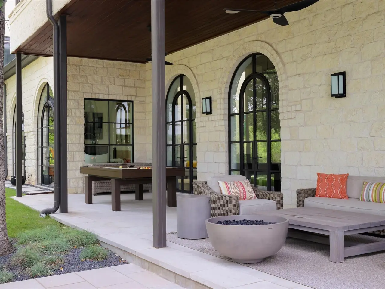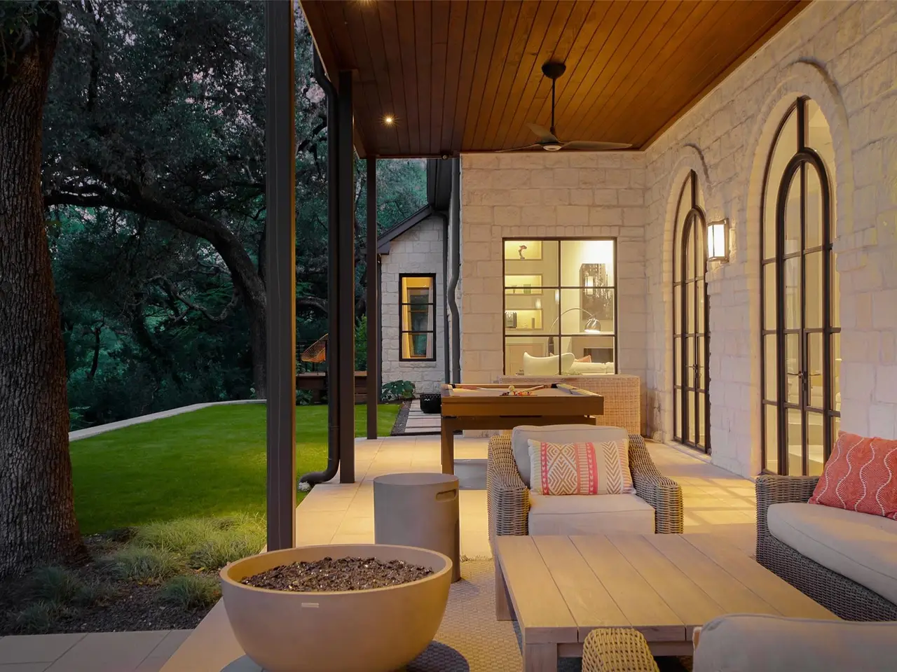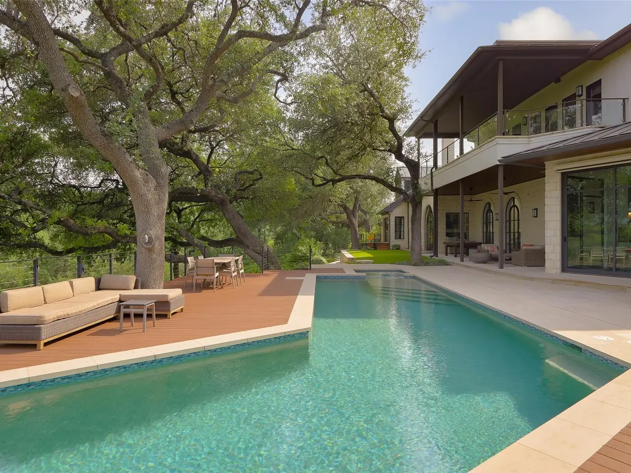 Welcome to 5301 Maryanna Drive, a stunning Westlake retreat perched above Lake Austin with sweeping Hill Country and water views. Nestled in one of Austin's most coveted gated neighborhoods and within Eanes ISD, this home offers prestige, privacy, and unbeatable proximity to Austin Country Club, the lake, downtown, and more. Inside, soaring ceilings, rich wood floors, and a dramatic wall of arched steel-frame doors create a light-filled, luxurious ambiance. The expansive living and dining space is anchored by a sleek fireplace and flanked by custom built-ins, soft neutral tones, and curated lighting. The kitchen pairs minimalist cabinetry with a full-height wine fridge, paneled appliances, and a seamless flow into the family room framed by floor-to-ceiling glass and panoramic pool and lake views. Tucked just off the main living space, the serene primary suite features steel-framed windows and private patio access. The spa-like bath boasts warm-toned tile, dual vanities, vessel sinks, a soaking tub, and a frosted-glass walk-in shower, plus two large walk-in closets. Additional highlights include a corner office surrounded by oversized windows and a vaulted bonus room with limestone fireplace. Upstairs, a dramatic skylight stretches across the corridor, linking two wings. One side features three guest bedrooms with en-suite baths and a private balcony overlooking the backyard and Lake Austin. The opposite wing offers a private guest suite with full bath and a flexible light-filled studio, yoga room, or gym. Two 2-car garages include a car lover's dream: epoxy floors and red cabinetry in a pristine showroom-like setting. Out back, an entertainer's paradise awaits with a spacious covered patio, outdoor kitchen, putting green, and infinity-edge pool that melts into the treetops. Backing to a greenbelt and scenic trail, this property is a rare blend of luxury, nature, and convenience just minutes from the heart of Austin.