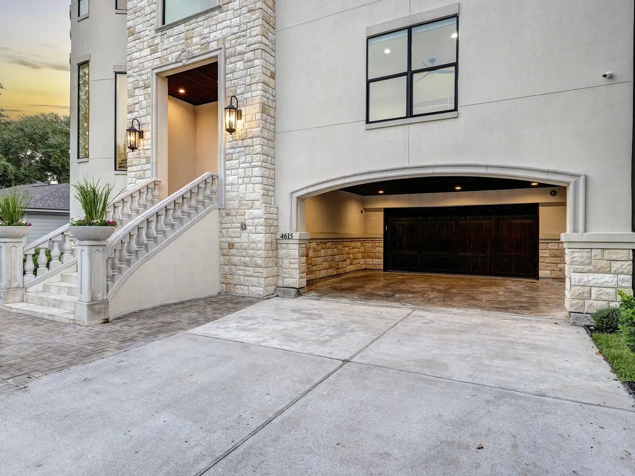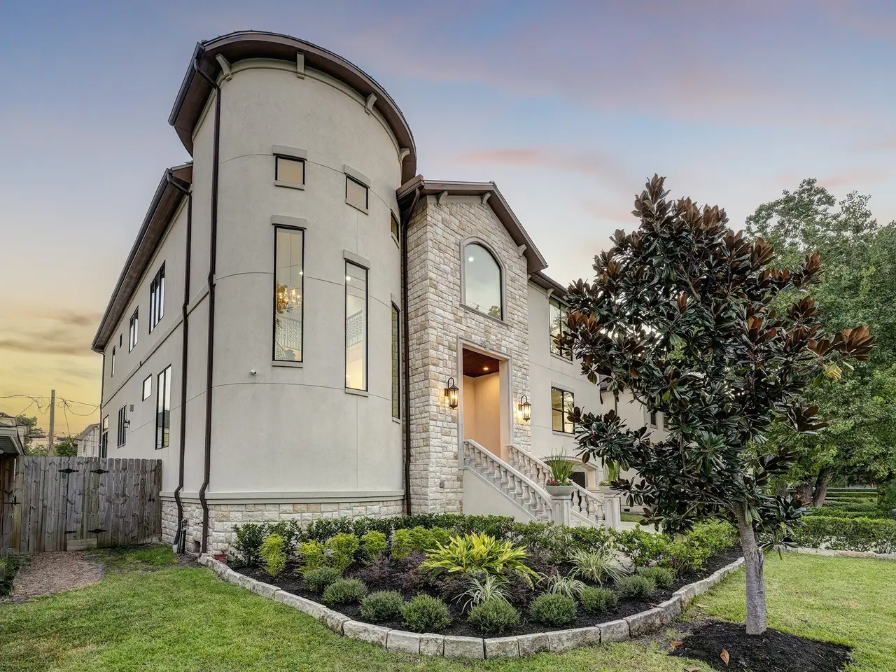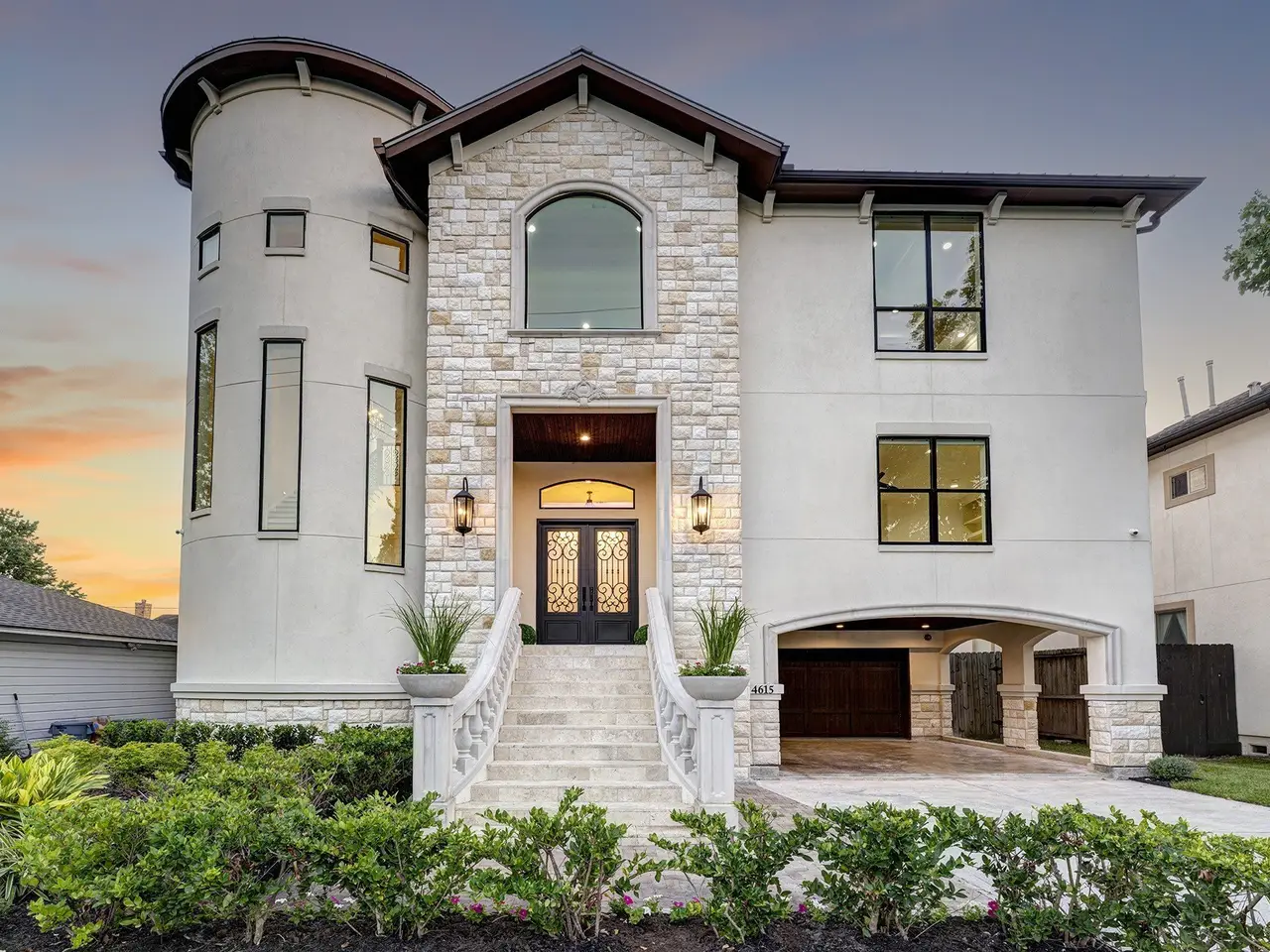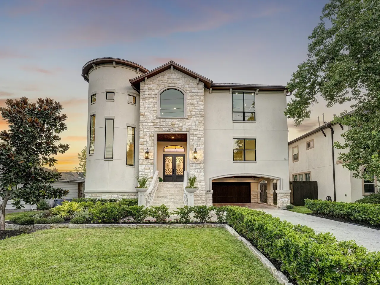Welcome to this architecturally inspired masterpiece in the heart of Bellaire. Completed in 2019, this stunning spacious home has 5 bedrooms and 6 ½ baths on a large beautifully landscaped lot inside the Loop. The stately elevated façade is composed of stucco, stone and cast stone. A porte-cochere leads to an oversized garage with an exceptional storage area. Inside, the grand foyer with piano alcove/sitting area has access to a guest suite, study and the sweeping staircase. The island kitchen boasts Viking appliances, quartz counters and adjacent breakfast room, and flows to the great room with fireplace, bar area and formal dining room. A covered porch with fireplace overlooks the lushly landscaped back yard. Upstairs find a spacious den/game room, elegant primary suite and 4 additional ensuite bedrooms plus third level flex room with bath. Solar panels, 2 utility rooms, water softener and elevator closets, all per Seller.