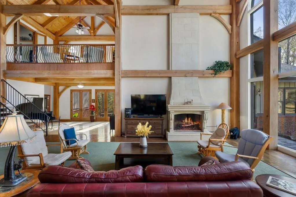 Nestled on over 16 +/- acres, this custom-built home is truly a unique gem. This astounding property features; expansive picture-book grounds, a serene pond, a detached four-car garage with a finished loft space and so much more. As you approach this stunning home you will begin to notice all the intricate details; greeted by the eclectic charm of this impressive home, from the white oak beams, the lofty vaulted ceilings, and intricately designed iron railings, to the floor-to-ceiling windows that fill the home with warmth and light, this home offers a quiet oasis. The main floor has designated spaces while also offering an open floor plan; including a cozy library and office, a formal dining room, a theatre room, and a well-appointed kitchen complete with a walk-in pantry. The chef's kitchen boasts a charming breakfast nook that overlooks the scenic landscape, two dishwashers, stainless steel appliances, and a kitchen island made of exquisite cut stone. This culinary space flows beautifully into the living room, where family and friends can gather around the handcrafted fireplace while enjoying views of the tranquil pond. Venturing beyond the living room, you'll discover the expansive primary suite with two custom closets, a linen closet, and a luxurious spa-like bath featuring a soaking tub adorned with a stained glass window, a custom stone shower, and charming separate vanities. Additionally, on the main floor, you will find a bonus room that is ideal as a guest room or office space and a fully equipped laundry room. As you make your way up the staircase, you'll come across two cozy loft spaces, a billiards and game room, and a quaint living space with a Juliet balcony overlooking the beautiful landscape. There are three guest suites on this level, each with oversized closets and adjoining Jack and Jill baths. The stone wrap-around porches are truly magnificent and perfect for a rocking chair or swing to enjoy the tranquil outdoors. The four-car garage is the perfect setup for a workshop and great for car enthusiasts. The added office and flex space upstairs add extra convenience to the home. Seamlessly blending elegance and charm this home is beautifully designed inside and out, from the flagstone pathways that guide you to tranquil outdoor spaces, great for gatherings and peaceful retreats to the intricately designed beams inside the home, no detail is missed