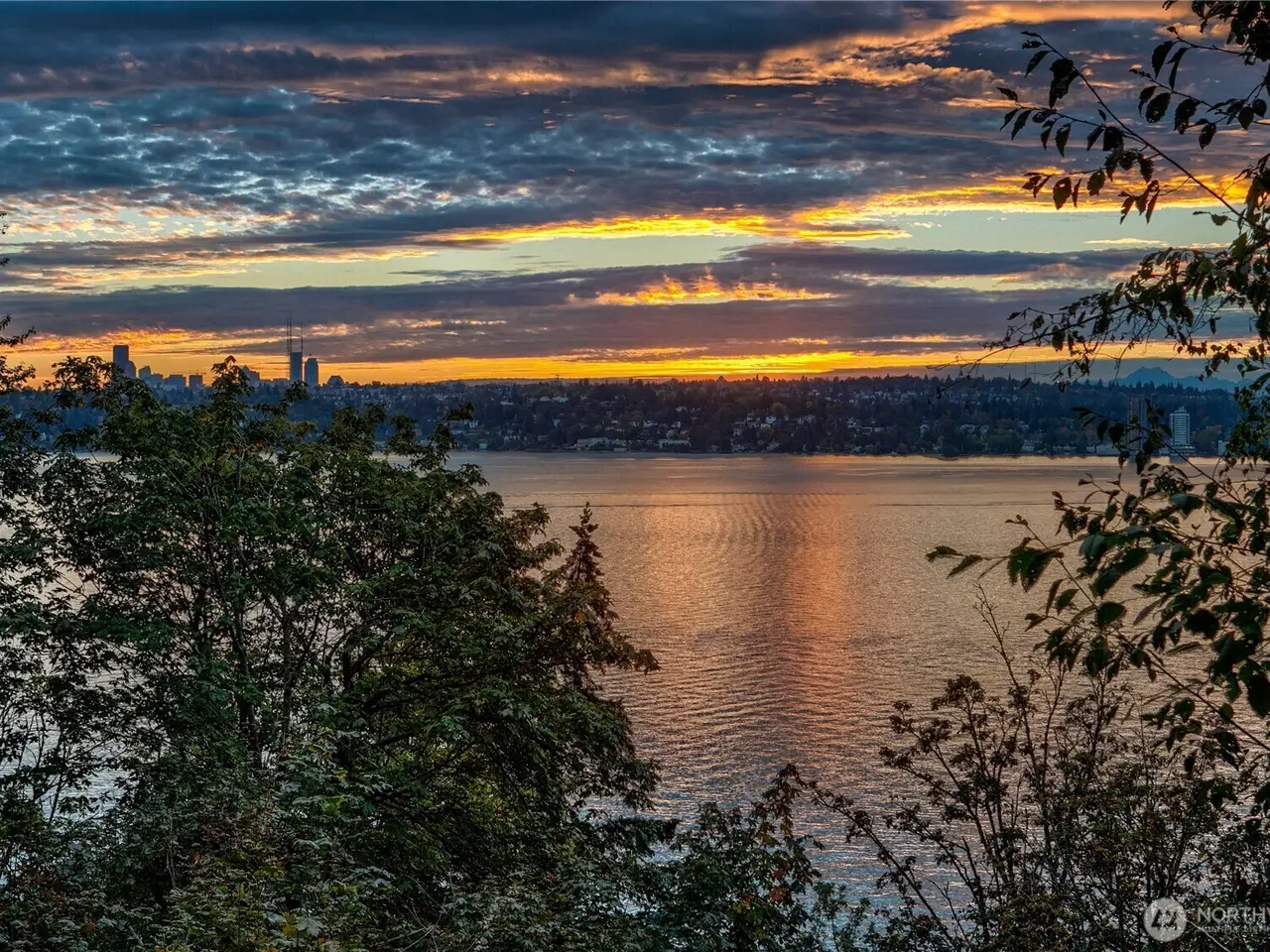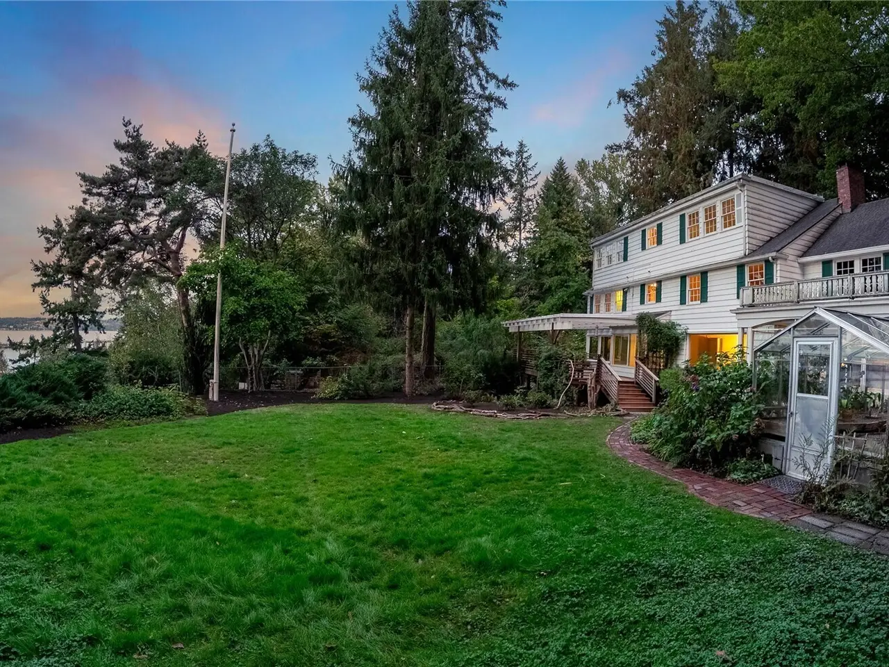 Evergreen Lakeshore Preserve. 3 wooded acres on Medina's ultra-affluent Gold Coast: 215 ft Lk Washington waterfront, accessed by private hillside tram, with 70-ft dock; 1938 5170 SF main residence; various smaller outbuildings. Panoramic view of boat traffic, vivid sunsets, serene Olympic Mtns. Conservation easement prevents subdivision, protects fragile habitats, creates privacy and peace – minutes from energy and excitement of Bellevue tech, world-class restaurants and retail, fabled mansions of founders and magnates. Erect your dream compound! Provision for renovation/replacement of existing structures within original footprint; city zoning allows vertical expansion. Extensive documentation includes architect's feasibility study.