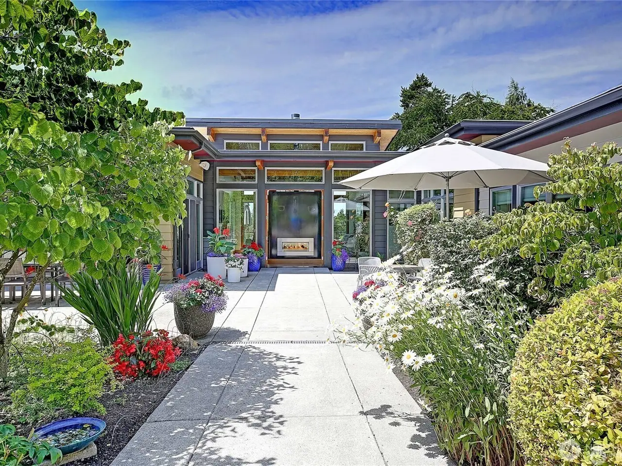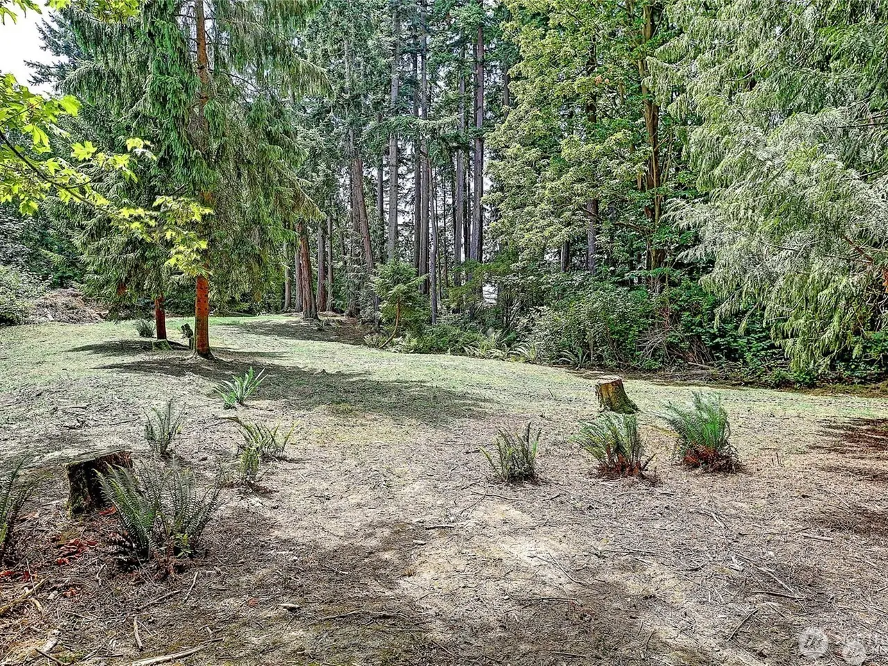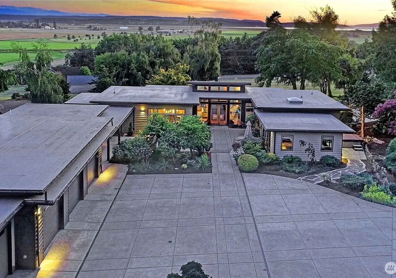 Exquisite Mid-Century style home on 6.4 beautiful acres with evergreens and trails throughout. Views of the Olympics, Sound, City, Sunsets, and Valley. Six parcels within the city limits. Drive up to your finished four-car garage and walk through a gorgeous courtyard into your own piece of paradise. Beautiful open kitchen with large island. Stainless high-end appliances. Adjoining is your dining area with lots of built-ins. TV room, with adjoining office. Huge deck the width of the house. Large living room with steel fireplace. Secondary bedroom, 3/4 bath, machine room and guest closet are steps away. Spacious primary suite with updated bath and walk-in closet. Detached studio guest room with beautiful granite counters and 3/4 bath. Green Built!