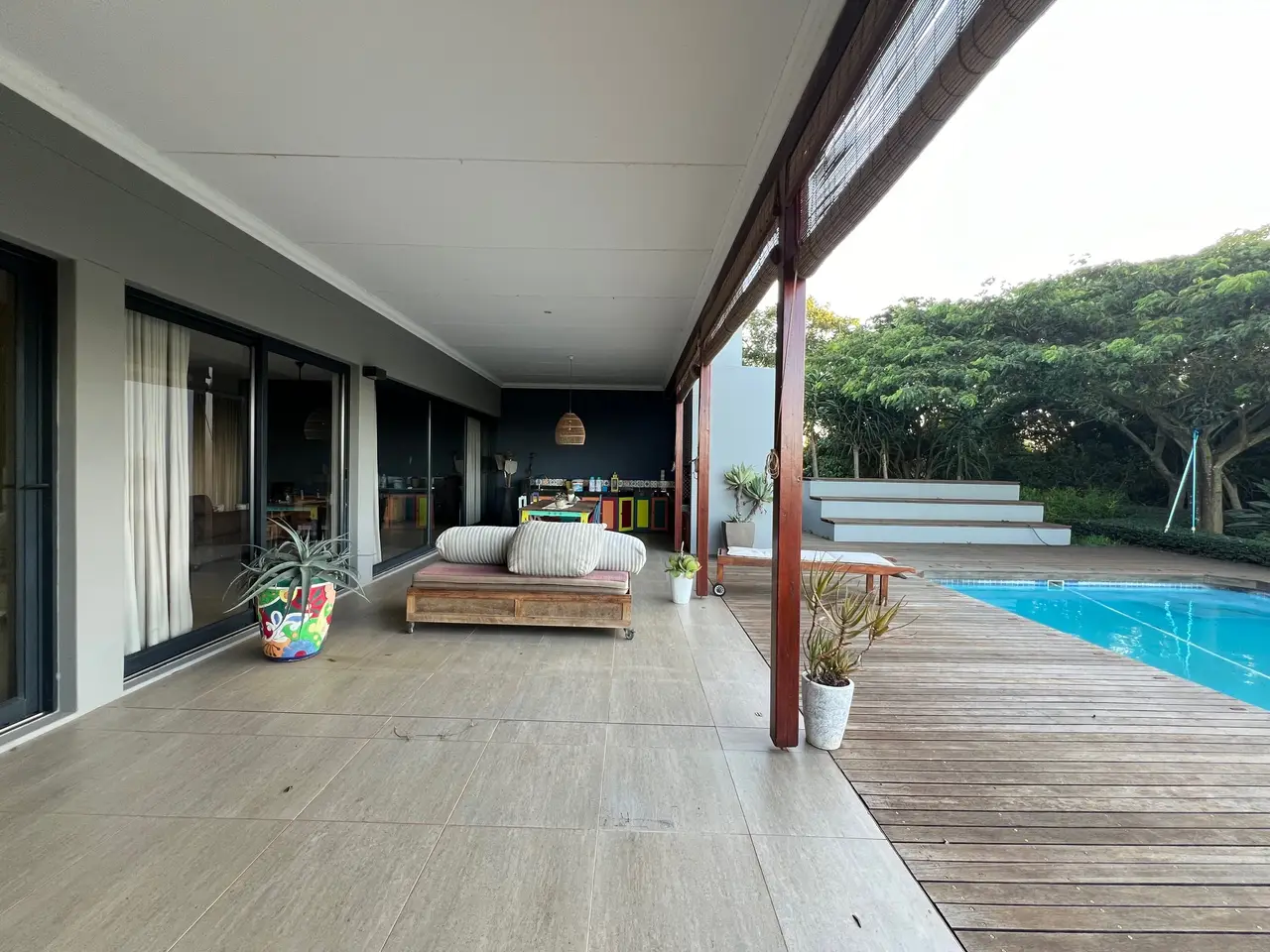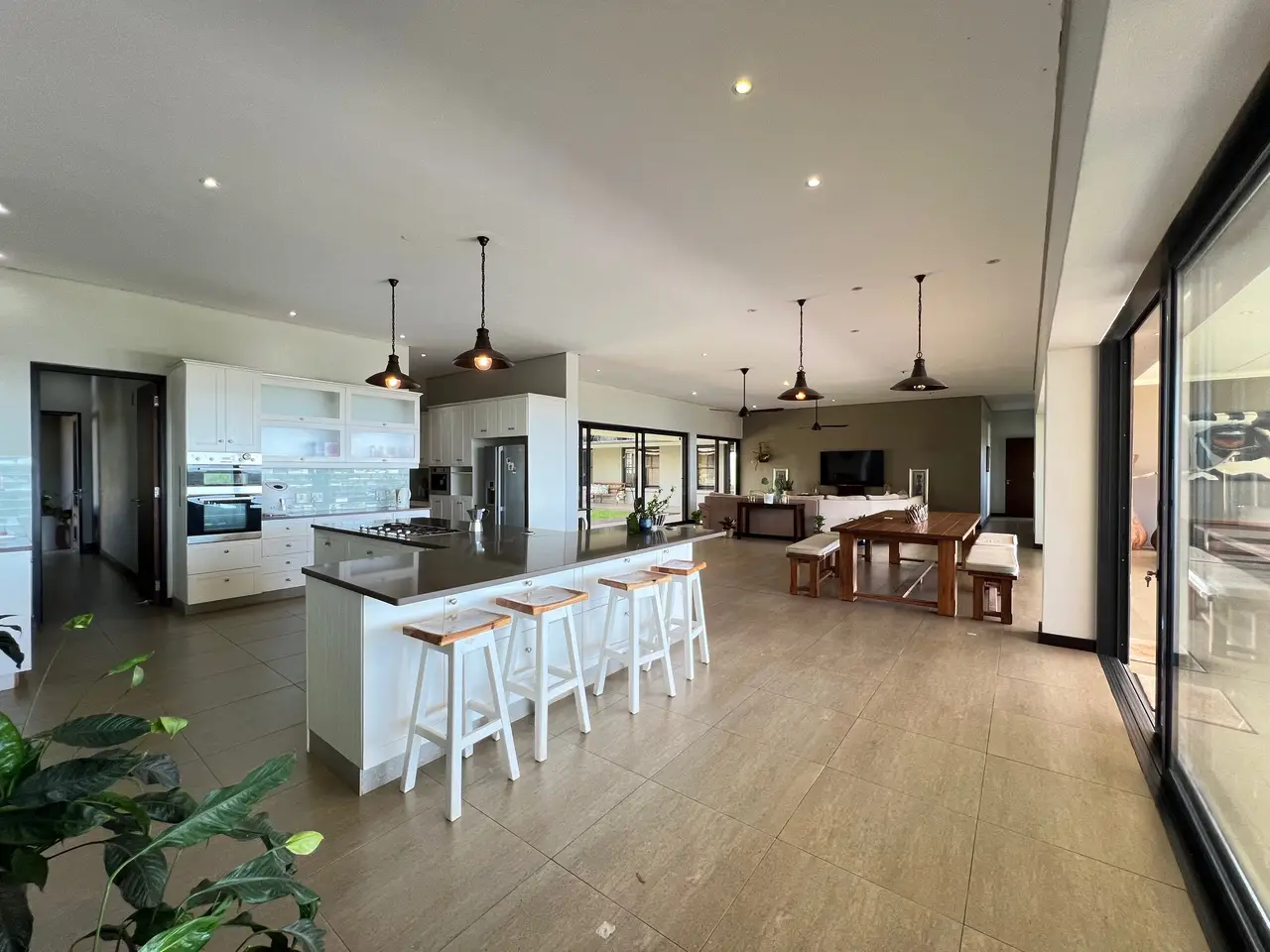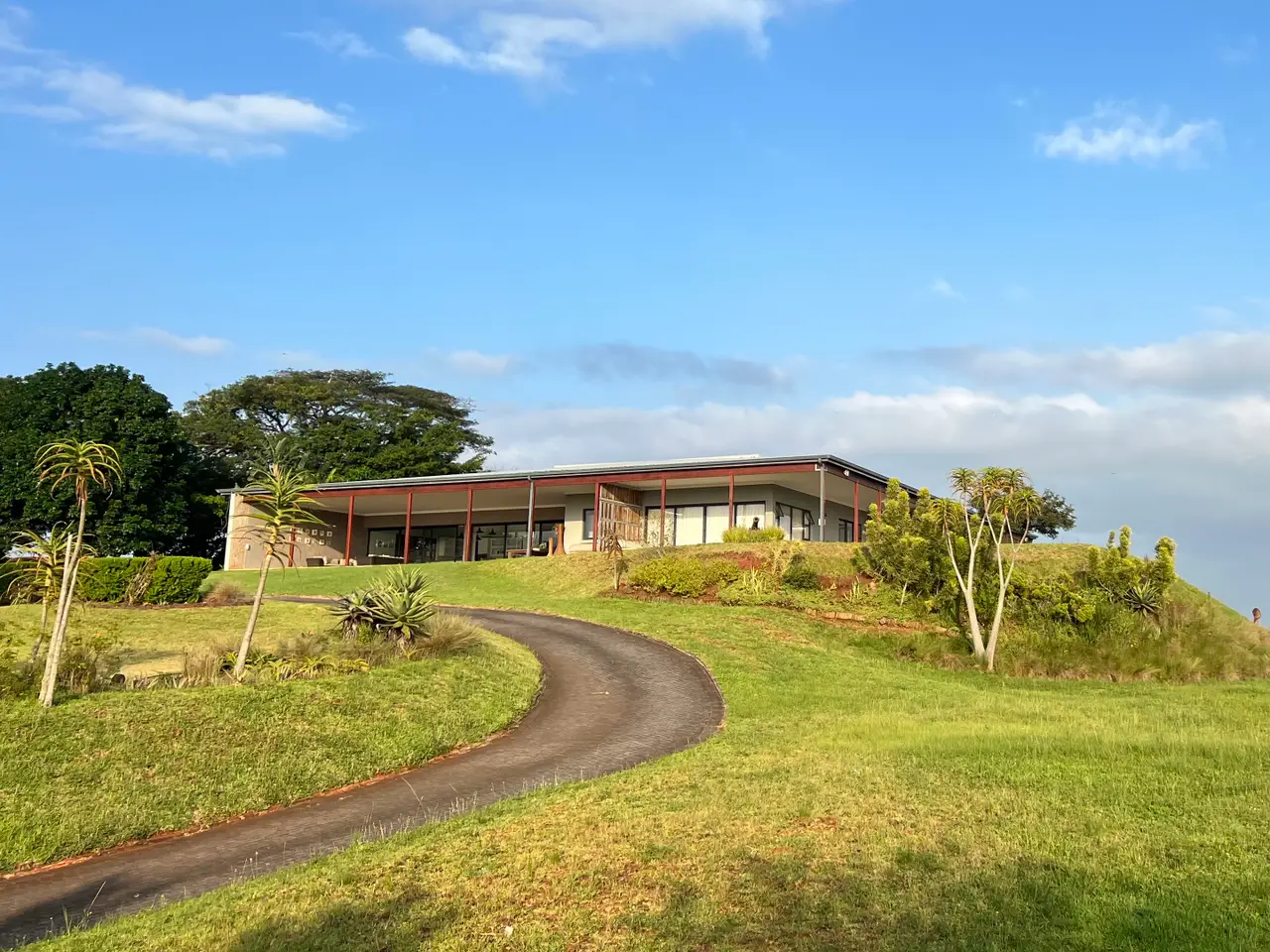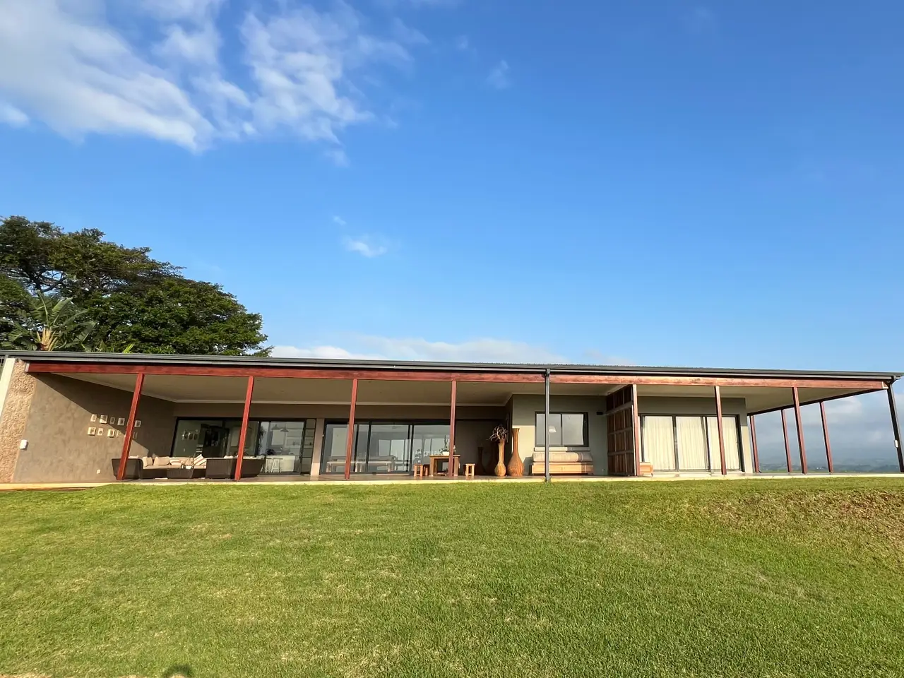 Available on the hills of Zini River Estate with endless views of grassy reclaimed cane lands overlooking the ocean, estuary, and riverine forest. 1,100 square meter home on a 11,716 square meter stand. Nestled within this Eco Estate, this single-level five bedroom residence boasts en suite bathrooms, ensuring privacy and comfort. Seamlessly blending indoor and outdoor living, the open-plan layout effortlessly connects all areas to a serene central courtyard. Indulge in luxury amenities such as a generous home gym and music room or unwind in the inviting wine cellar. Outside, a charming Boma, pizza oven, and built-in braai beckon with breathtaking views, creating perfect spaces for entertaining. Completing the package, spacious two double garages with ample storage and an inverter with batteries ensure both convenience and efficiency. The home is sold furnished if needed. Lovely pond on the property for water distribution.