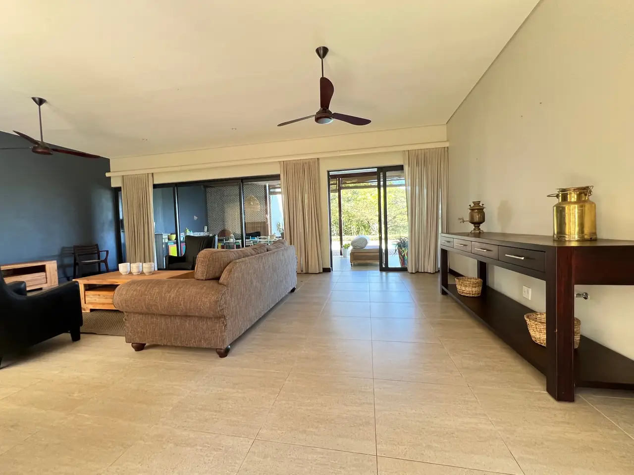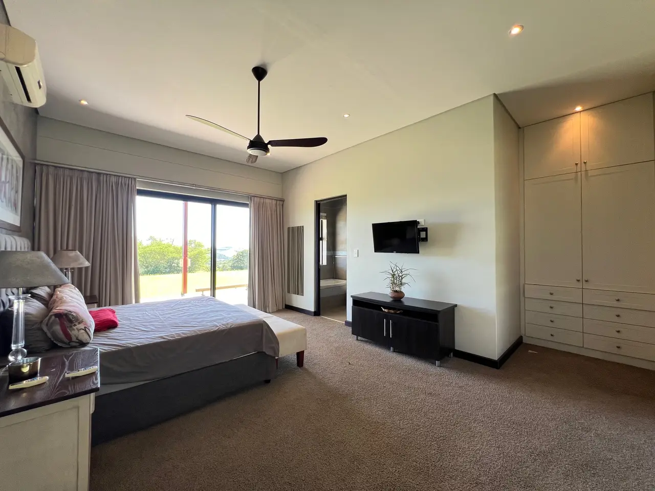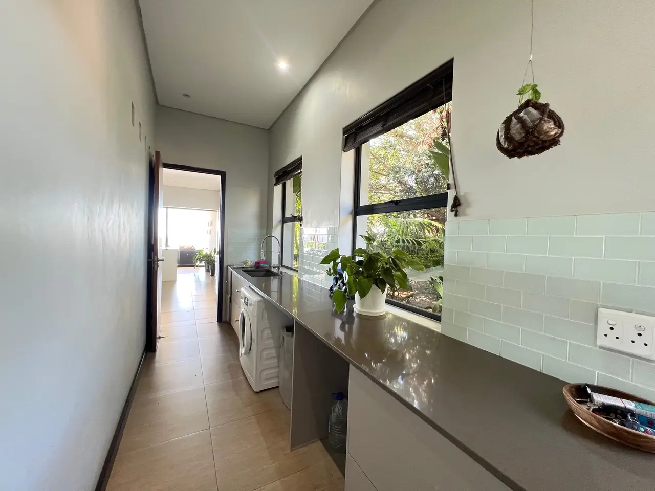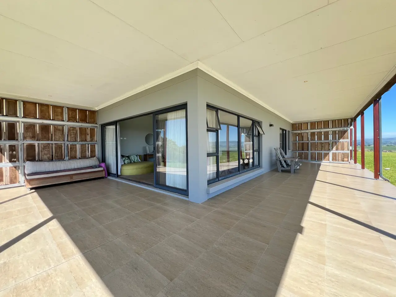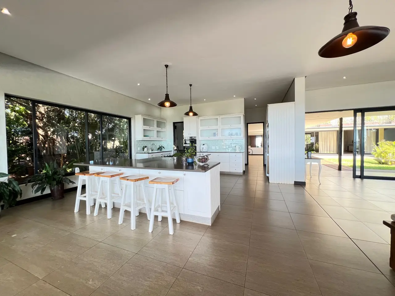Available on the hills of Zini River Estate with endless views of grassy reclaimed cane lands overlooking the ocean, estuary, and riverine forest. 1,100 square meter home on a 11,716 square meter stand. Nestled within this Eco Estate, this single-level five bedroom residence boasts en suite bathrooms, ensuring privacy and comfort. Seamlessly blending indoor and outdoor living, the open-plan layout effortlessly connects all areas to a serene central courtyard. Indulge in luxury amenities such as a generous home gym and music room or unwind in the inviting wine cellar. Outside, a charming Boma, pizza oven, and built-in braai beckon with breathtaking views, creating perfect spaces for entertaining. Completing the package, spacious two double garages with ample storage and an inverter with batteries ensure both convenience and efficiency. The home is sold furnished if needed. Lovely pond on the property for water distribution.