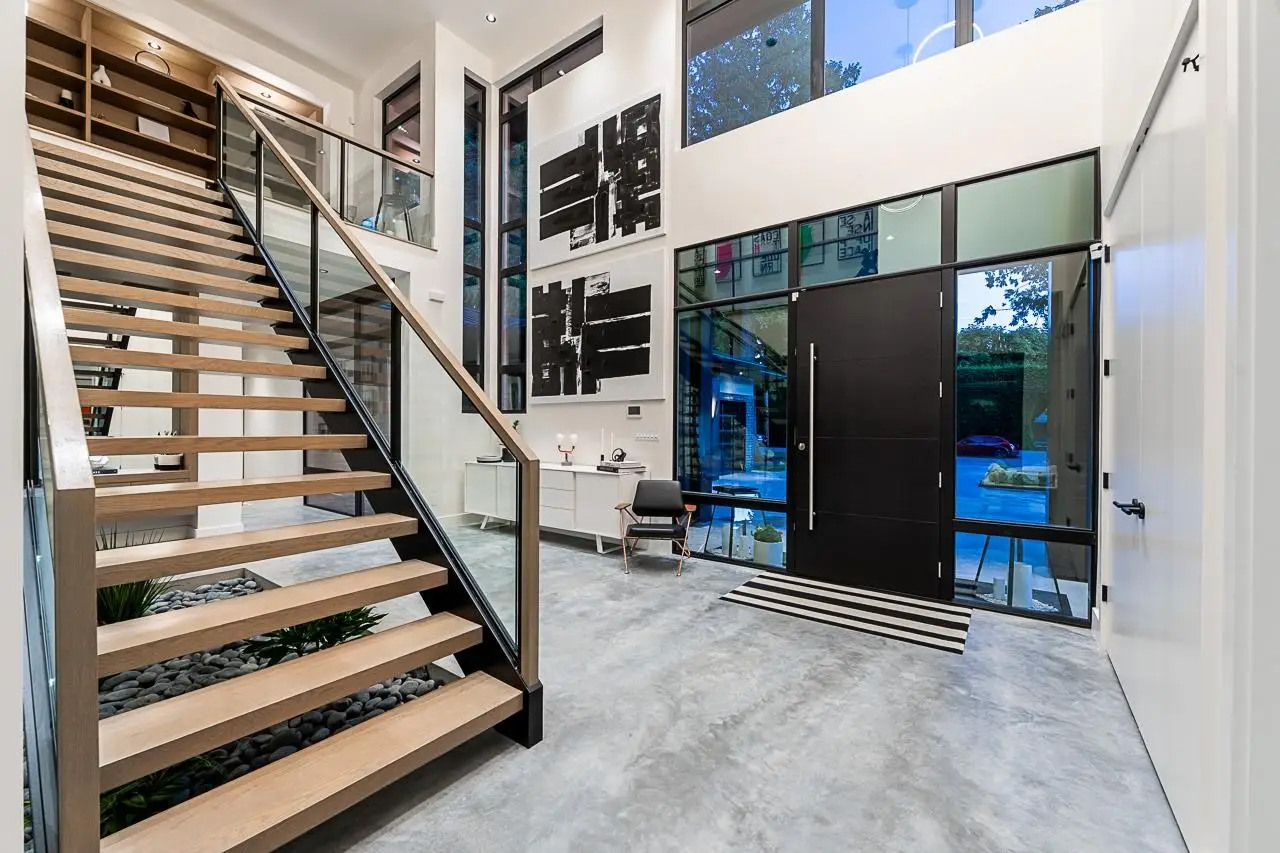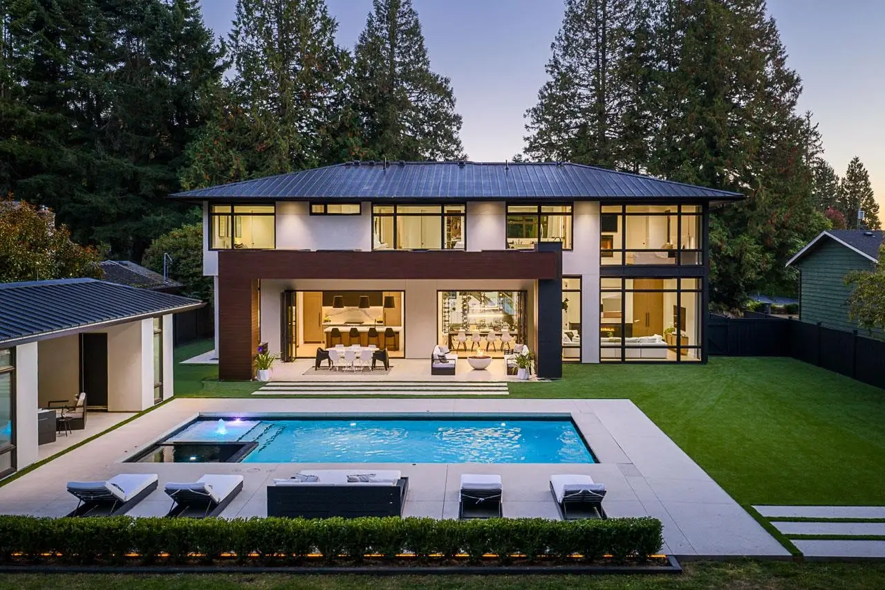MODERN MASTERPIECE, Built to perfection with timeless interiors by Su Casa Design. Over 4,000sqft of luxurious living space on 2 well appointed levels offering a seamless indoor/outdoor lifestyle. 20' soaring ceilings, freestanding stairs, heated polished concrete floors, floor-to-ceiling windows throughout, rich oak flooring, custom cabinetry and every luxury amenity desired. Beautiful Great Room with ample natural light, feature wine cellar, and stunning Gourmet Kitchen; wolf appliances, oversized island and walk-in pantry. Master Suite rivals the most luxurious hotels, and 3 additonal ensuited bedrooms upstairs! The living space expands to the outdoors with a grand-scale covered patio, outdoor kitchen, putting green, and stunning pool & hot tub. Situated on a private 1/2 acre property.