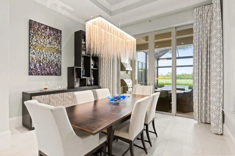IMMEDIATE GOLF MEMBERSHIP AVAILABLE with this Luxurious West-Facing home offering lake, golf course, preserve views and glorious sunsets Experience elegant living in this stunning custom-built residence by Gulfshore Homes, professionally designed by Vogue Interiors and perfectly positioned in the exclusive enclave of Westlake Court. Step through double entry doors into a light-filled interior boasting 12-foot ceilings with exquisite detailing, designer tile flooring, and custom built-ins. The open-concept layout is ideal for entertaining, with the spacious great room and dining area flowing seamlessly to the outdoors through 10-foot impact resistant sliding glass doors. The chef's kitchen is a standout feature, offering a large center island, custom cabinetry with ample storage, under-counter microwave drawer, and a U-Line dual-zone wine cooler. Outside, the lanai is a true private retreat. Travertine tile surrounds a resort-style pool and spa, accented by dramatic Grand Effects fire and water features. A custom outdoor kitchen, covered dining area, and fireplace with handcrafted screen create the perfect setting for relaxed living and entertaining-all while enjoying unobstructed sunset views.The luxurious primary suite features detailed ceiling finishes, designer wall treatments, and customized walk-in closets. Two guest suites, a den/office, powder room, and an oversized 2.5-car garage complete this exceptional home. Additional highlights include a whole-house generator, Anderson impact resistant windows, custom window treatments, built-in sound system and ample garage storage. Enjoy the unmatched lifestyle West Lake offers from the brand new Beach Club on the Gulf to the resort-style pool, fitness center, Championship Pete & P.B Dye golf course, pickle ball, tennis, private boat launch to the Gulf and Estero Bay and so much more!