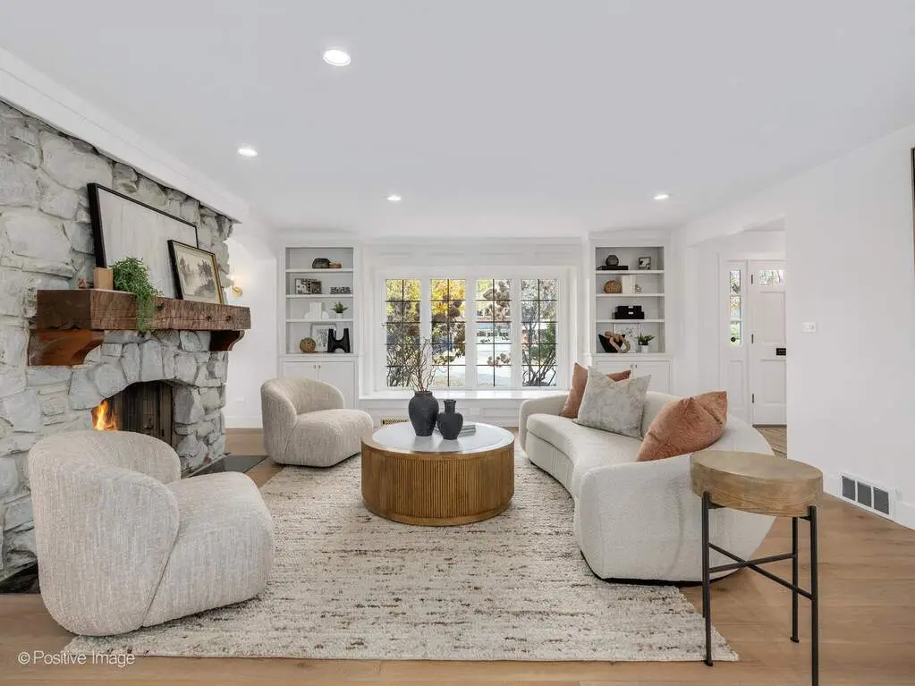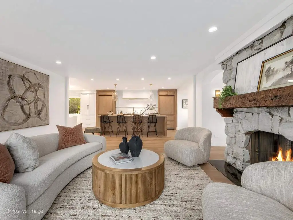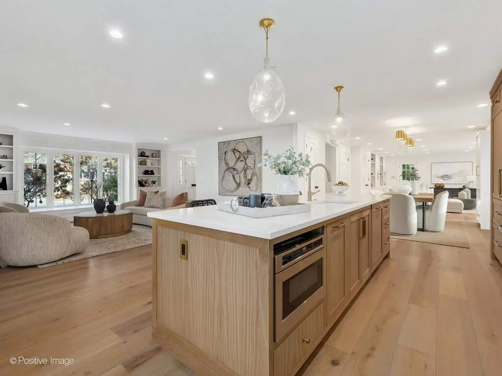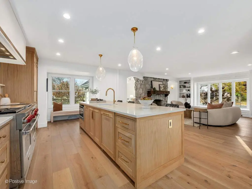 Experience California-inspired organic chic in this fully reimagined 2025 renovation by a California designer and Hinsdale native. Natural materials, warm textures, and high-end craftsmanship come together to create a home that feels elevated and deeply inviting. European white oak floors, Farrow and Ball paint, brass hardware, and Visual Comfort lighting throughout establish a refined, modern-organic aesthetic. Step inside to a calming, modern living room where a dramatic stone fireplace warmly anchors the home. This impressive architectural centerpiece is open to both the living room and the adjoining great room, which features striking vaulted ceilings and stunning windows, adding volume, natural light, and architectural lift. The space flows into the custom white oak kitchen, which opens seamlessly into a comfortable, light-filled family room. The kitchen is a true focal point, anchored by an oversized 10 foot white oak island wrapped in Taj Palazzo Orion Quartz on both the island. Custom recessed white oak cabinetry, two 36-inch Sub Zero built-in refrigerators, and a professional 48-inch Wolf dual fuel range with eight burners create a chef-level environment. The primary suite offers a serene retreat with a spacious walk-in closet illuminated by a designer chandelier. The spa-like bath features a custom inset white oak vanity, Calacatta Gold Quartz, Brizo and Kohler fixtures, and a natural pebble-stone shower floor. The second floor also includes four additional bedrooms, one of which can flex as a bonus room, office, or playroom. A gorgeous second-floor laundry room features designer tile and an oversized rattan fixture. The lower level offers 1,716 square feet of flexible living space with a full bath and an open palette ready for your family's vision. Set on a wide peninsula-style 0.34 acre lot with rare 187-foot frontage, the property offers open space, presence, privacy, and generous room to enjoy outdoor living. Exterior features include an attached garage with natural wood garage doors, elegant gas lanterns, professional landscaping, mature trees and landscape lighting. Located in the award-winning Monroe School, Clarendon Hills Middle School, and Hinsdale Central High School district. A rare, thoughtful renovation blending California warmth with Midwestern livability, beautifully designed from top to bottom.