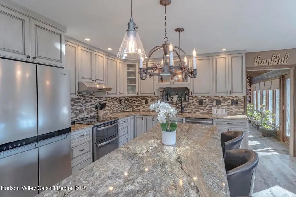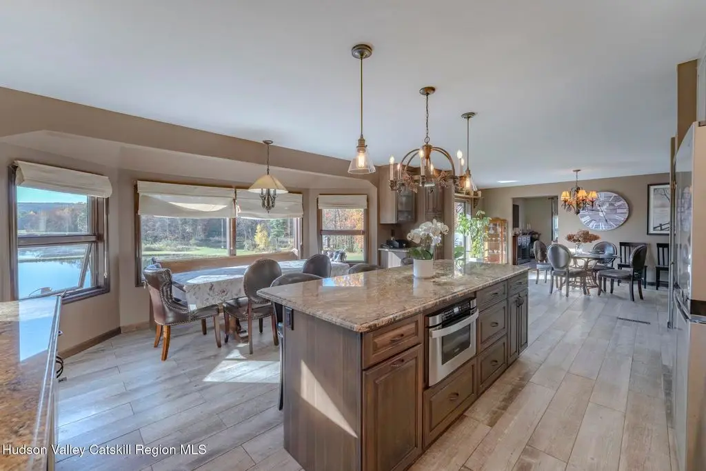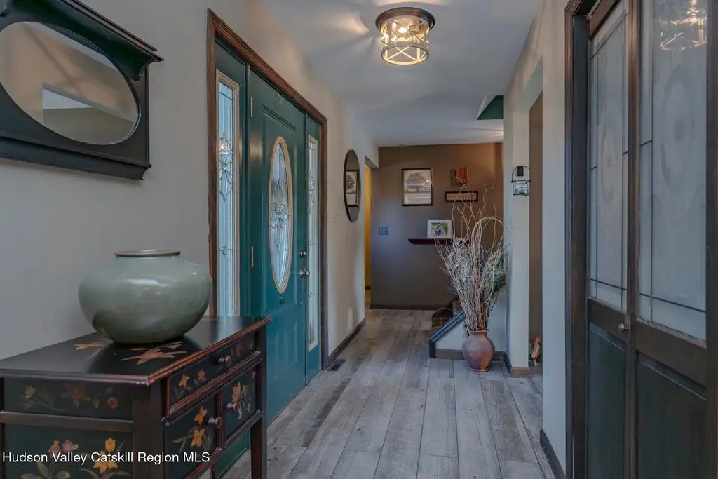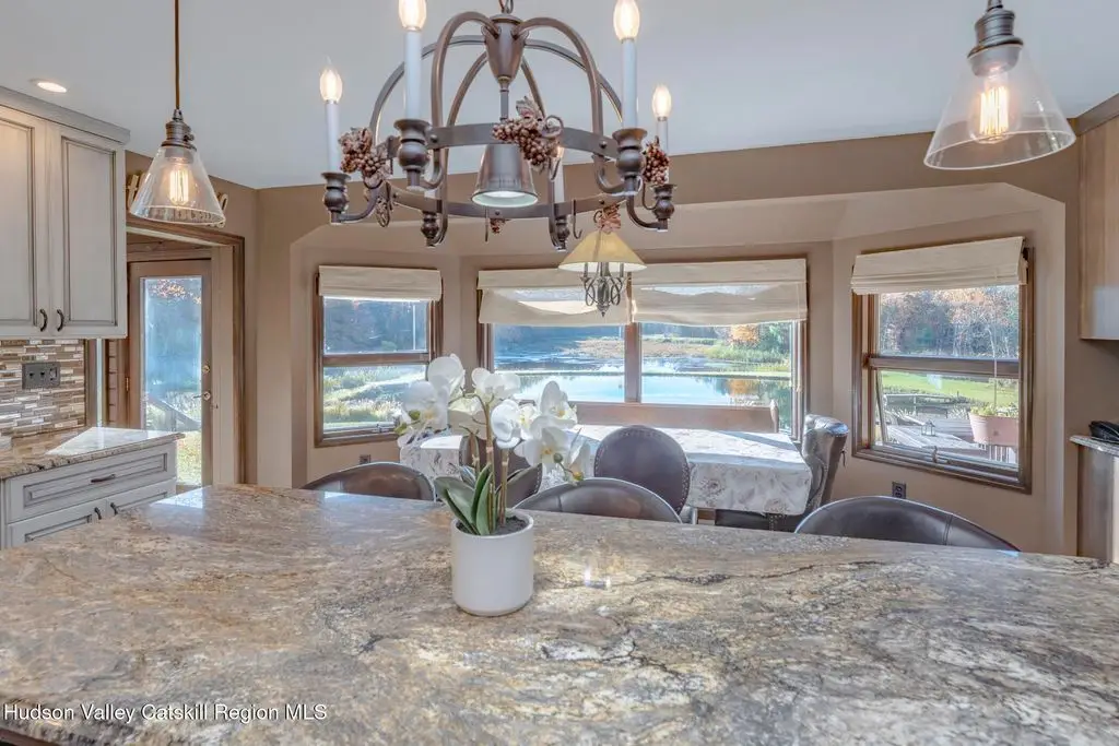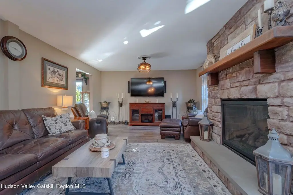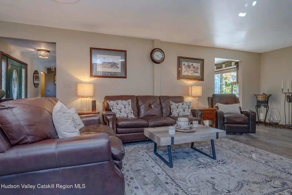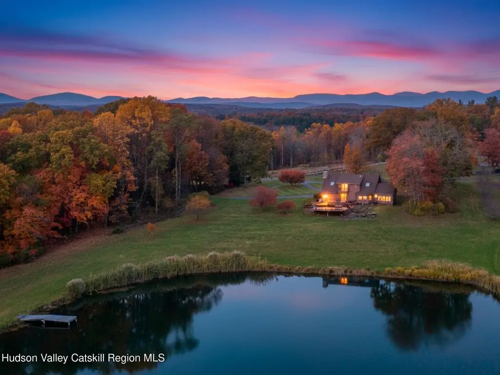 Escape to your own private retreat nestled in the woods! This 3-bedroom, 1.5 bath home offers the perfect blend of comfort and country charm. The spacious kitchen is designed for entertaining, with ample counter space and room for gathering both indoors as well as flowing out onto the two tiered deck overlooking the ponds and a waterfall that can be turned on simply by a switch in the home. Work from home or host extended family or friends with an additional flex room on the first floor. Unwind by the cozy fireplace in the living room on crisp winter evenings, or step outside and experience the serenity of the forest, open meadows, and water views. Upstairs, you will find 3 spacious bedrooms and an open sitting area complete with gorgeous views. Enjoy 18.3 secluded acres featuring 4 stocked ponds, ideal for fishing, reflection, and quiet afternoons outdoors. A 3-stall barn with tack room electric and water provides space for horses, hobbies, or storage, while the large detached garage adds even more room for vehicles and equipment. Whether you're looking for a peaceful year-round residence or a secluded getaway, this hidden gem is perfect for those seeking privacy, adventure, and a connection to the outdoors. Located 80 miles from NYC and close and convenient to historic Kingston, your peaceful retreat awaits in the heart of the Hudson Valley.