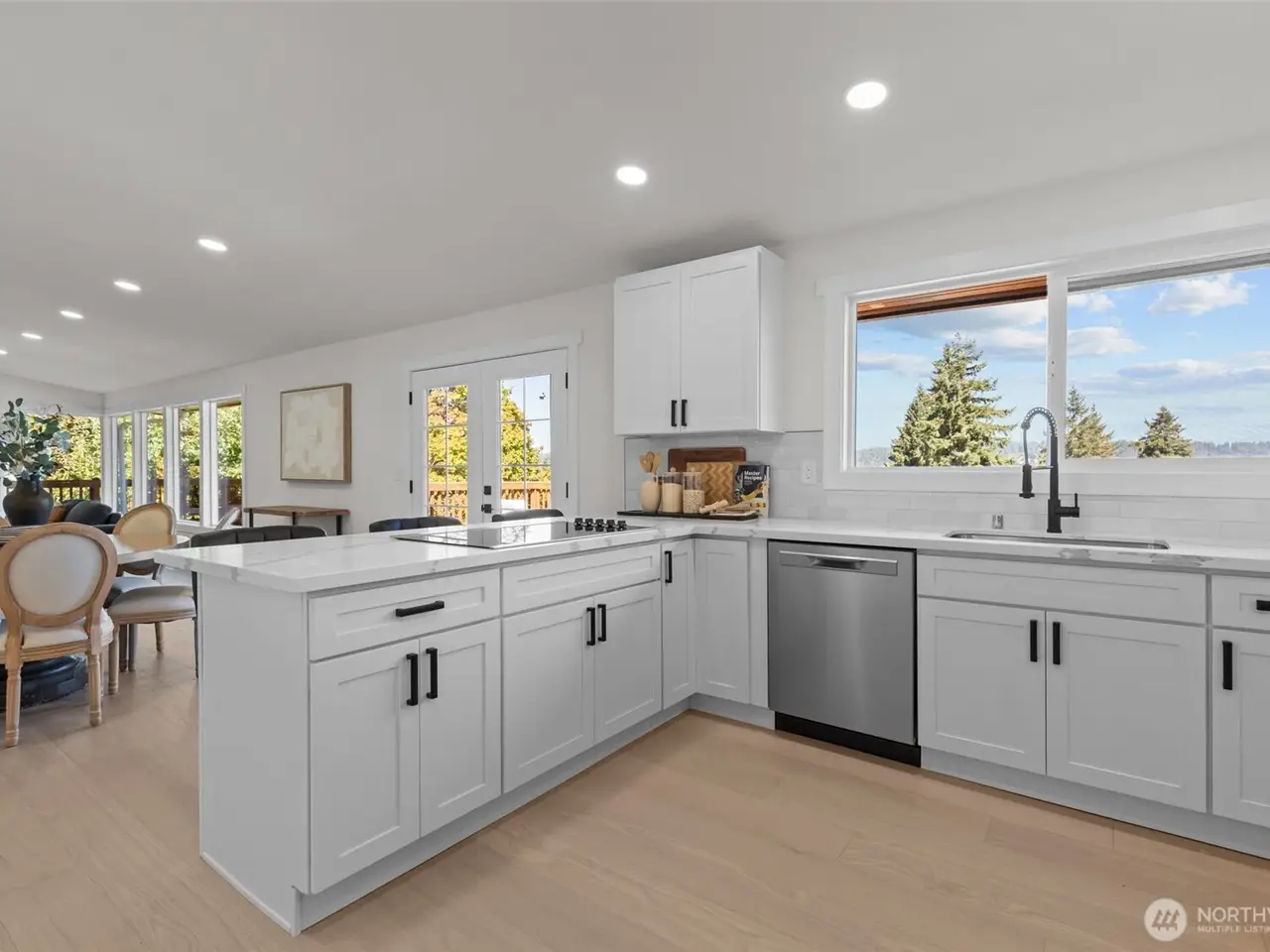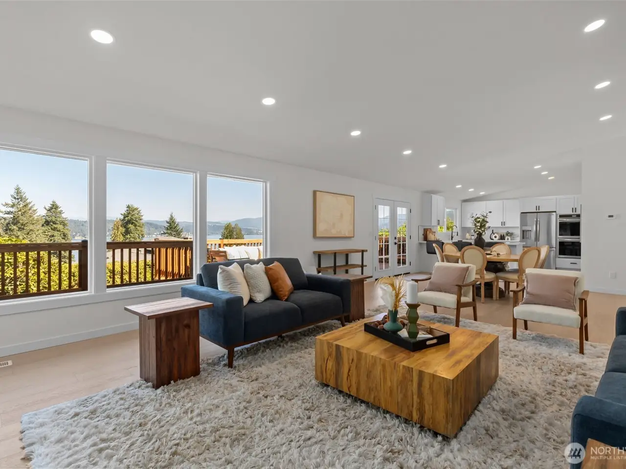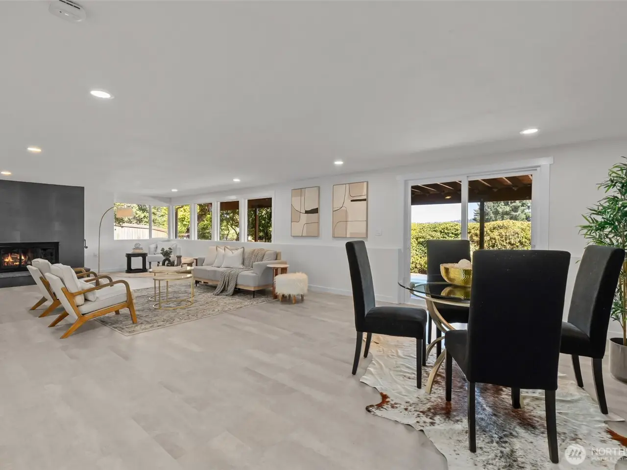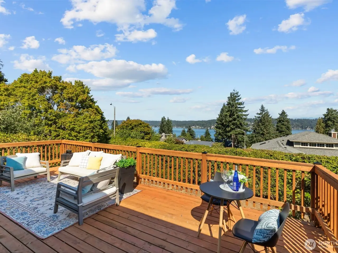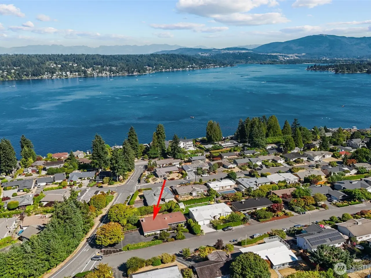 Sit on the new entertainment sized deck & enjoy views of the lake from this remodeled 4br 3ba home. Home has new wiring & plumbing. All new baths. Kitchen w/new cabinets, counter & appliances open to great room w/vaulted ceilings & gas frplc. New floors throughout. New lighting, windows, doors, millwork & trim. Primary br with private bath & door to deck. Finished room down could be study/art room. 2nd finished rm down could easily have clst added for 5th BR. Large finished storage/wine room? HUGE rec room w/gas fireplace w/room for pool table. New interior & exterior paint. New garage door. Large private fenced backyard with fruit tree. Community beach access. Close to freeways, shopping, etc. Great Bellevue schools. Highly desired location.