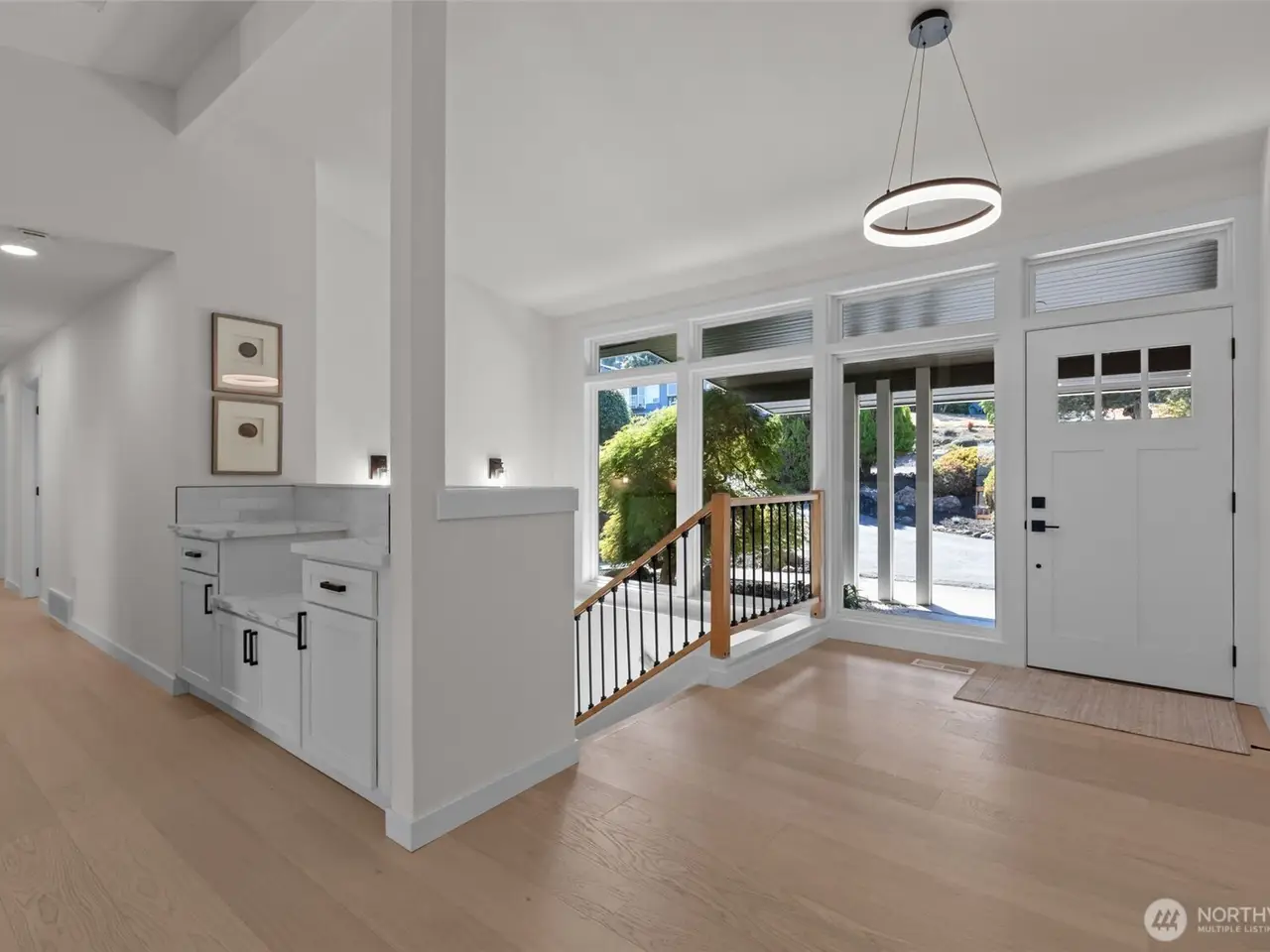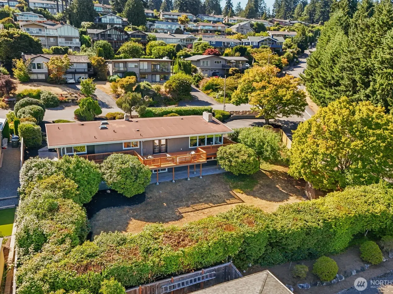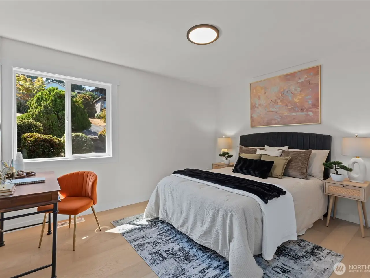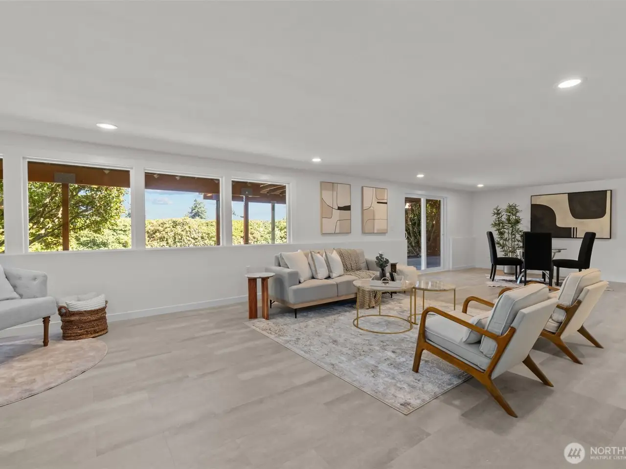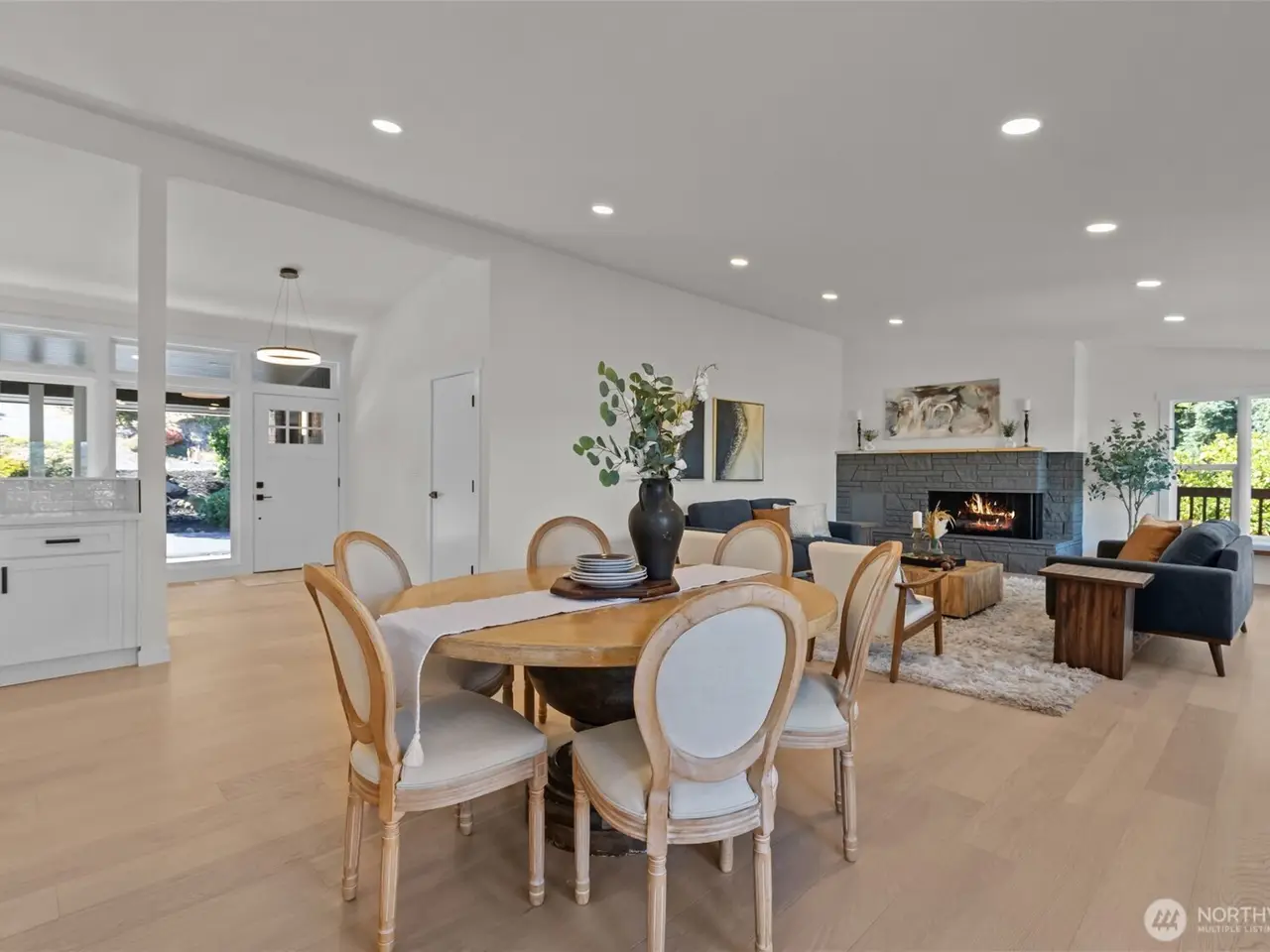 Sit on the new entertainment sized deck & enjoy views of the lake from this remodeled 4br 3ba home. Home has new wiring & plumbing. All new baths. Kitchen w/new cabinets, counter & appliances open to great room w/vaulted ceilings & gas frplc. New floors throughout. New lighting, windows, doors, millwork & trim. Primary br with private bath & door to deck. Finished room down could be study/art room. 2nd finished rm down could easily have clst added for 5th BR. Large finished storage/wine room? HUGE rec room w/gas fireplace w/room for pool table. New interior & exterior paint. New garage door. Large private fenced backyard with fruit tree. Community beach access. Close to freeways, shopping, etc. Great Bellevue schools. Highly desired location.