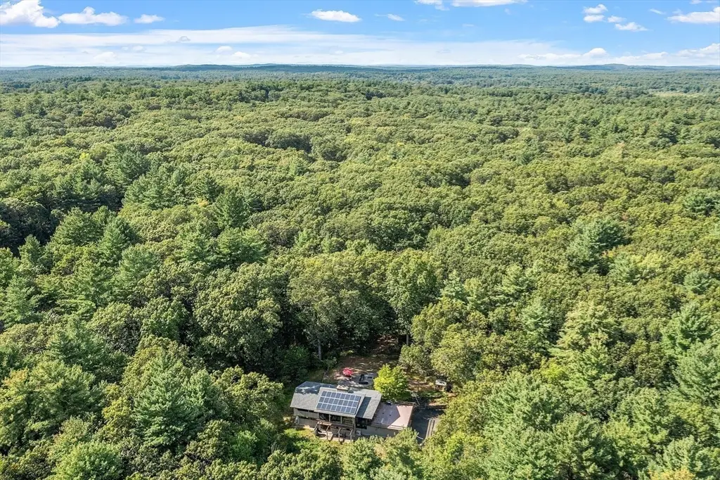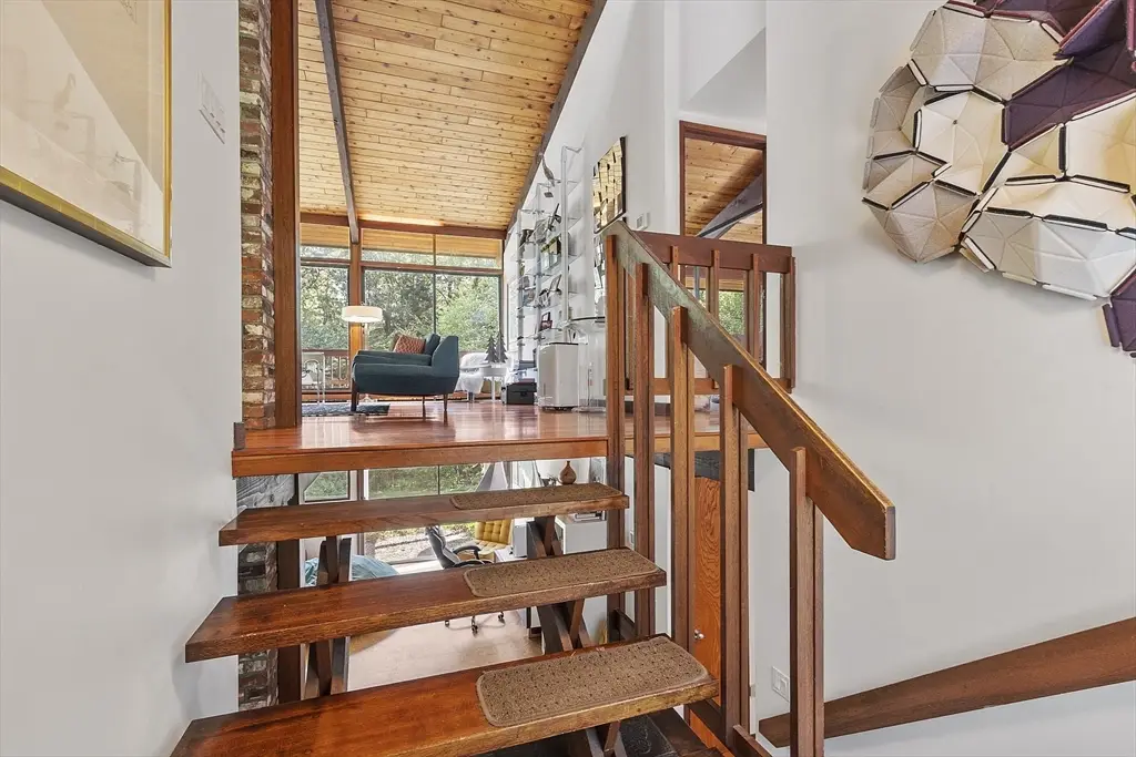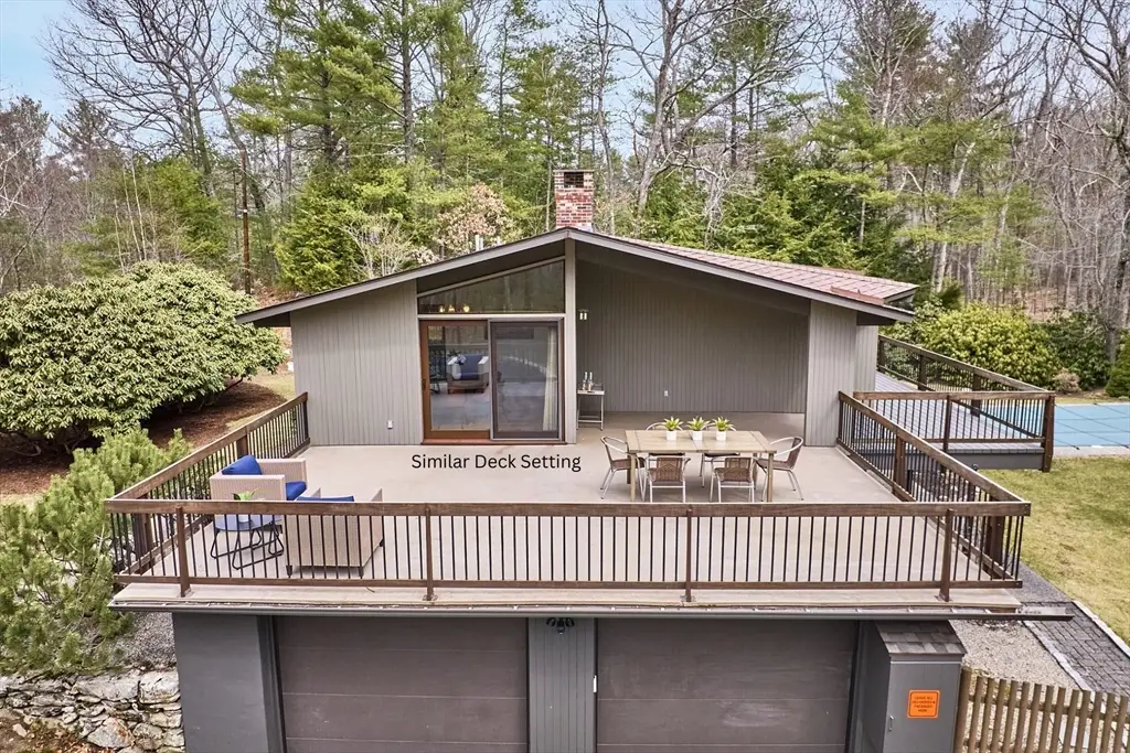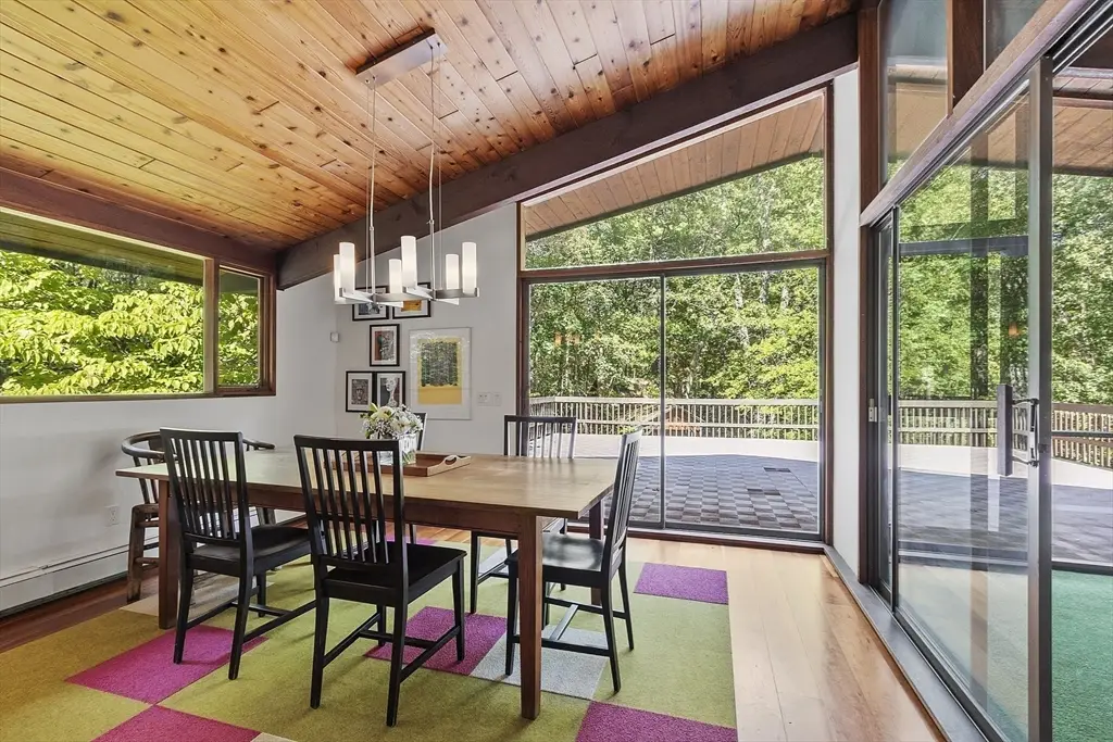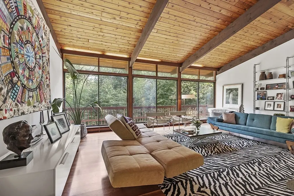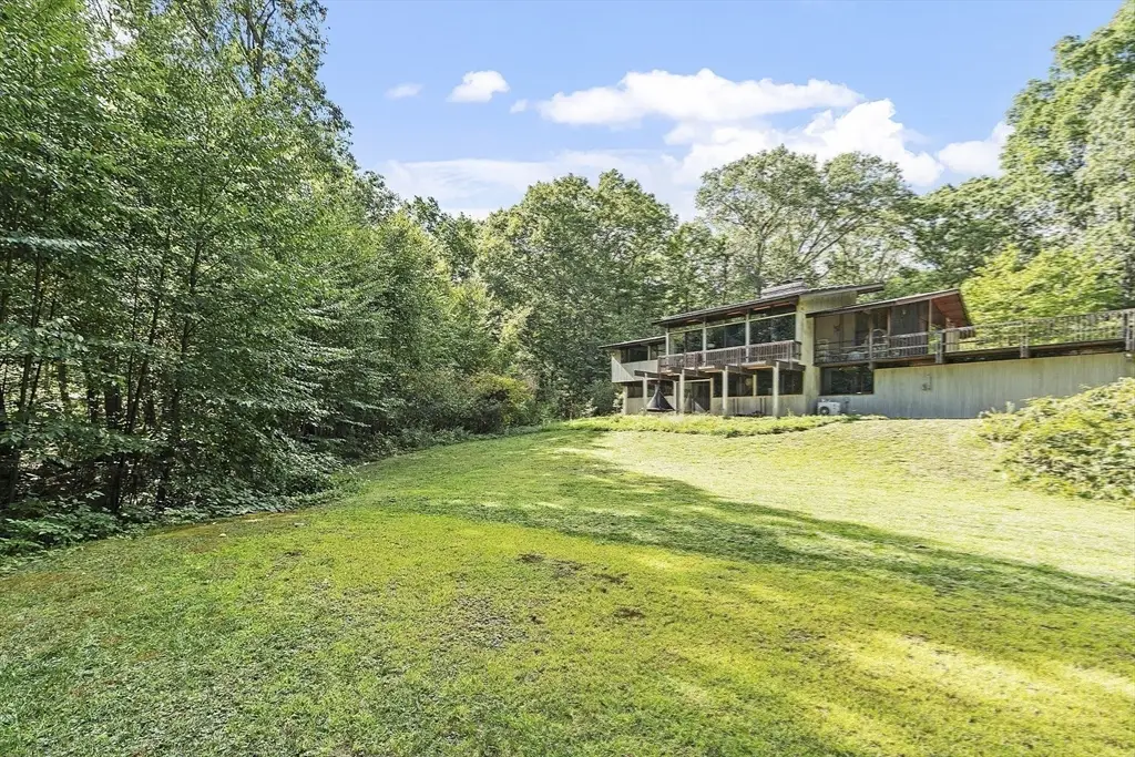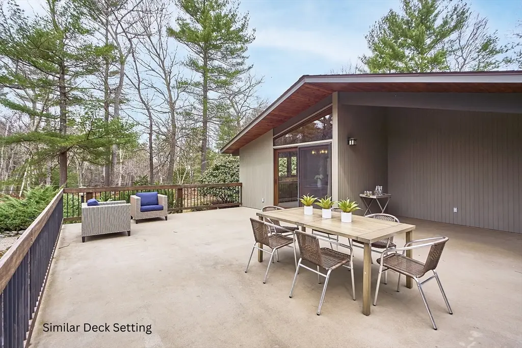 Tucked away in a serene natural setting, this contemporary 4-bedroom, 2-bath deck house is privately set on over 6 acres offers the perfect blend of modern design and tranquil living. Flooded with natural light, the open-concept first floor showcases soaring ceilings, warm wood accents, and expansive windows. A sunroom off the oversized deck provides a seamless space for entertaining, while the balcony offers peaceful views of the lush yard belowùperfect for morning coffee or quiet evenings. The chef's kitchen is a true centerpiece, featuring high-end Jenn-Air stainless steel appliances, sleek cabinetry, and ample prep space to inspire your culinary creations. With privacy, space, and style all in one, this home is a rare retreat where contemporary living meets nature's calm.