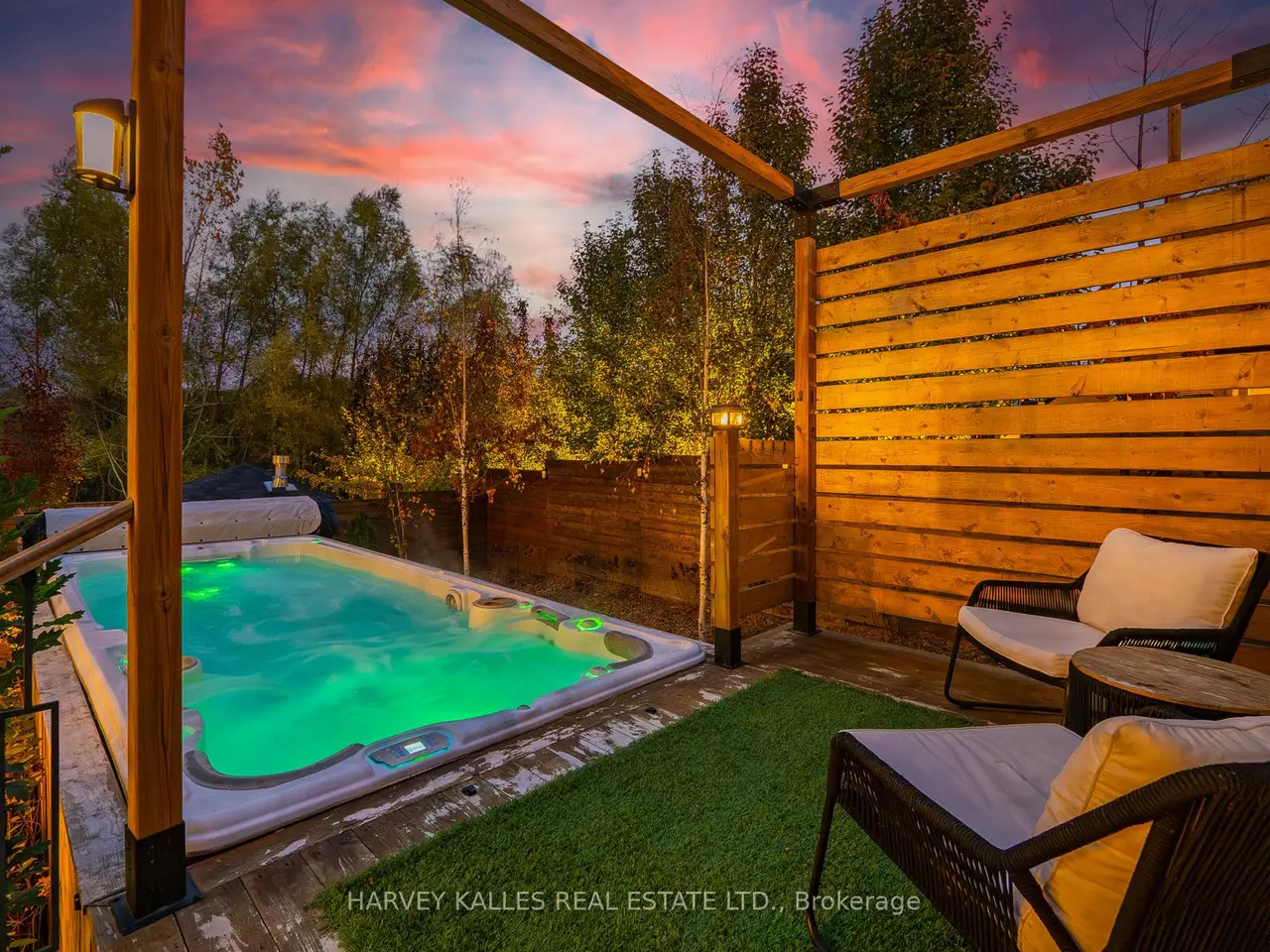 Welcome to this exceptional Riverwood residence - a luxurious 4-bedroom, 4-bathroom home built in 2019, set on a beautiful ravine lot surrounded by mature trees in one of Georgetown's most desirable neighbourhoods. Offering over 3,400 sq. ft. of elegant living space, this home combines refined craftsmanship with modern comfort, just minutes from Hwy 401, downtown Georgetown, community centres, and excellent schools. The heart of the home is a Custom Cameo kitchen showcasing Wolf gas range, Wolf wall steam oven, Wolf built-in coffee system, Sub-Zero fridge/freezer/wine fridge, Asko dishwasher, Caesarstone countertops and backsplash, and a Sirius ventilation hood - truly a chef's dream. Enjoy 10-ft ceilings on the main floor, 9-ft ceilings upstairs and in the basement, plaster waffle ceilings, elegant trim and crown moldings, and hand-scraped engineered hardwood floors throughout. Luxurious touches include heated bathroom floors, double-sink vanities, custom closet organizers in every bedroom, and custom window blinds. The walk-out basement is drywalled with all electrical and flooring completed, rough-in ready for a 5th bathroom, and awaits your final finishes. Step outside to a maintenance-free landscape oasis featuring Park Royale Bellaturf, Unilock interlocking, a horizontal white cedar fence, expansive waterproof composite deck with spiral staircase, and a Hydropool 19-ft year-round swim spa with a brand-new rollaway cover. Additional highlights include a hardwired Hikvision security system with three-week memory, built-in ceiling speakers for surround sound, and hot & cold water bibs in the garage. This meticulously designed home offers the perfect balance of luxury, privacy, and convenience - a rare opportunity in one of Georgetown's most sought-after communities.