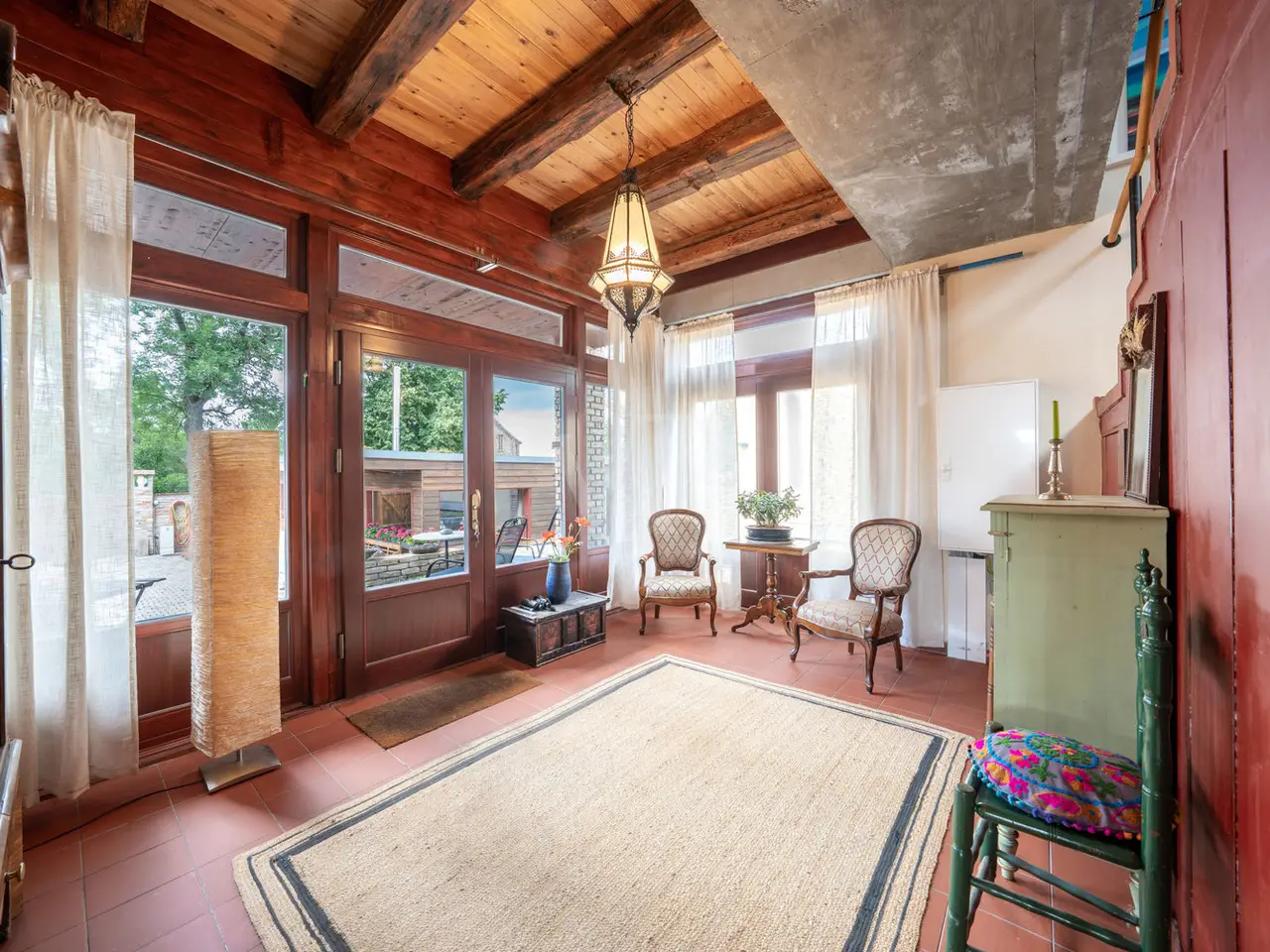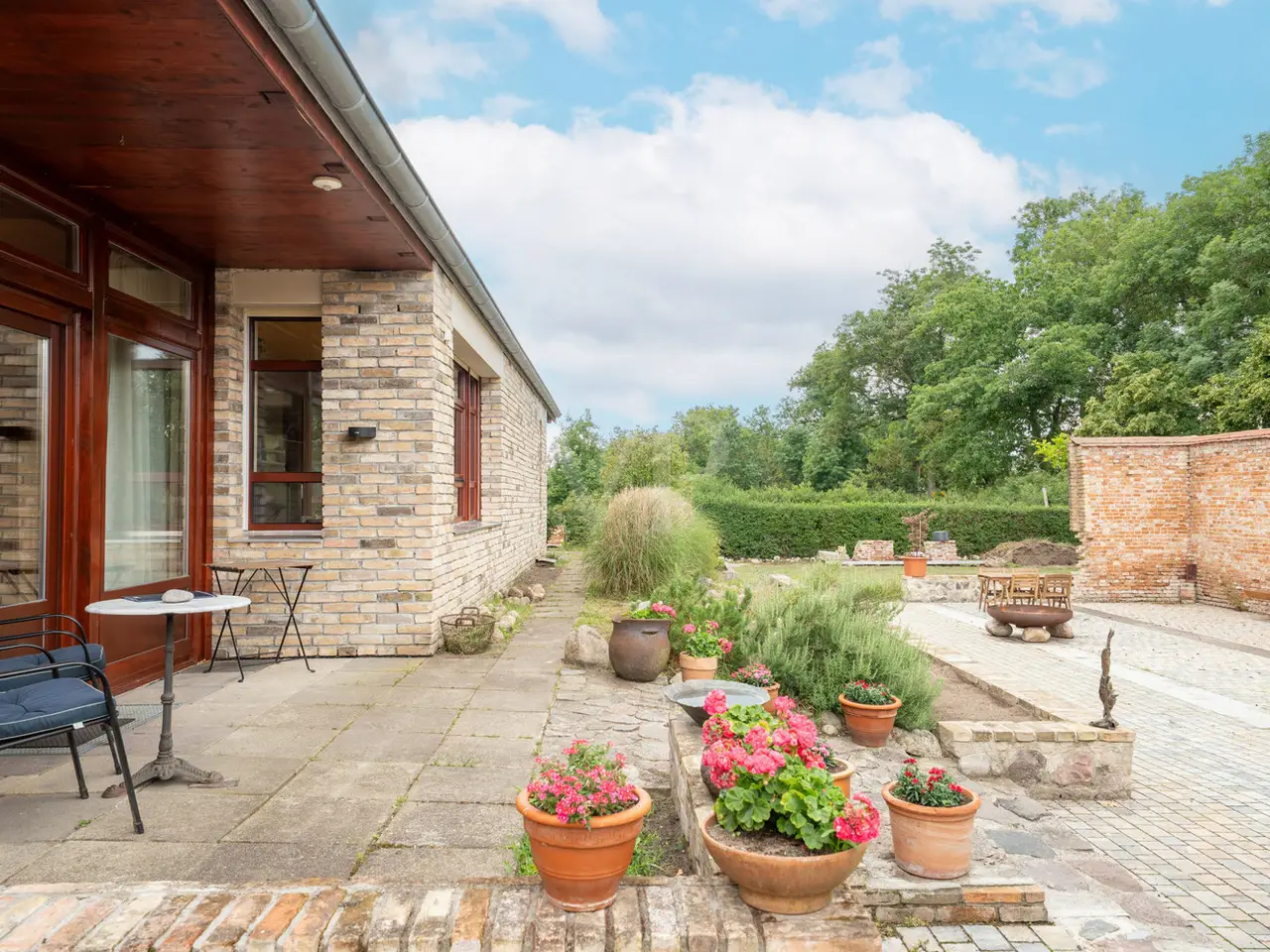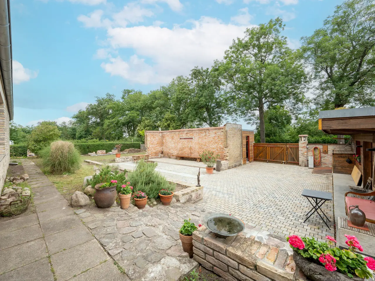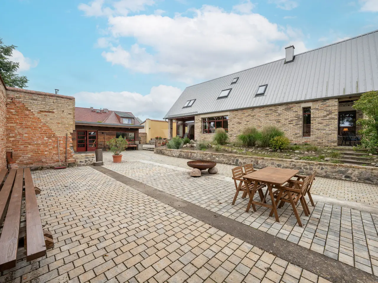 This impressive 923 m² courtyard and garden property is just a 25-minute drive south of Berlin and Potsdam. Nestled in the protected Nuthe-Nieplitz nature park, it offers a peaceful, natural environment. The location creates a fascinating contrast to the urban density of the cities and invites you to enjoy nature in all its beauty. A place that combines peace, nature and space. From the street, you enter the property via a paved entrance courtyard, which was designed in the style of the historic three-sided courtyards in the neighborhood. This is reflected in the courtyard development and the building materials used. A wide fieldstone staircase leads up to the main house, which was built about one meter above the ground to enhance the sweeping views of the landscape. This exceptional architect-designed house, which was built in 2017, harmoniously combines modern construction quality with traditional elements and impresses with its high-quality workmanship and flexible floor plan. With around 183 m² of living space and around 90 m² of usable space, this property offers plenty of room for individual living, working and development. The solidly built house combines modern energy efficiency with charming details. Energy efficiency class A ensures low operating costs, while inside, a harmonious blend of historic wooden beams and exposed concrete in the ceilings creates a special atmosphere. Large windows with triple glazing and shutters allow plenty of light into the home. The south-west orientation makes it possible to experience the changing rhythm of sunlight in a subtle way. Sustainable energy is provided by a solar thermal system, underfloor heating and a double-sided wood-burning stove, which can optionally provide additional heat via an adjustable opening in the attic. A fiber optic connection is available. The heart of this house is the first floor with its spacious open-plan living and dining area, which flows seamlessly into the terrace and garden. There is also a small home office, a barrier-free shower room, a timeless kitchen and a practical kitchen pantry. Warm real wood oak floorboards and clay plaster on the ceilings and walls create a cozy atmosphere. A wide staircase takes you to the top floor, which impresses with its exposed carpentry. Here you will find two loft rooms for living and sleeping, a dressing room, the utility area and a bathroom with bathtub. The offset timber and glass façade also offers a wonderful view of the unobstructed landscape. The space on offer is complemented by an approx. 60 m² heated coach house, which can be used as an office, guest house, sauna or fitness room, as well as an approx. 30 m² workshop, which serves as a utility building or cellar replacement room. The well-kept outdoor area is lovingly landscaped: The so-called "ruin courtyard" with seating walls and a U-shaped brick wall serves as a wind-protected retreat and is complemented by a small, sheltered patio courtyard as well as covered alcoves that can be used for both sunny and shady stays. The property boundary is bordered by historic brickwork, hedges and a picket fence. Exterior lighting with motion detectors creates a cozy atmosphere, while roof drainage is provided by two retention and soakaways in the courtyard and garden area. There are also two garden water connections. There is ample space for vehicles and there is the option of building a large carport. This house harmoniously combines old and new, high-quality craftsmanship, authentic materials and modern living quality. It is a home with character and a wide range of possible uses, which impresses with its special atmosphere and individual design.