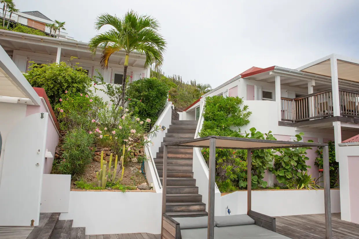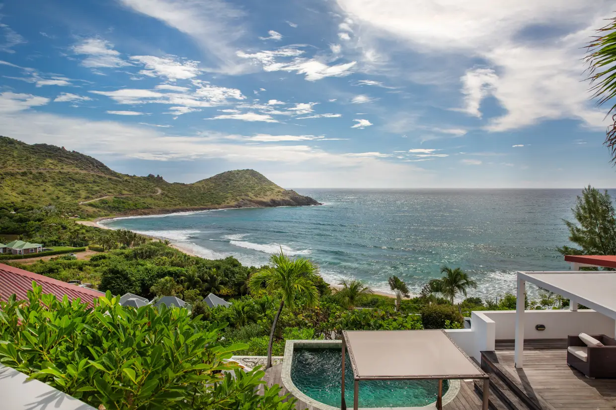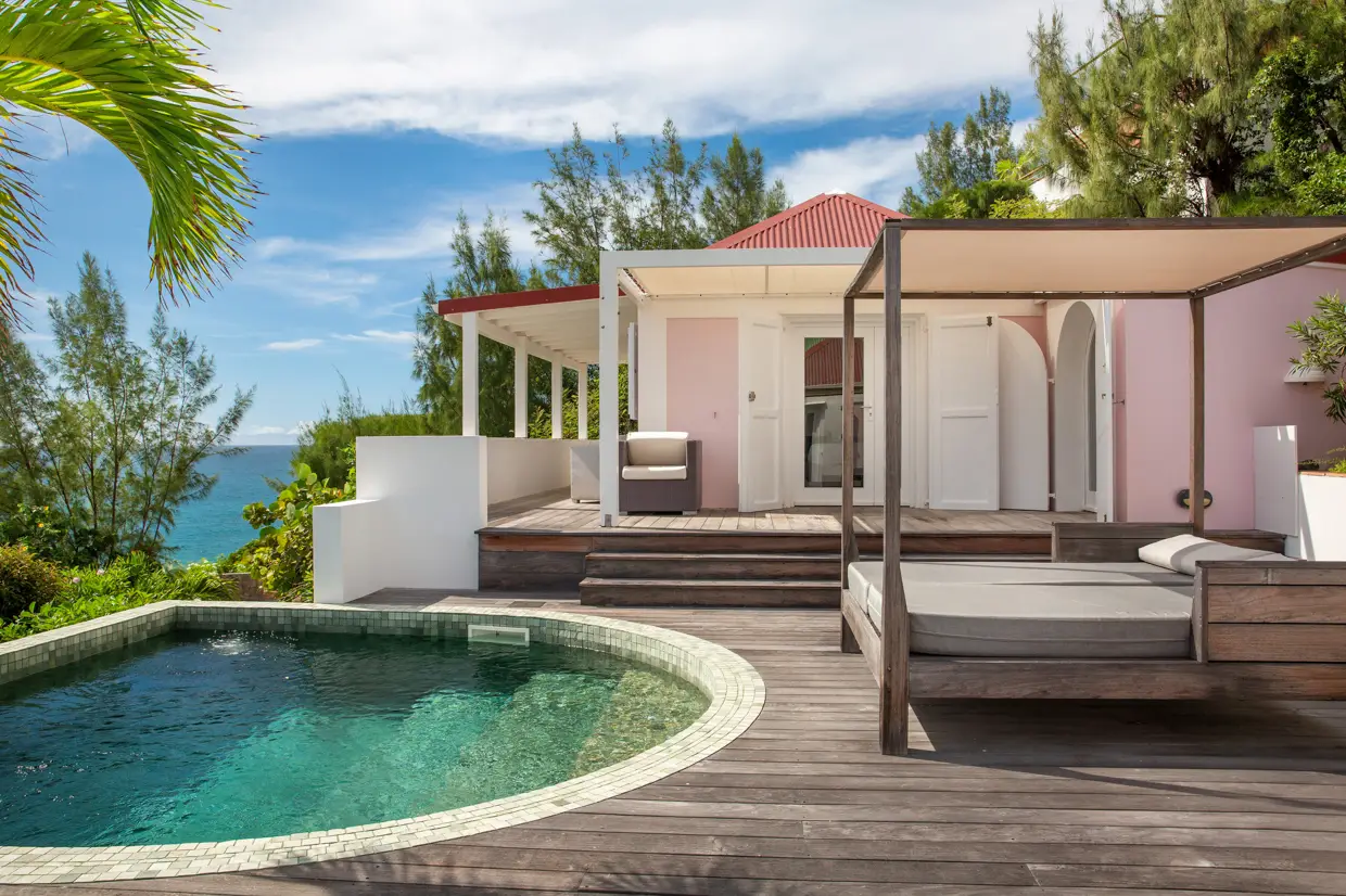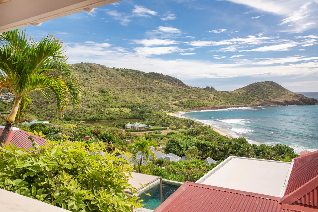 Ideally located in Toiny on a 0.41-acre plot, Villa Tangara enjoys easy walking access to the neighborhood’s beach, known for its waves and highly popular with surfers. This Caribbean-style property consists of several pastel pink bungalows spread over two levels, with a floor area of 2400.35 sq ft. It provides a peaceful and welcoming living environment. On the main level, the first bungalow features bright living spaces, with a lounge decorated with wood and rattan furniture, and a dining area. The room opens onto a fully-equipped kitchen on one side and a covered terrace on the other, offering magnificent panoramic views. A staircase leads up to the main terrace, where an elegant, curved swimming pool surrounded by tropical vegetation facing the ocean, inviting moments of relaxation. The sleeping area comprises three comfortable bedrooms, each in different bungalows, each with its own private bathroom. Two of them have covered terraces offering breathtaking views of the beach and ocean. This charming property has two parking areas, with space for a total of four vehicles. There is also potential for extension to meet future space requirements.