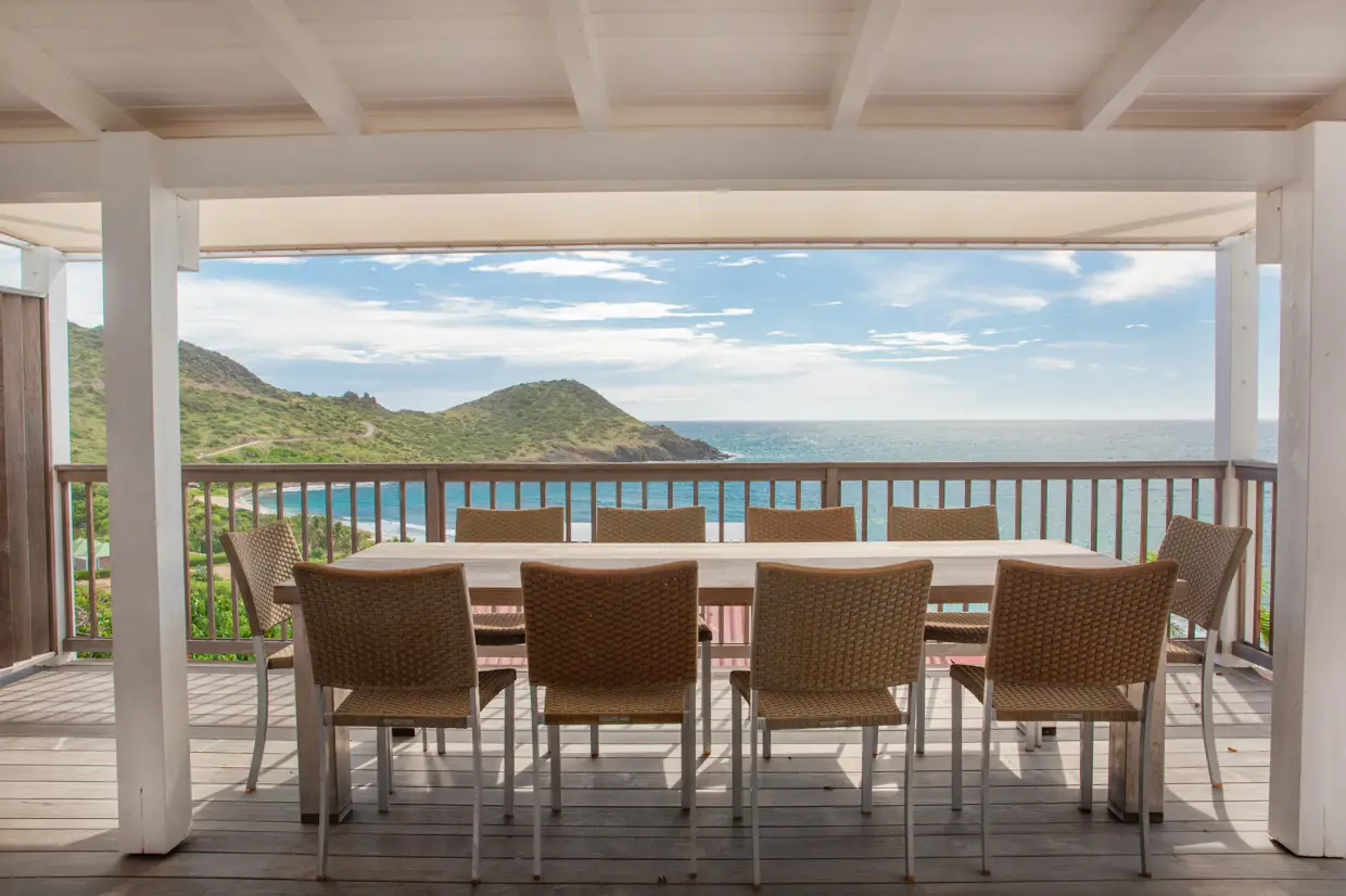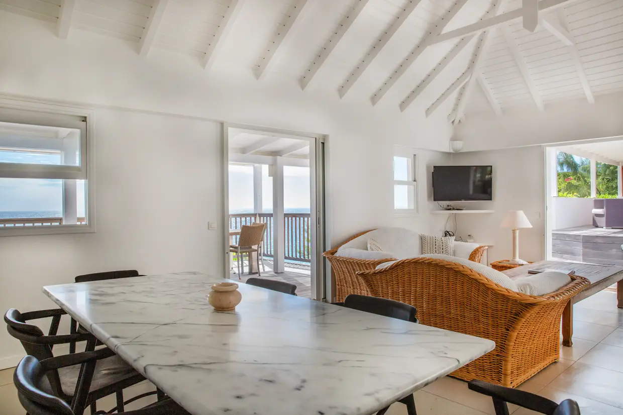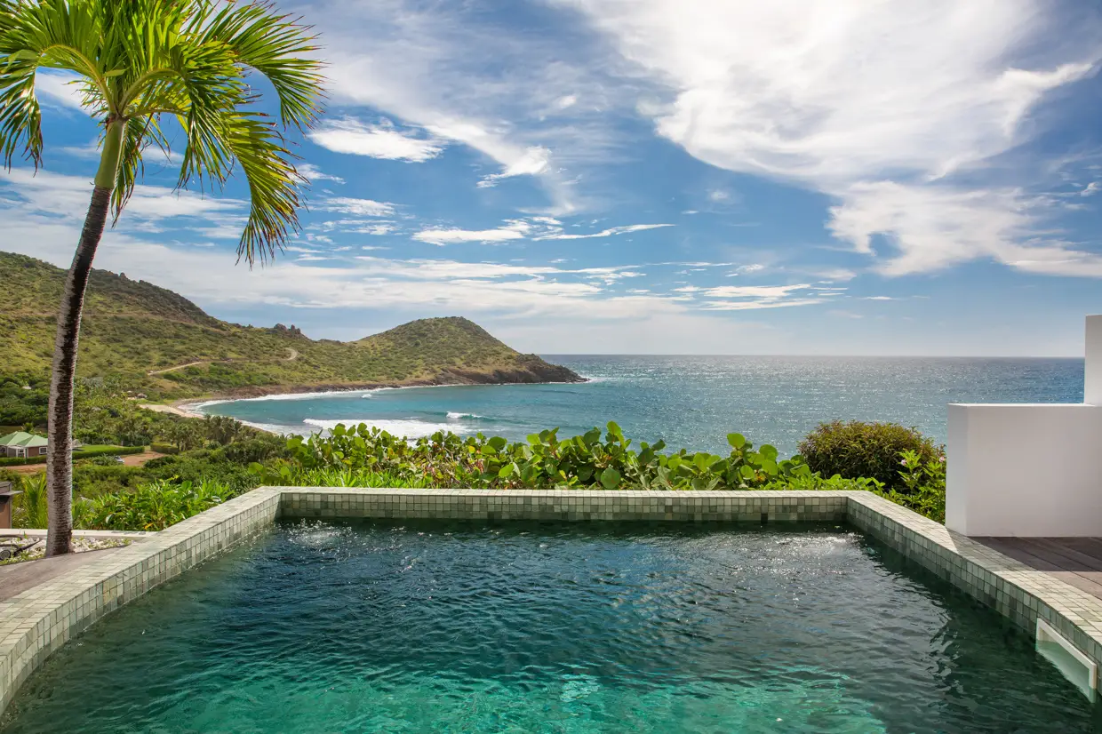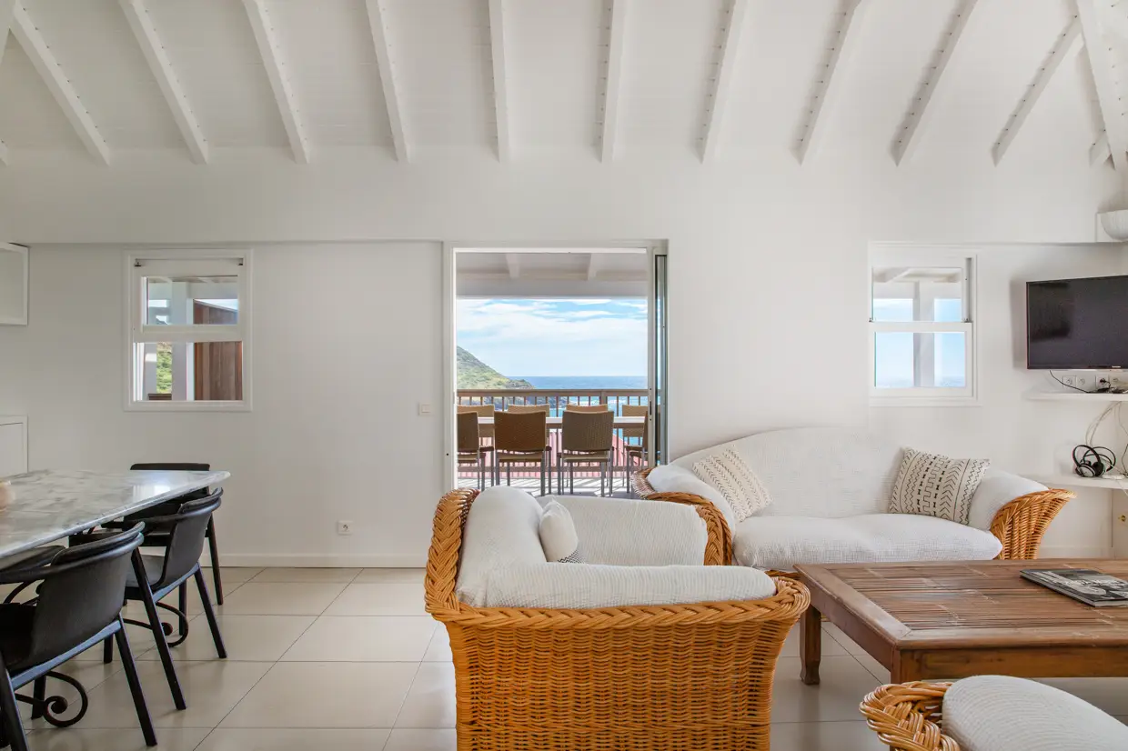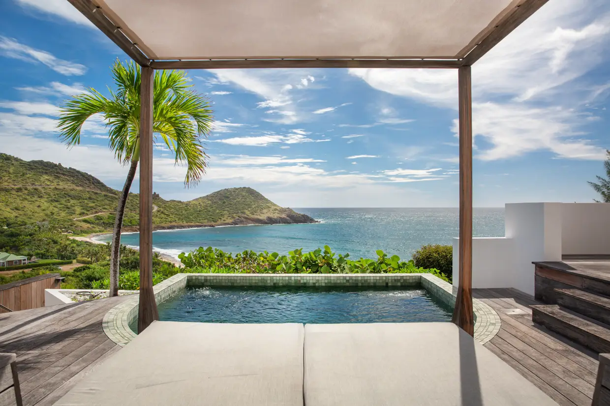 Ideally located in Toiny on a 0.41-acre plot, Villa Tangara enjoys easy walking access to the neighborhood’s beach, known for its waves and highly popular with surfers. This Caribbean-style property consists of several pastel pink bungalows spread over two levels, with a floor area of 2400.35 sq ft. It provides a peaceful and welcoming living environment. On the main level, the first bungalow features bright living spaces, with a lounge decorated with wood and rattan furniture, and a dining area. The room opens onto a fully-equipped kitchen on one side and a covered terrace on the other, offering magnificent panoramic views. A staircase leads up to the main terrace, where an elegant, curved swimming pool surrounded by tropical vegetation facing the ocean, inviting moments of relaxation. The sleeping area comprises three comfortable bedrooms, each in different bungalows, each with its own private bathroom. Two of them have covered terraces offering breathtaking views of the beach and ocean. This charming property has two parking areas, with space for a total of four vehicles. There is also potential for extension to meet future space requirements.