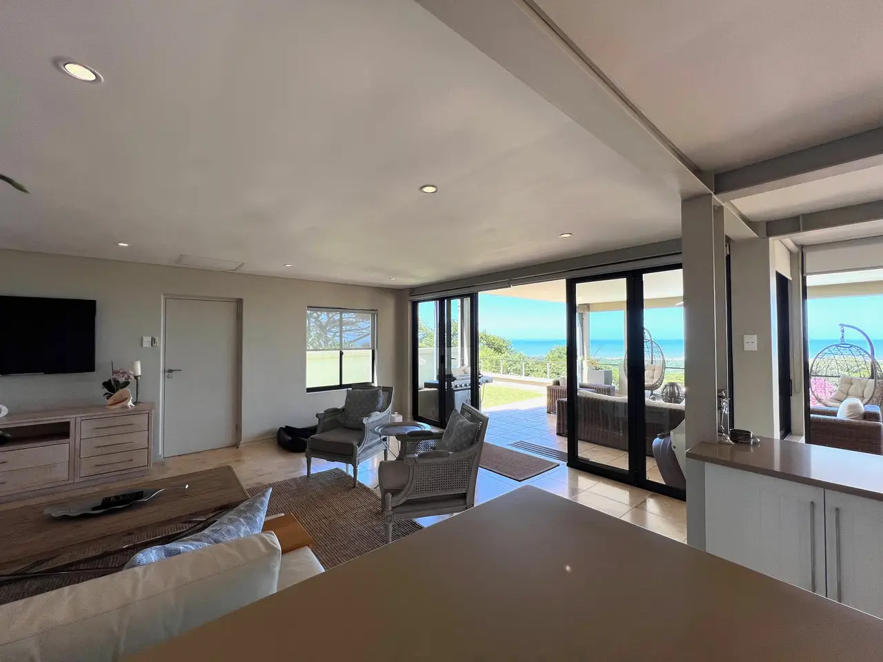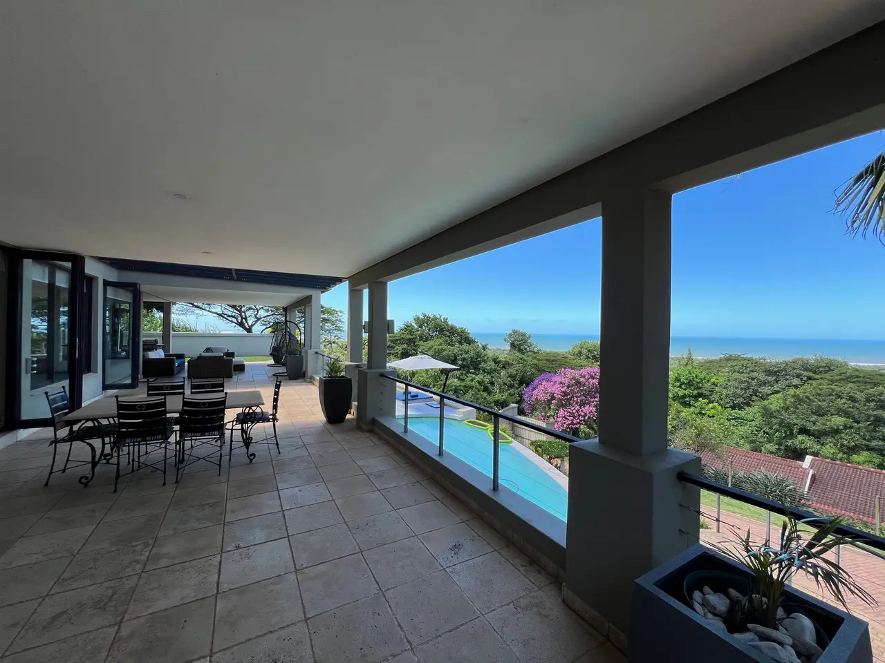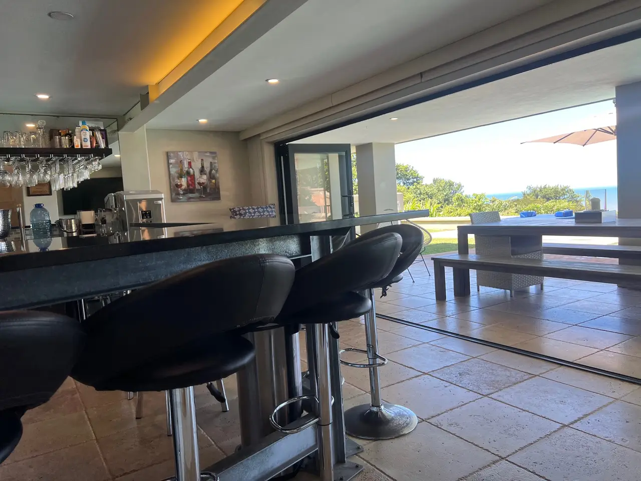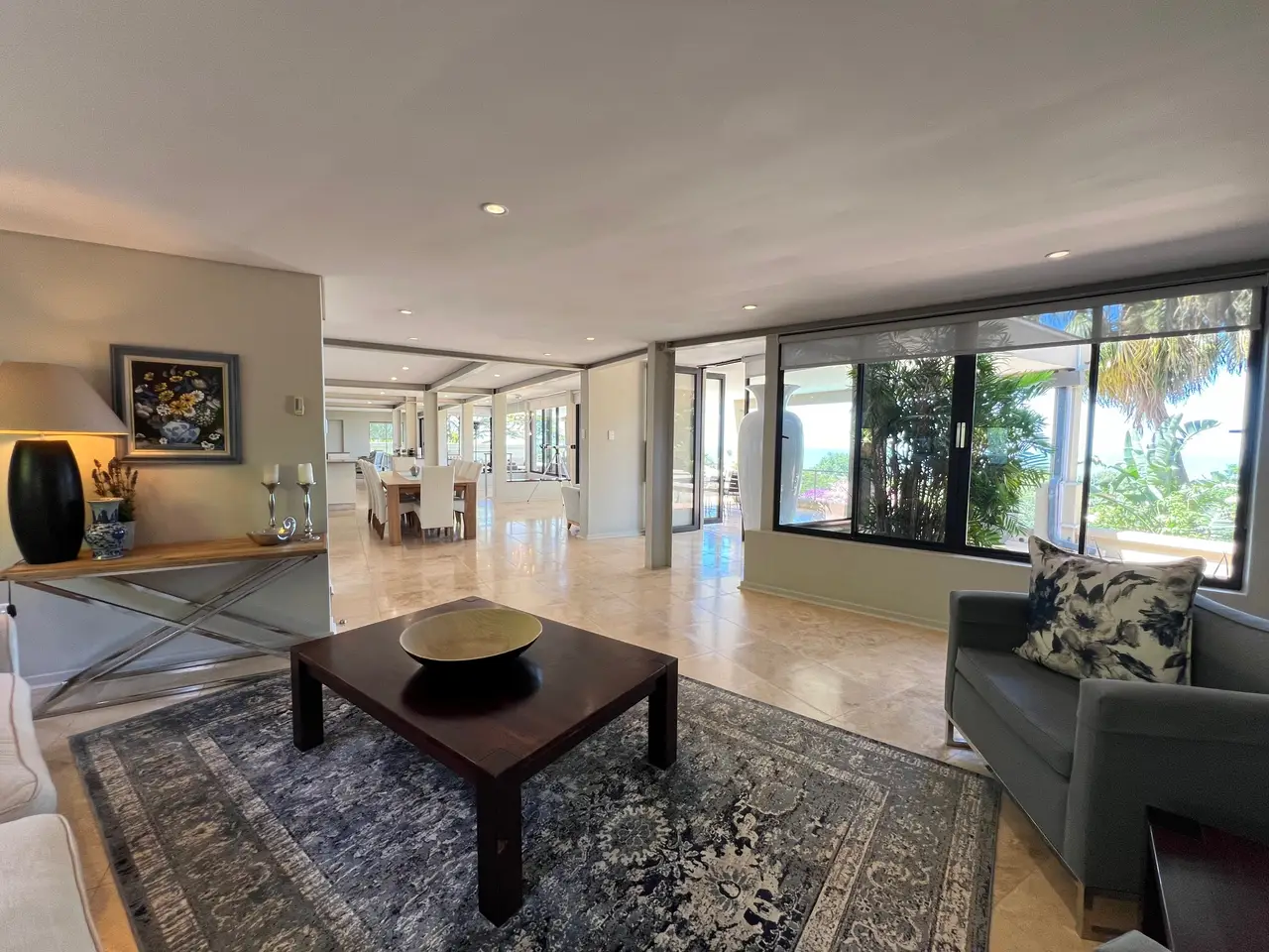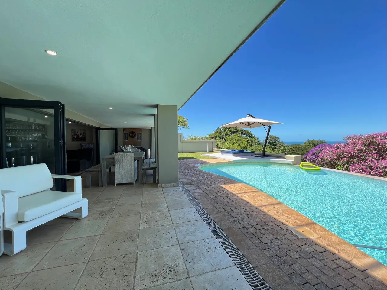 Exquisite architectural marvel boasting panoramic ocean views from every level and room, this prestigious property stands as a beacon of luxury in this sought-after coastal town. Featuring five bedrooms and five bathrooms, alongside separate staff quarters or a garden flat, this three-level residence epitomizes opulent coastal living. The heart of the home lies in its open-plan kitchen, seamlessly connecting to the lounge, dining, and family rooms, all of which extend to covered patio areas and a sparkling infinity swimming pool. Adding to the allure is a sophisticated bar and covered entertainment space, complemented by the pool changing room for added convenience. A well-appointed study or home office, complete with its own bathroom facilities, ensures functionality meets elegance. Additional highlights include a 5kW inverter system with lithium batteries and 14 solar panels, two solar geysers, air conditioning throughout, fitted block-out blinds and curtains, a storage room, and a 5000-liter water tank, further elevating the property's appeal and sustainability. There are also two extra-tall garages and a two-car carport, providing ample parking space for a boat or other vehicles. Optional: Furnished/Unfurnished.