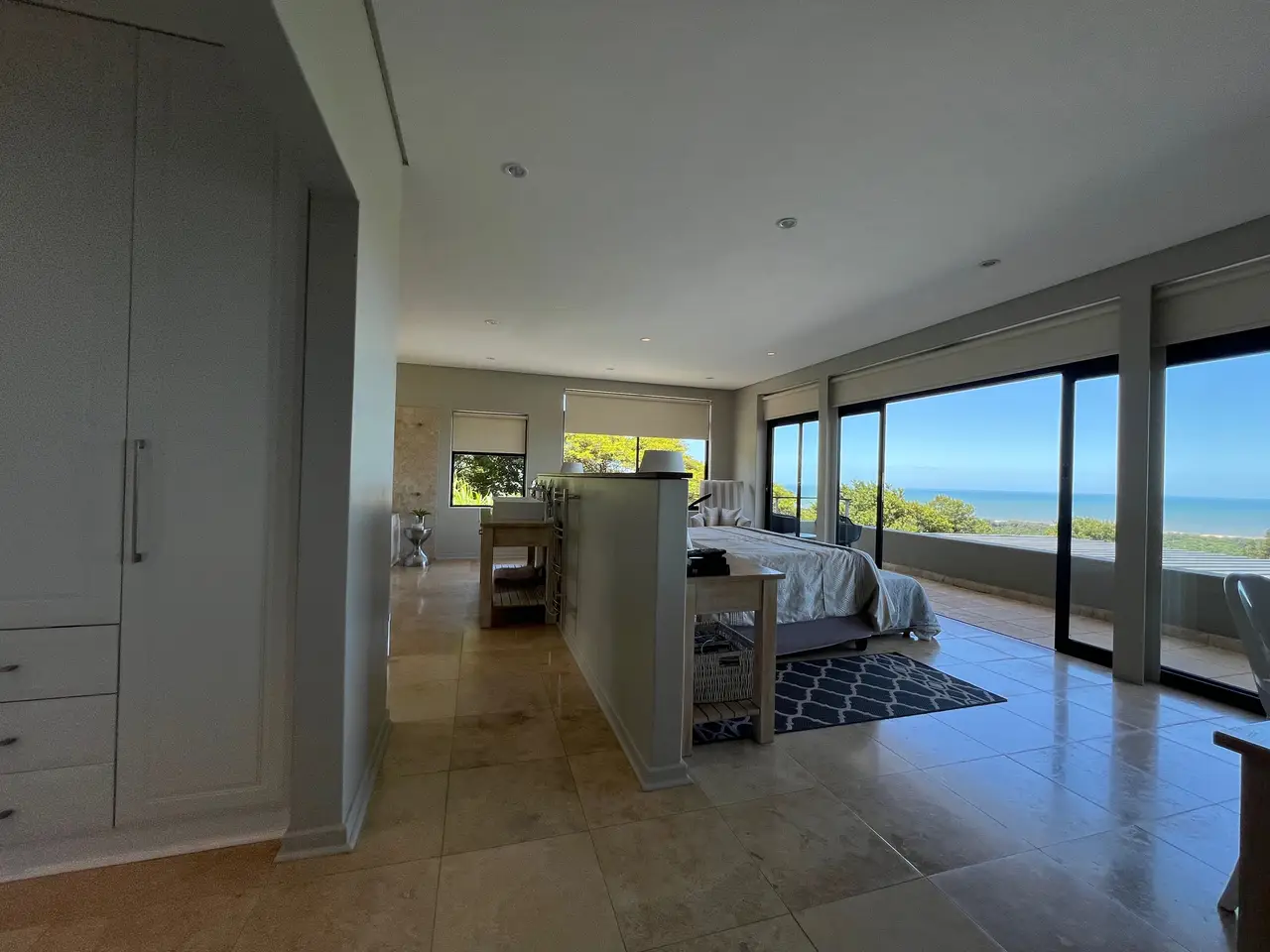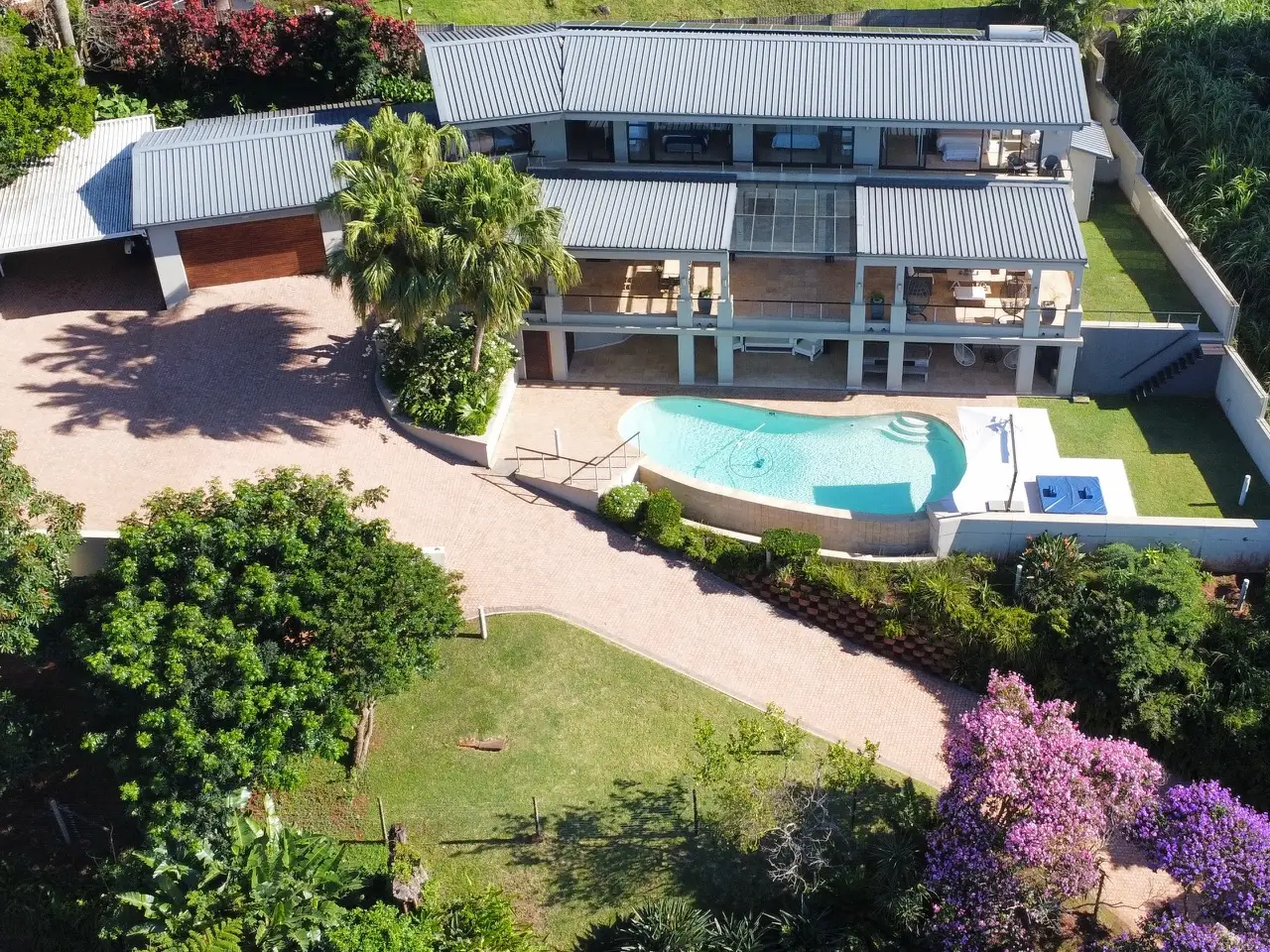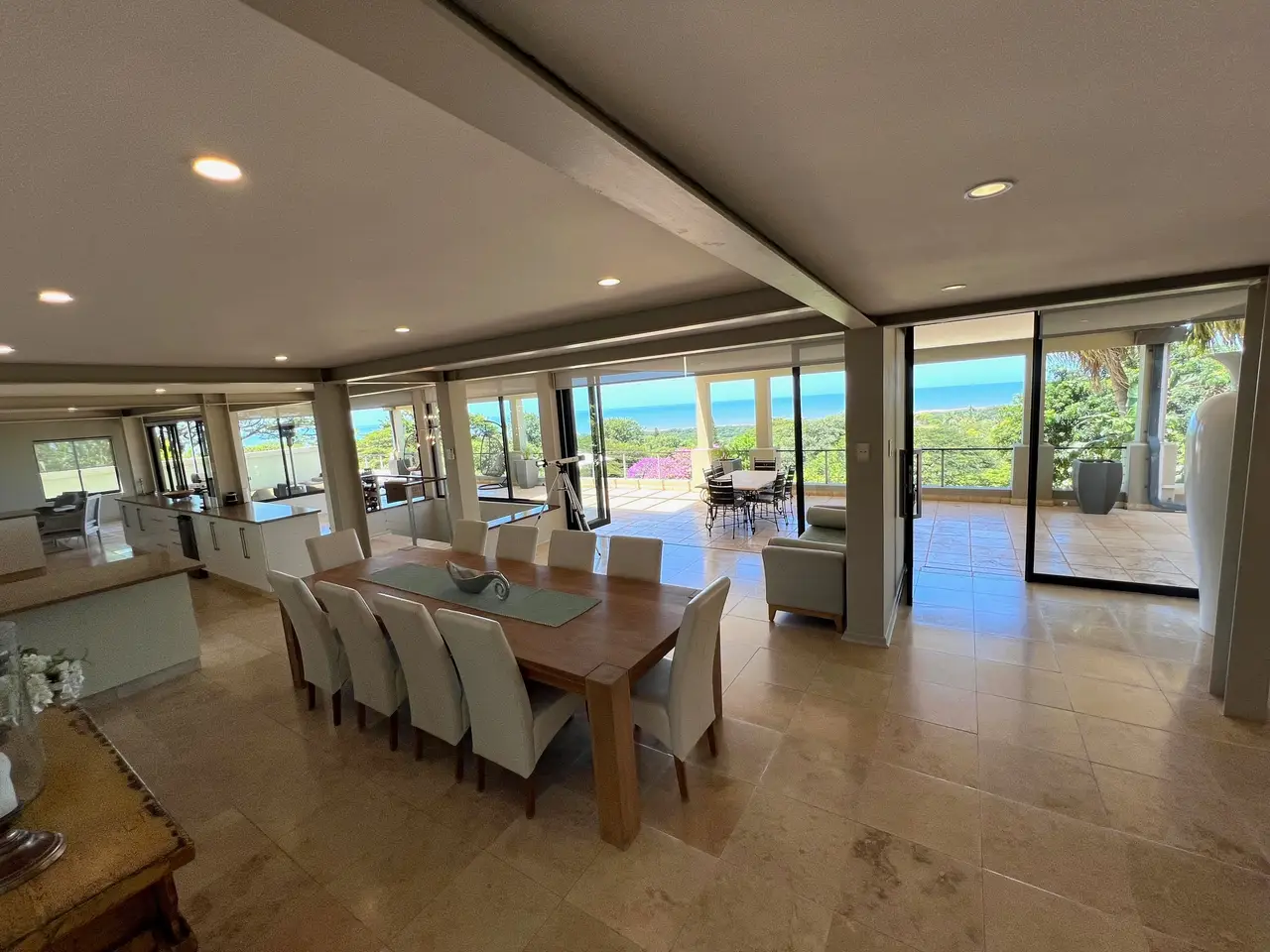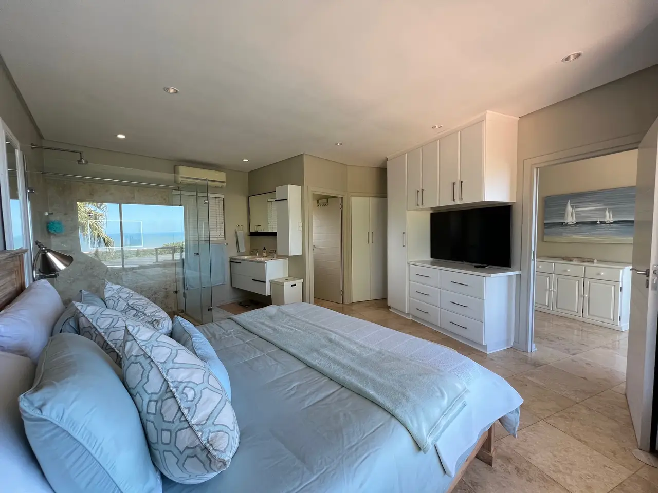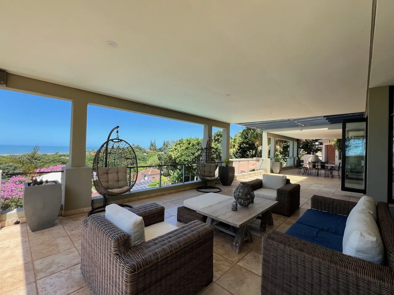 Exquisite architectural marvel boasting panoramic ocean views from every level and room, this prestigious property stands as a beacon of luxury in this sought-after coastal town. Featuring five bedrooms and five bathrooms, alongside separate staff quarters or a garden flat, this three-level residence epitomizes opulent coastal living. The heart of the home lies in its open-plan kitchen, seamlessly connecting to the lounge, dining, and family rooms, all of which extend to covered patio areas and a sparkling infinity swimming pool. Adding to the allure is a sophisticated bar and covered entertainment space, complemented by the pool changing room for added convenience. A well-appointed study or home office, complete with its own bathroom facilities, ensures functionality meets elegance. Additional highlights include a 5kW inverter system with lithium batteries and 14 solar panels, two solar geysers, air conditioning throughout, fitted block-out blinds and curtains, a storage room, and a 5000-liter water tank, further elevating the property's appeal and sustainability. There are also two extra-tall garages and a two-car carport, providing ample parking space for a boat or other vehicles. Optional: Furnished/Unfurnished.