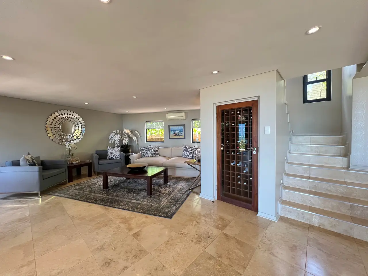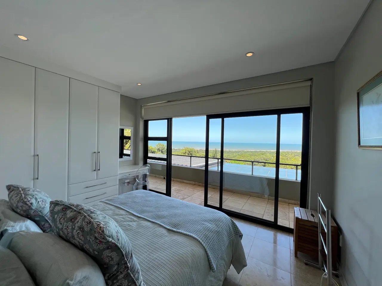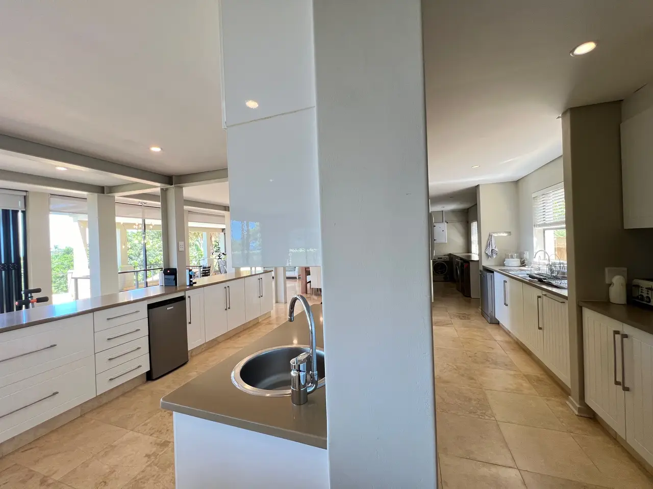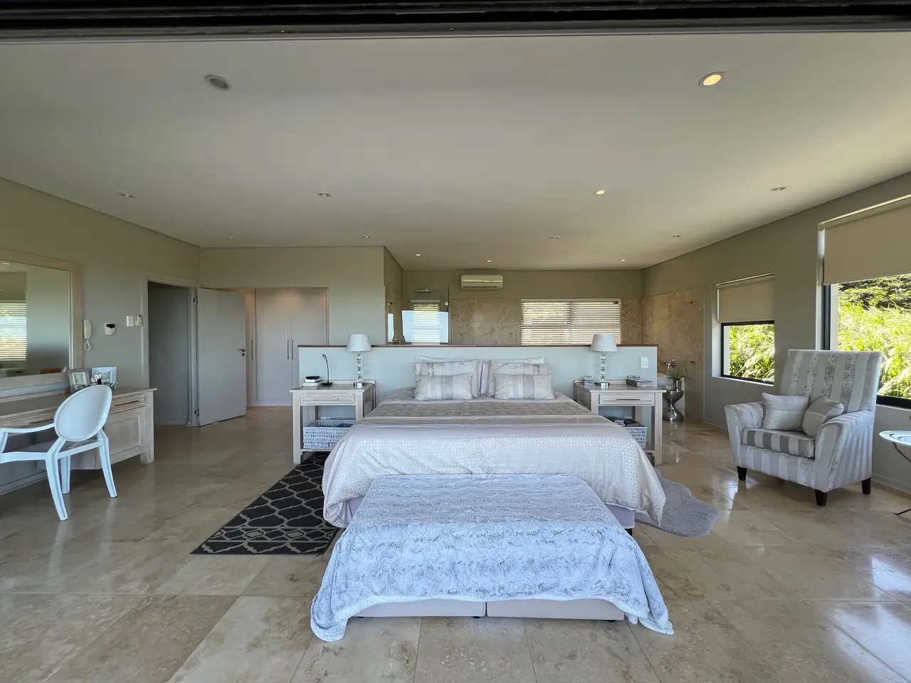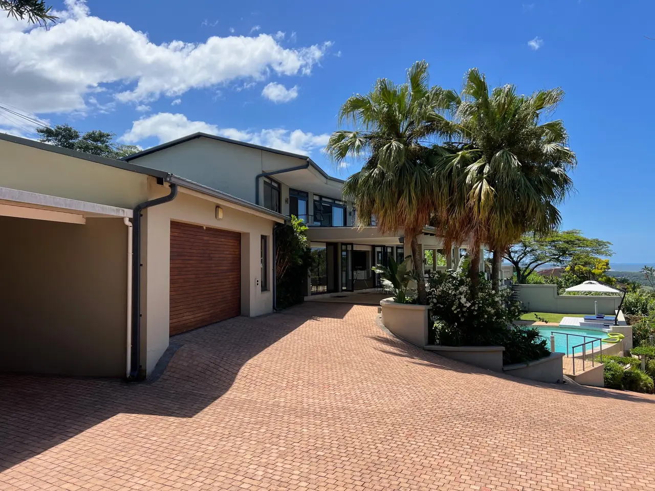 Exquisite architectural marvel boasting panoramic ocean views from every level and room, this prestigious property stands as a beacon of luxury in this sought-after coastal town. Featuring five bedrooms and five bathrooms, alongside separate staff quarters or a garden flat, this three-level residence epitomizes opulent coastal living. The heart of the home lies in its open-plan kitchen, seamlessly connecting to the lounge, dining, and family rooms, all of which extend to covered patio areas and a sparkling infinity swimming pool. Adding to the allure is a sophisticated bar and covered entertainment space, complemented by the pool changing room for added convenience. A well-appointed study or home office, complete with its own bathroom facilities, ensures functionality meets elegance. Additional highlights include a 5kW inverter system with lithium batteries and 14 solar panels, two solar geysers, air conditioning throughout, fitted block-out blinds and curtains, a storage room, and a 5000-liter water tank, further elevating the property's appeal and sustainability. There are also two extra-tall garages and a two-car carport, providing ample parking space for a boat or other vehicles. Optional: Furnished/Unfurnished.