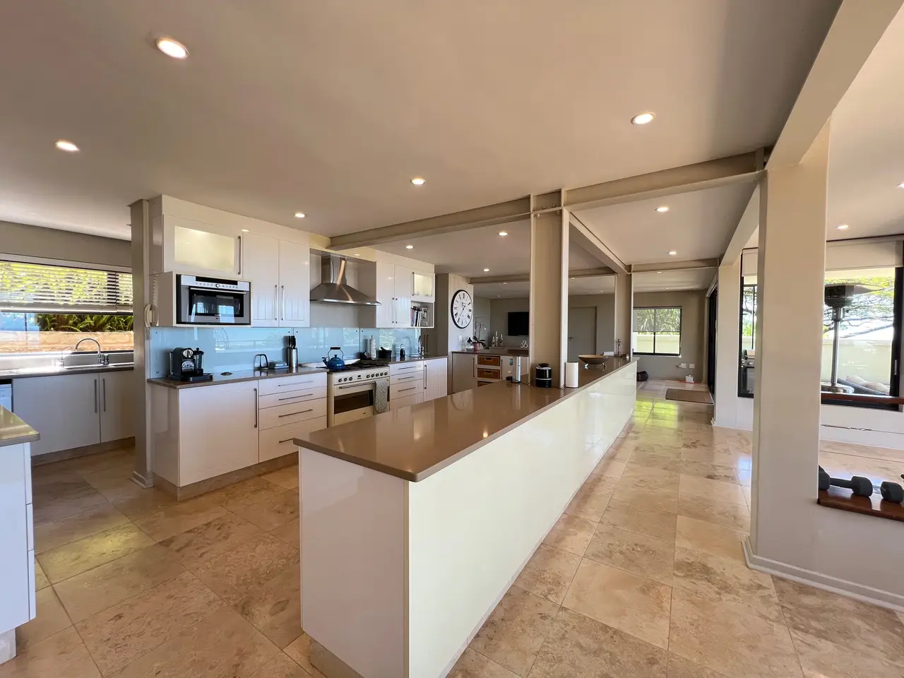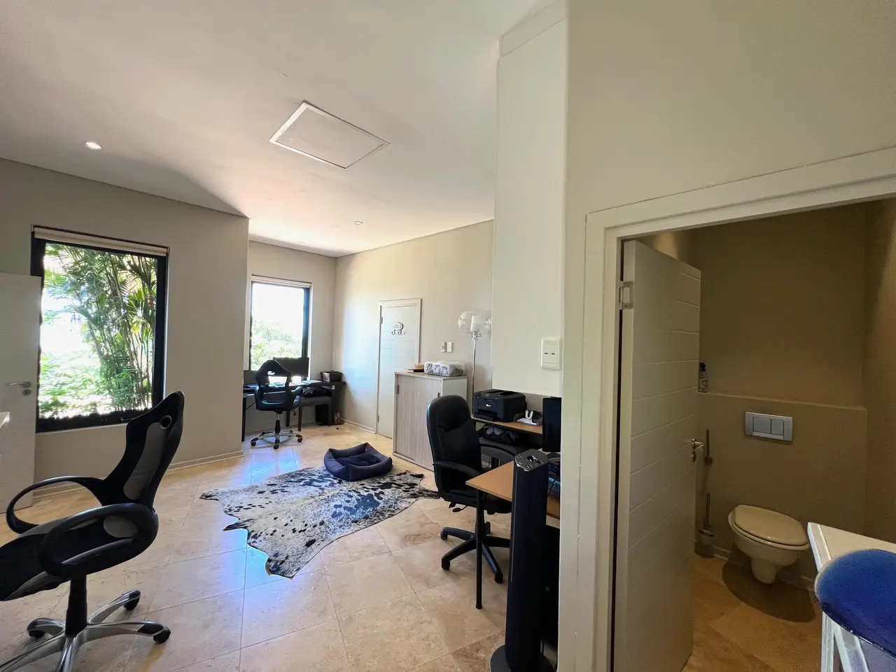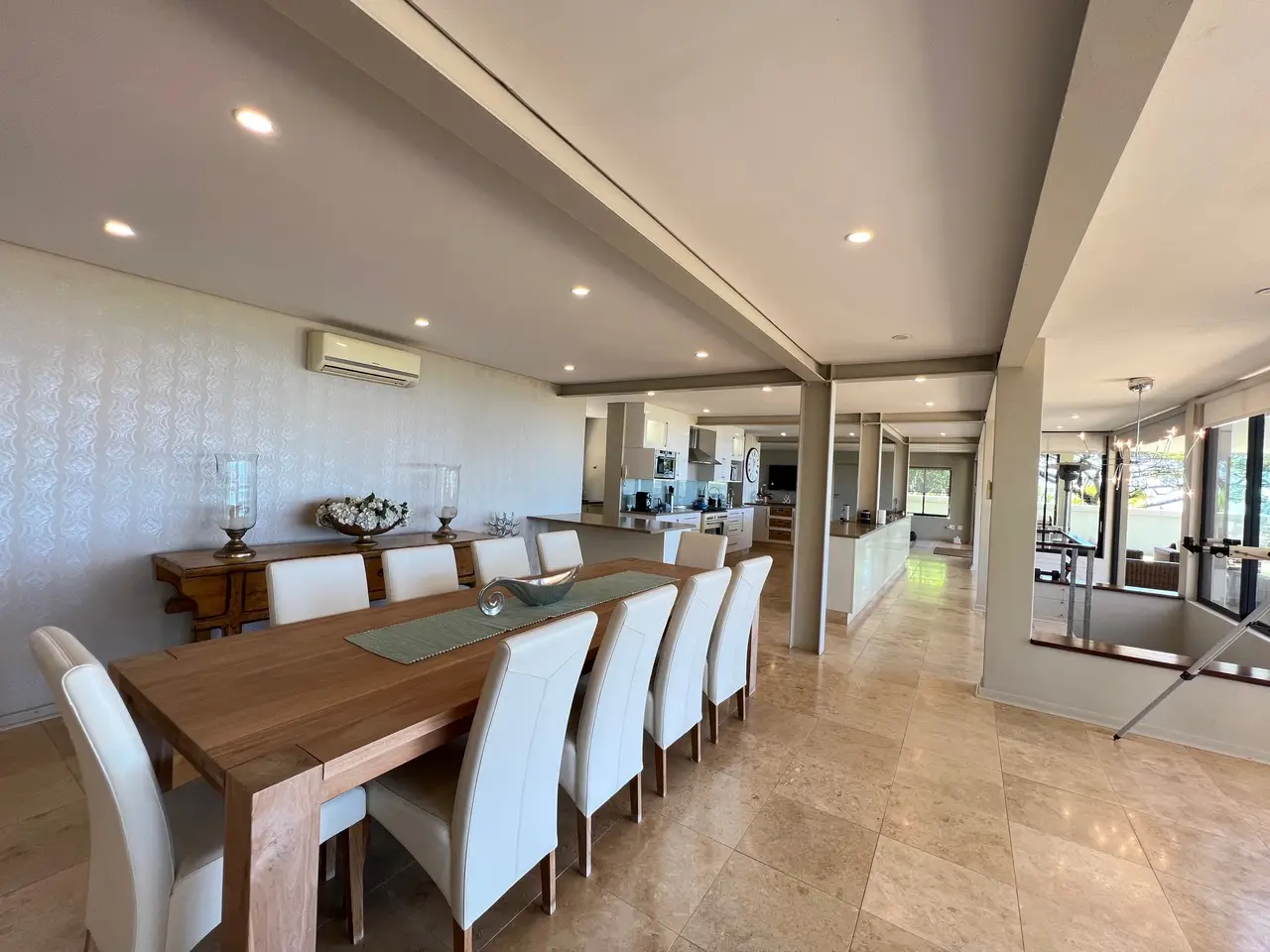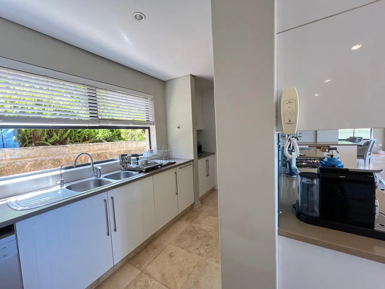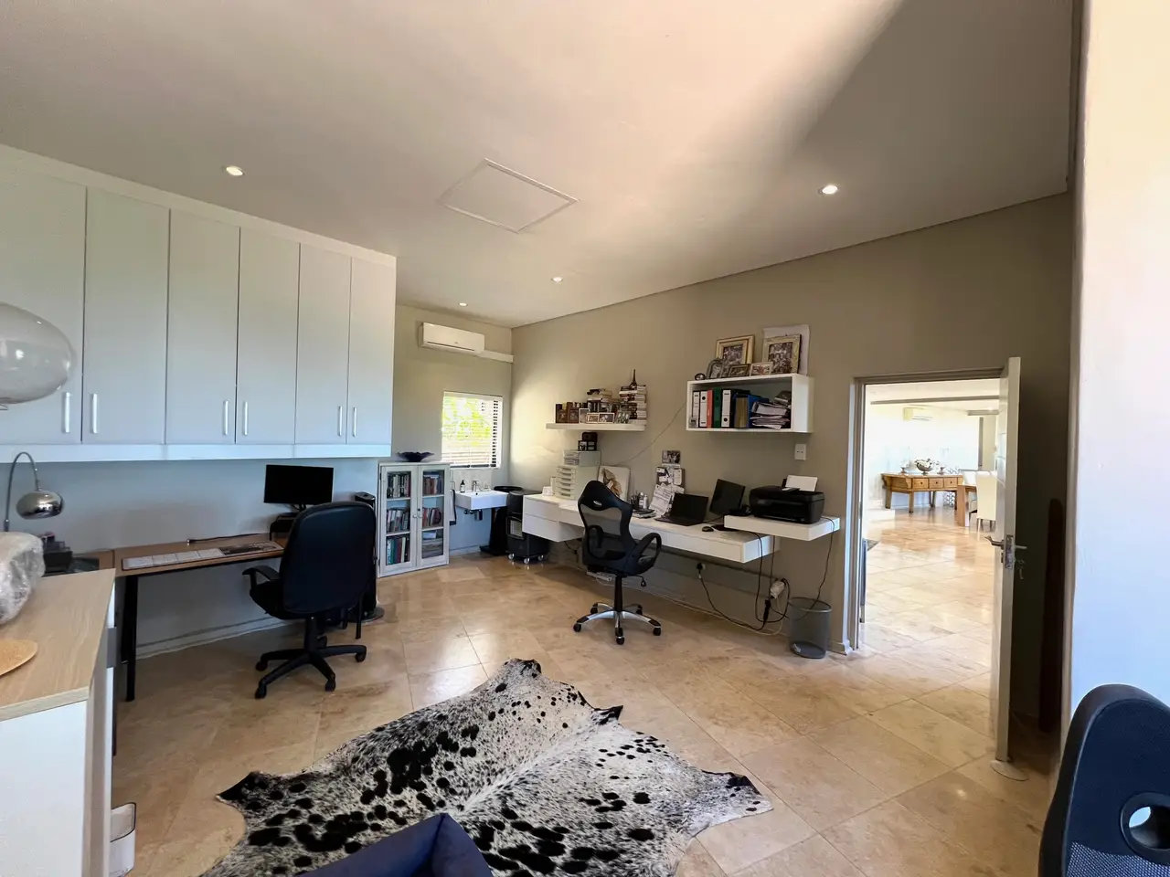 Exquisite architectural marvel boasting panoramic ocean views from every level and room, this prestigious property stands as a beacon of luxury in this sought-after coastal town. Featuring five bedrooms and five bathrooms, alongside separate staff quarters or a garden flat, this three-level residence epitomizes opulent coastal living. The heart of the home lies in its open-plan kitchen, seamlessly connecting to the lounge, dining, and family rooms, all of which extend to covered patio areas and a sparkling infinity swimming pool. Adding to the allure is a sophisticated bar and covered entertainment space, complemented by the pool changing room for added convenience. A well-appointed study or home office, complete with its own bathroom facilities, ensures functionality meets elegance. Additional highlights include a 5kW inverter system with lithium batteries and 14 solar panels, two solar geysers, air conditioning throughout, fitted block-out blinds and curtains, a storage room, and a 5000-liter water tank, further elevating the property's appeal and sustainability. There are also two extra-tall garages and a two-car carport, providing ample parking space for a boat or other vehicles. Optional: Furnished/Unfurnished.