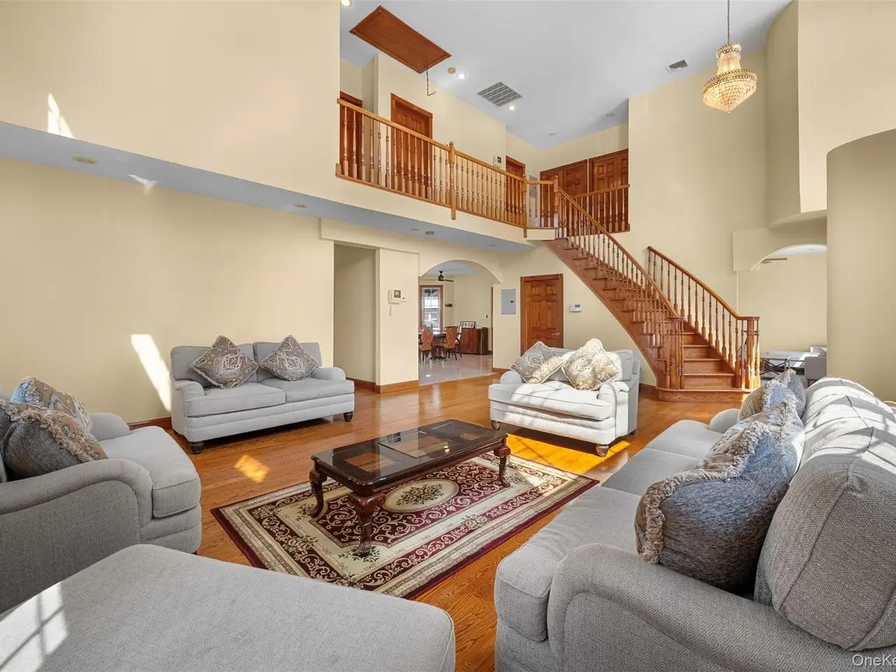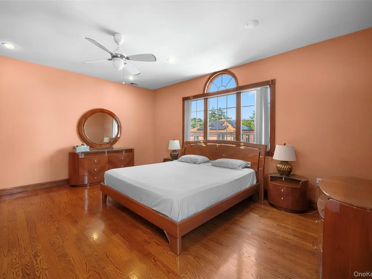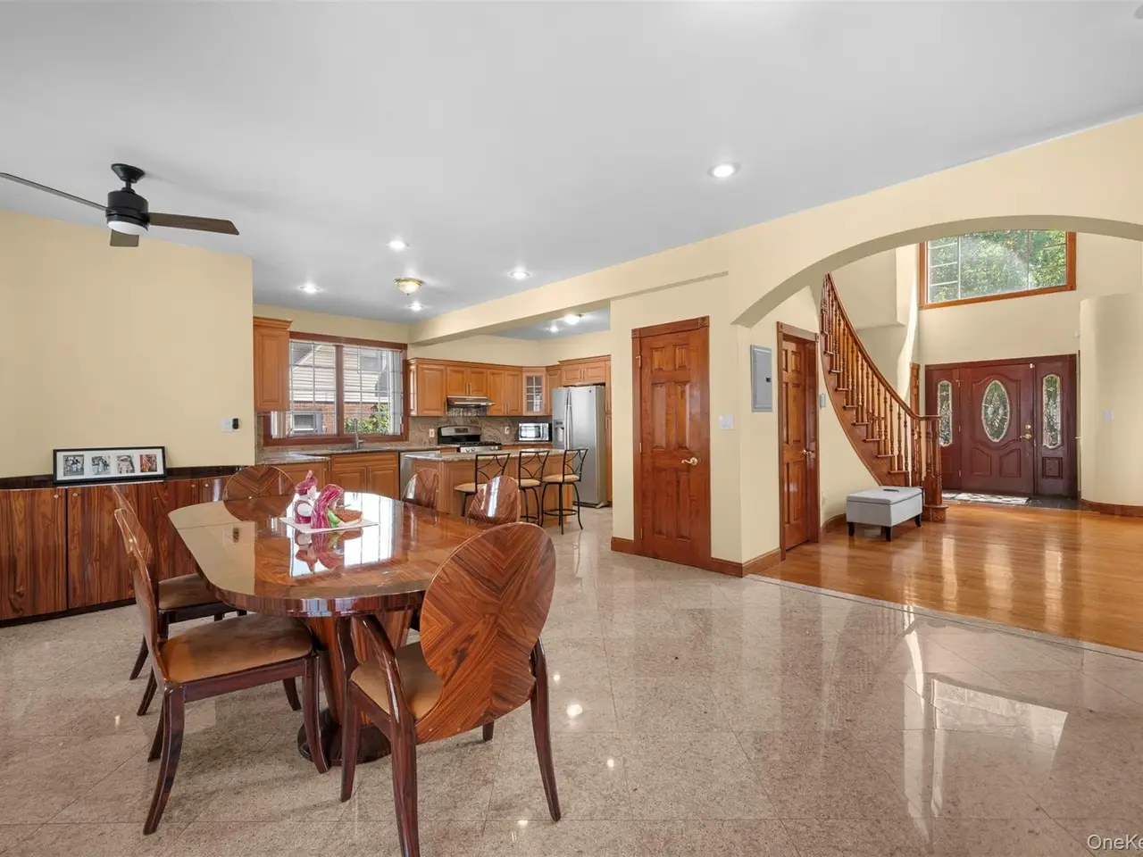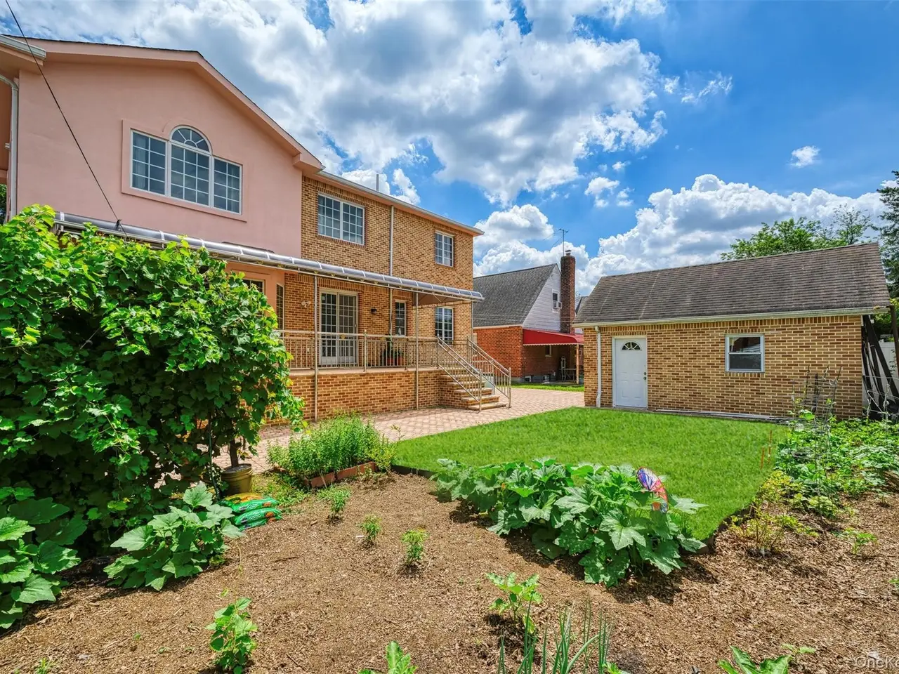 This beautifully reimagined custom brick home with soaring columns offers luxurious living with modern updates from the ground up, situated on a 60x100 lot. Boasting 3,105 sq ft of refined space, this residence features five spacious bedrooms and three and a half bathrooms, including a first-floor bedroom perfect for guests or generational living. Step into the formal living room adorned with oversized Anderson windows, two elegant chandeliers, and a grand circular staircase. Designed with ample natural light, the space is surrounded by large windows that let sunlight pour in throughout the day. The open layout and bright ambiance make this living room an ideal setting for relaxing, entertaining, or spending quality time with loved ones. Custom-made doors throughout the home add unique charm and craftsmanship. Step into a beautifully lit family room that radiates warmth and comfort. Elegant arched walkways lead in and out of the room, adding architectural character and a soft flow between living spaces. The chef's kitchen is a dream, featuring custom cabinetry, granite countertops, stainless steel appliances, and a sunny eat-in area. The formal dining room is ideal for entertaining with French doors opens to a rear deck with awning, leading to a private backyard. Upstairs, find four generously sized bedrooms. The primary suite offers a spa-like retreat with a soaking tub, walk-in closets, and ample natural light. The fully finished tiled basement adds valuable space with a rec room, surround sound, half bath, laundry room, utility room, and private access to the backyard. Additional features include hardwood floors and recessed lighting throughout, two-zone central heating system, an elegant design with modern conveniences, an ADT security system, and close proximity to schools, parks, shopping, transportation, and houses of worship. This is more than a house - it's a place to call home.