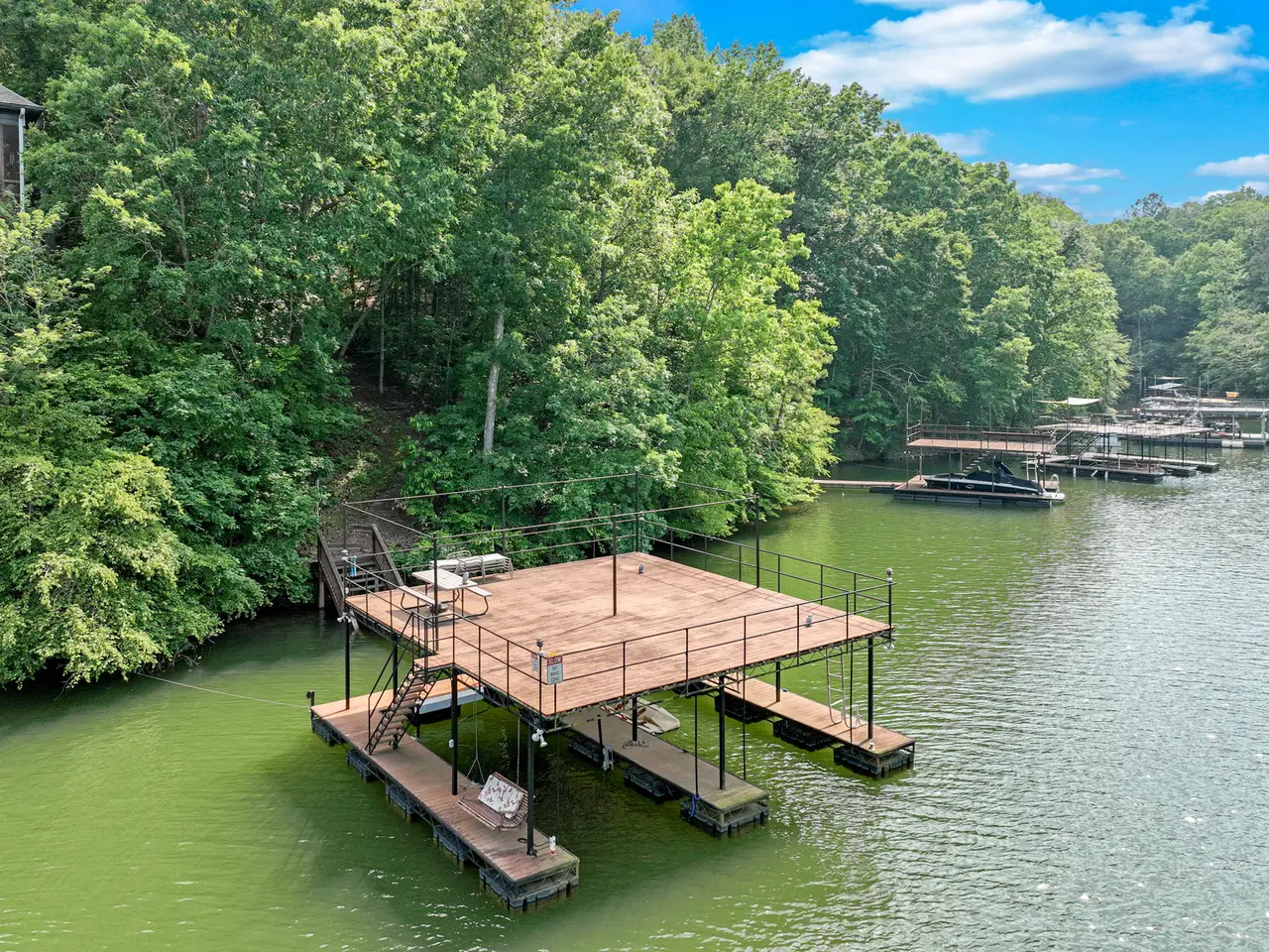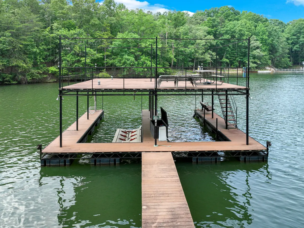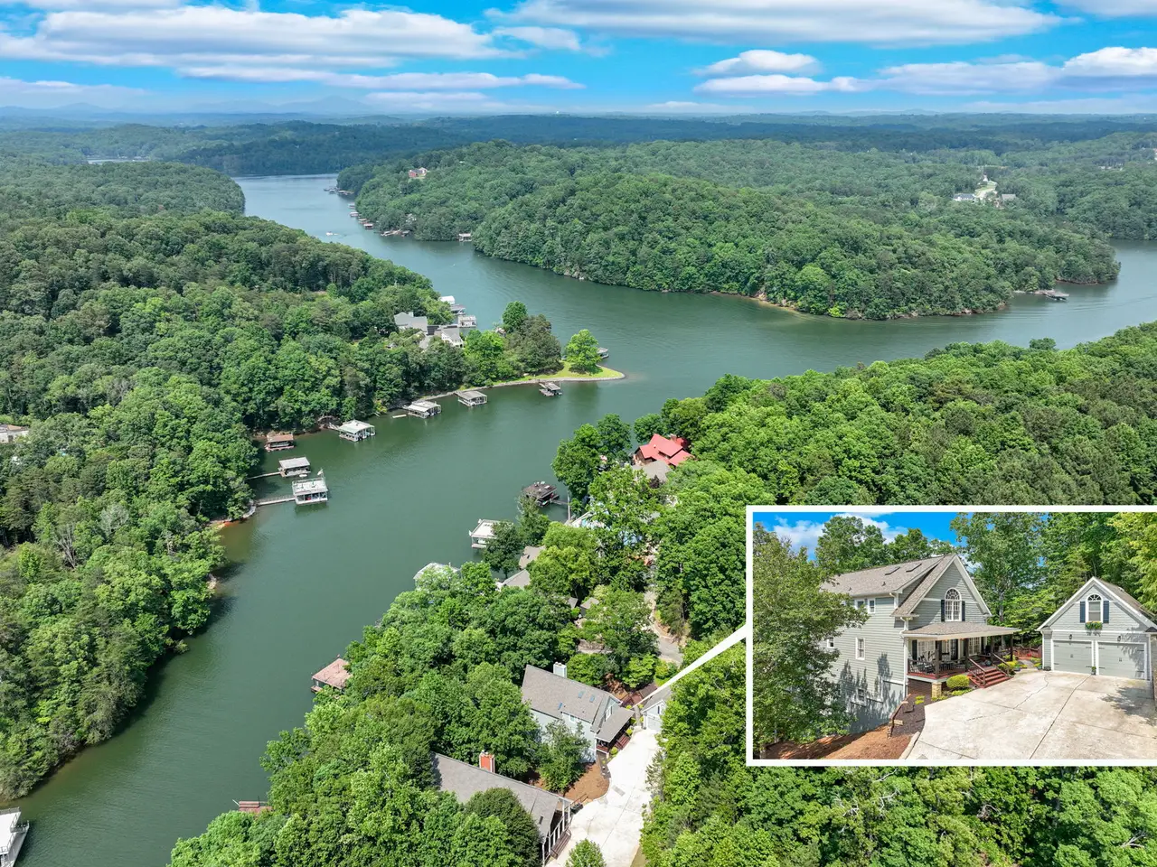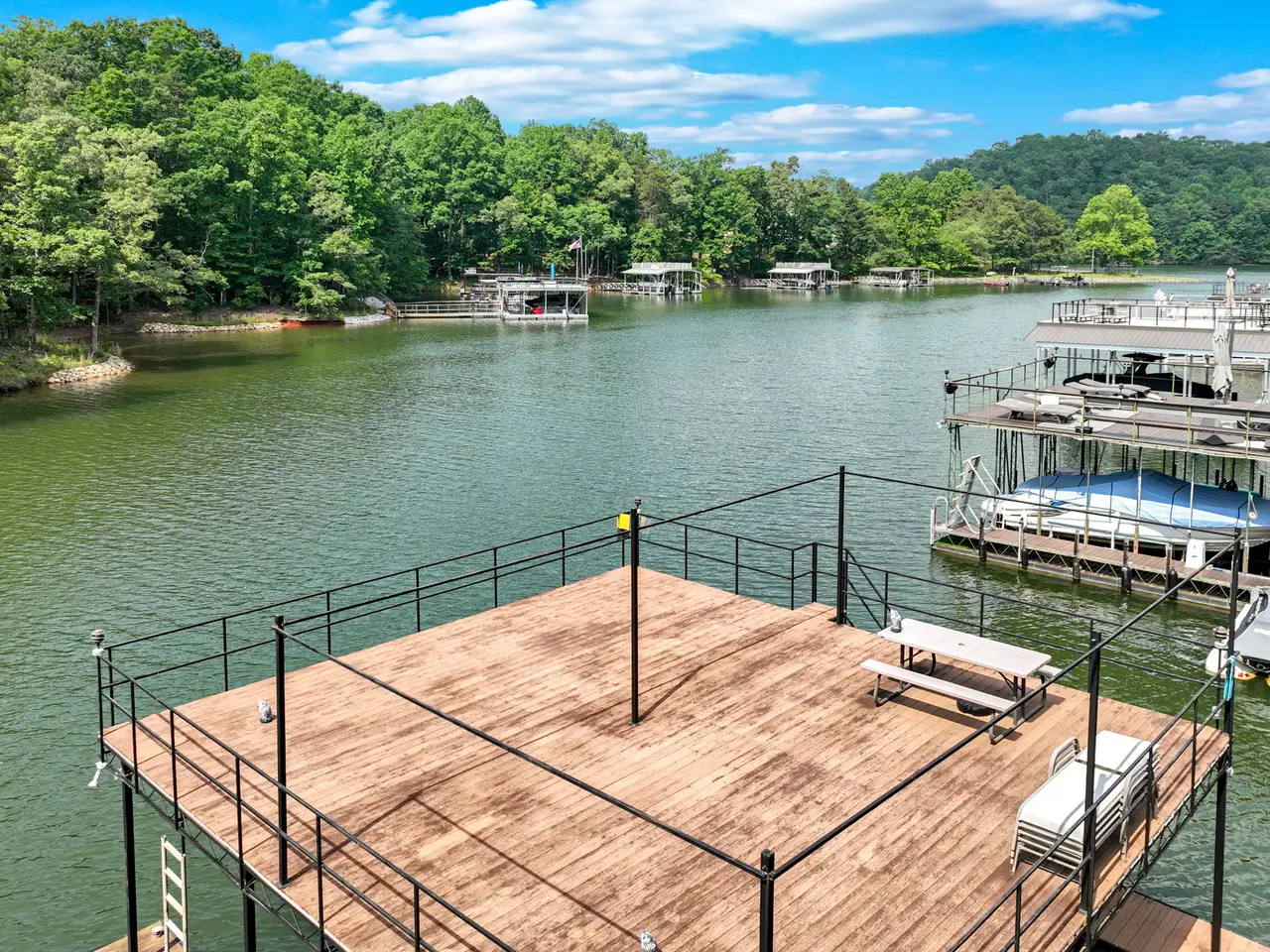 Discover the perfect blend of charm and functionality in this spacious craftsman home on Lake Lanier, offering plenty of room for family and friends! Thoughtfully designed with a resort-style feel, this property features two great rooms with stone fireplaces, two kitchens, and four covered porches ideal for entertaining in every season. Located in a prime Dawsonville spot just 30 minutes north of Atlanta and 15 minutes south of the Dahlonega wineries and fall festivals, this home is nestled in a secluded Lake Lanier neighborhood. Tucked away behind gates in a private three-home enclave, it sits just steps from the water on a protected deep-water cove. Enjoy easy lake access from your private twin-slip dock with a party deck perfect for sunbathing and gatherings, with calm waters ideal for swimming and floating. Inside, the main level features an open floor plan with a two-story vaulted ceiling and stone fireplace, hardwood floors, a spacious kitchen with an island, two bedrooms, and a full bath. The upstairs owner's suite includes a loft sitting area, ideal for a reading nook or office space, and offers serene views. The finished terrace level mirrors the main level layout, complete with a second kitchen, two bedrooms, and a full bath perfect for guests or multi-generational living. The unfinished daylight basement offers even more potential for game rooms, storage, or lake toys. A detached two-car garage with an upstairs storage room adds extra flexibility. With ample parking for trailers and visitors, the shared gated driveway serves just three homes. No HOA, but residents share annual maintenance costs (approximately $600-700 per year) for the gate and common landscaping. Ideal for full-time living or Airbnb potential, this home offers a unique opportunity to enjoy the best of lake life!