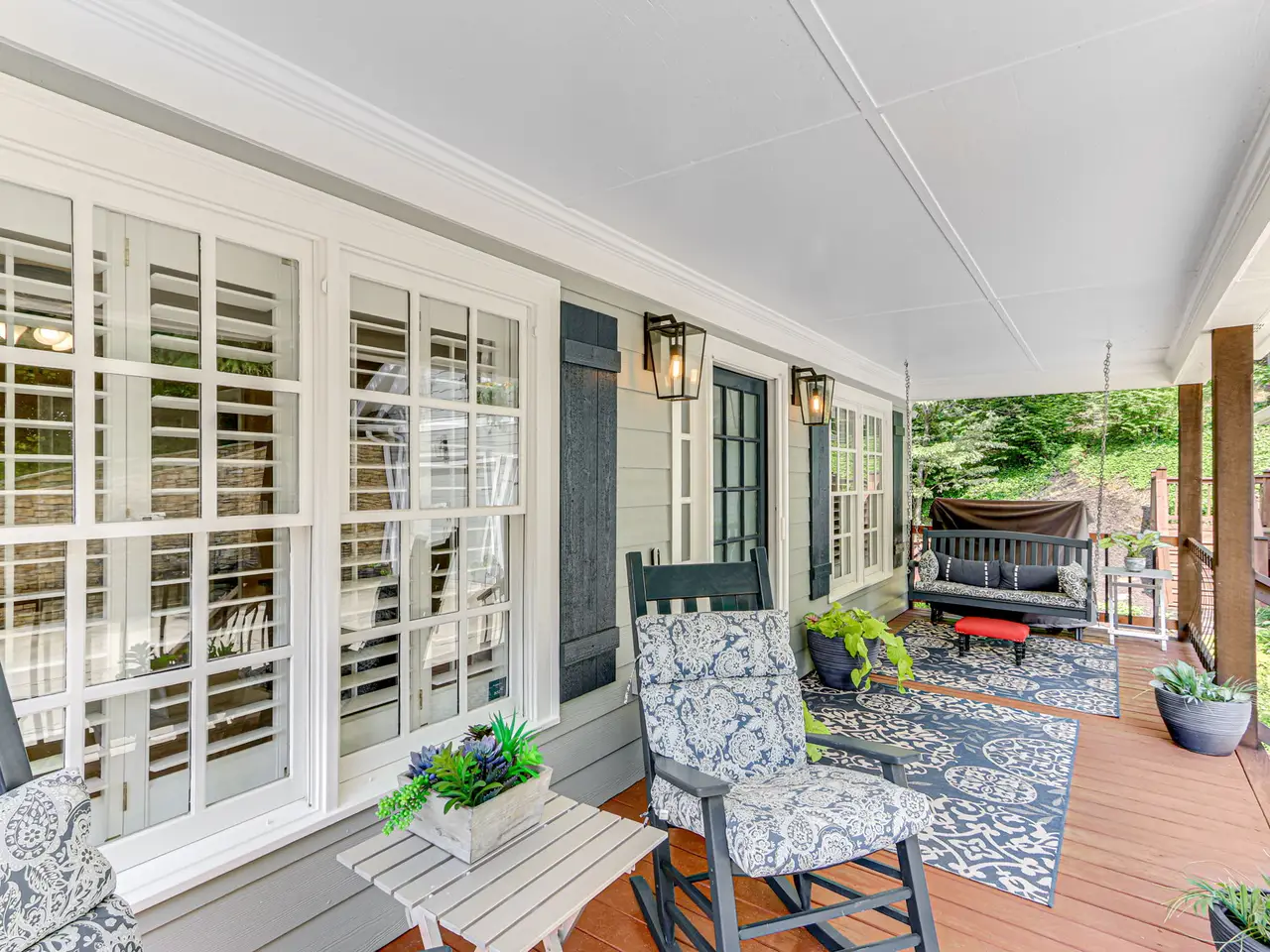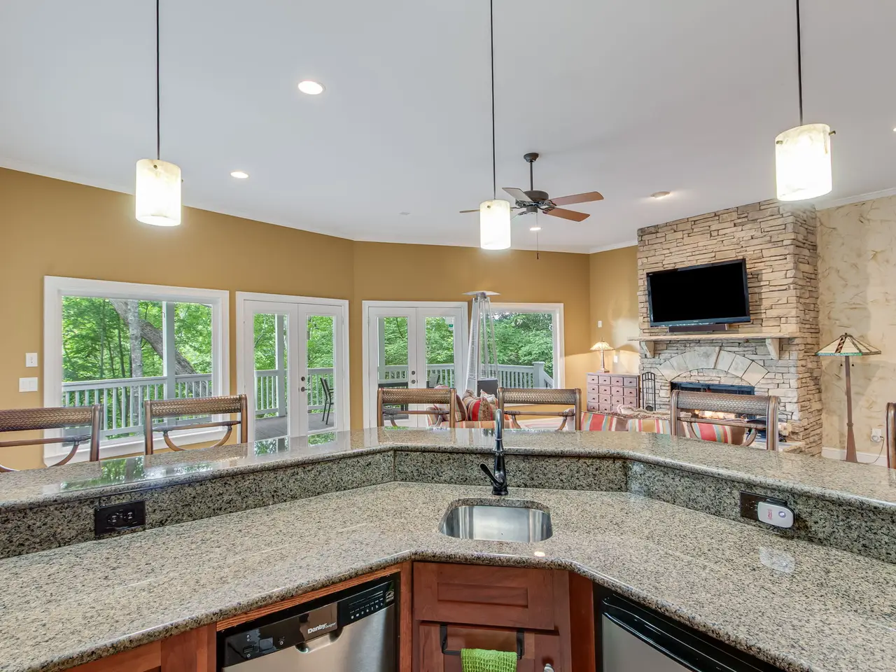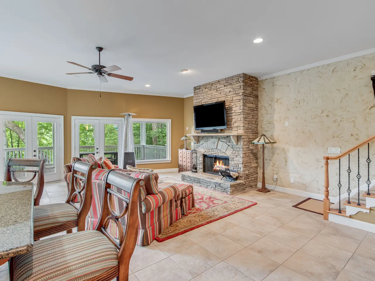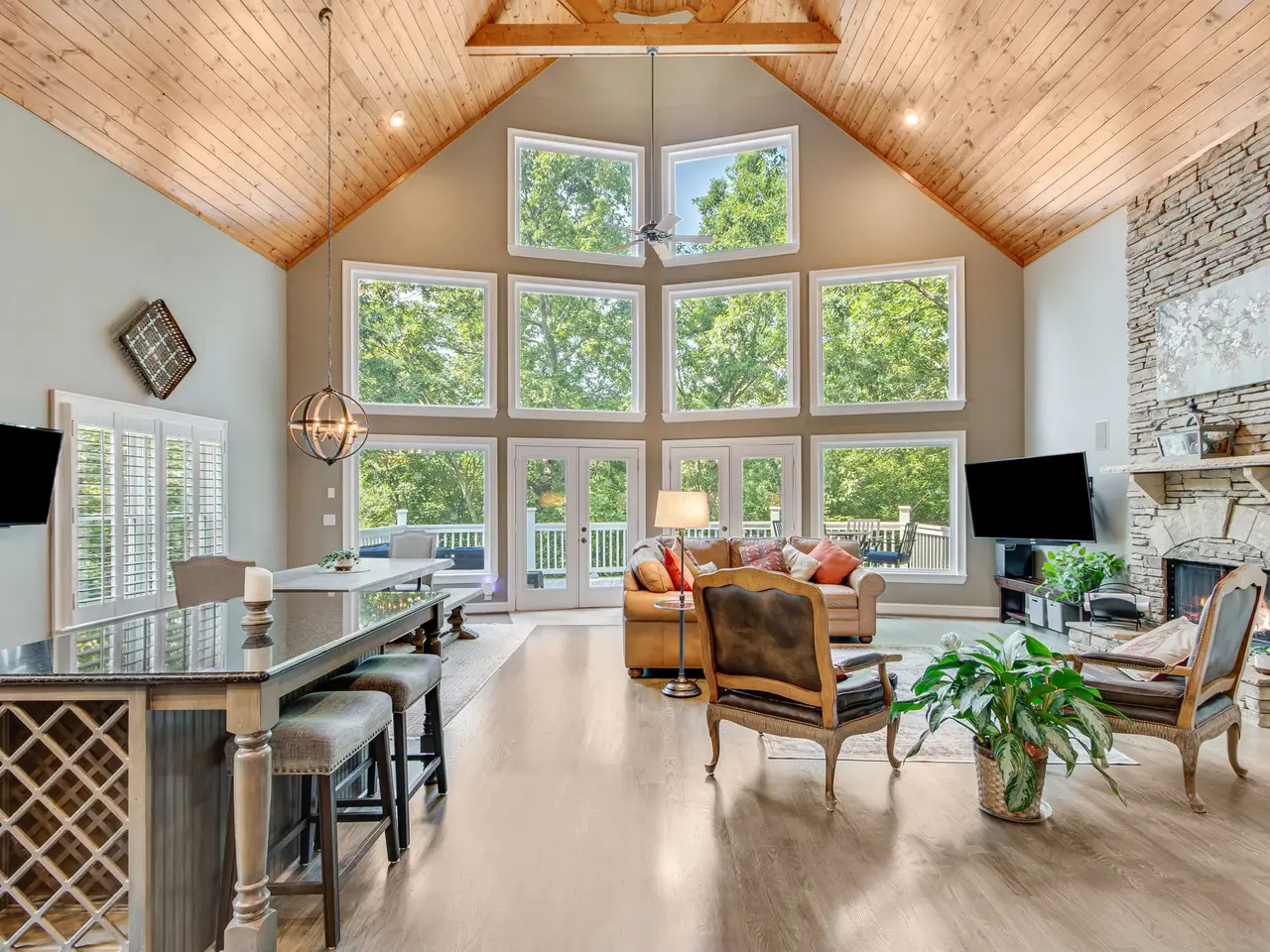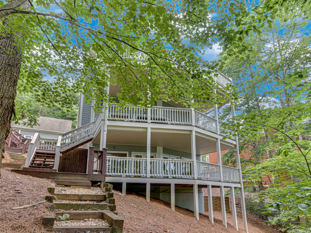 Discover the perfect blend of charm and functionality in this spacious craftsman home on Lake Lanier, offering plenty of room for family and friends! Thoughtfully designed with a resort-style feel, this property features two great rooms with stone fireplaces, two kitchens, and four covered porches ideal for entertaining in every season. Located in a prime Dawsonville spot just 30 minutes north of Atlanta and 15 minutes south of the Dahlonega wineries and fall festivals, this home is nestled in a secluded Lake Lanier neighborhood. Tucked away behind gates in a private three-home enclave, it sits just steps from the water on a protected deep-water cove. Enjoy easy lake access from your private twin-slip dock with a party deck perfect for sunbathing and gatherings, with calm waters ideal for swimming and floating. Inside, the main level features an open floor plan with a two-story vaulted ceiling and stone fireplace, hardwood floors, a spacious kitchen with an island, two bedrooms, and a full bath. The upstairs owner's suite includes a loft sitting area, ideal for a reading nook or office space, and offers serene views. The finished terrace level mirrors the main level layout, complete with a second kitchen, two bedrooms, and a full bath perfect for guests or multi-generational living. The unfinished daylight basement offers even more potential for game rooms, storage, or lake toys. A detached two-car garage with an upstairs storage room adds extra flexibility. With ample parking for trailers and visitors, the shared gated driveway serves just three homes. No HOA, but residents share annual maintenance costs (approximately $600-700 per year) for the gate and common landscaping. Ideal for full-time living or Airbnb potential, this home offers a unique opportunity to enjoy the best of lake life!