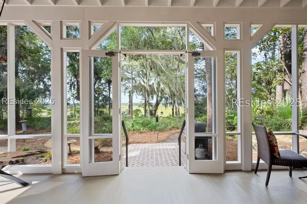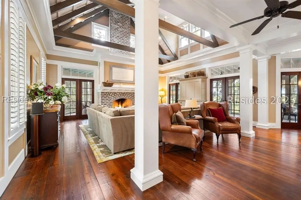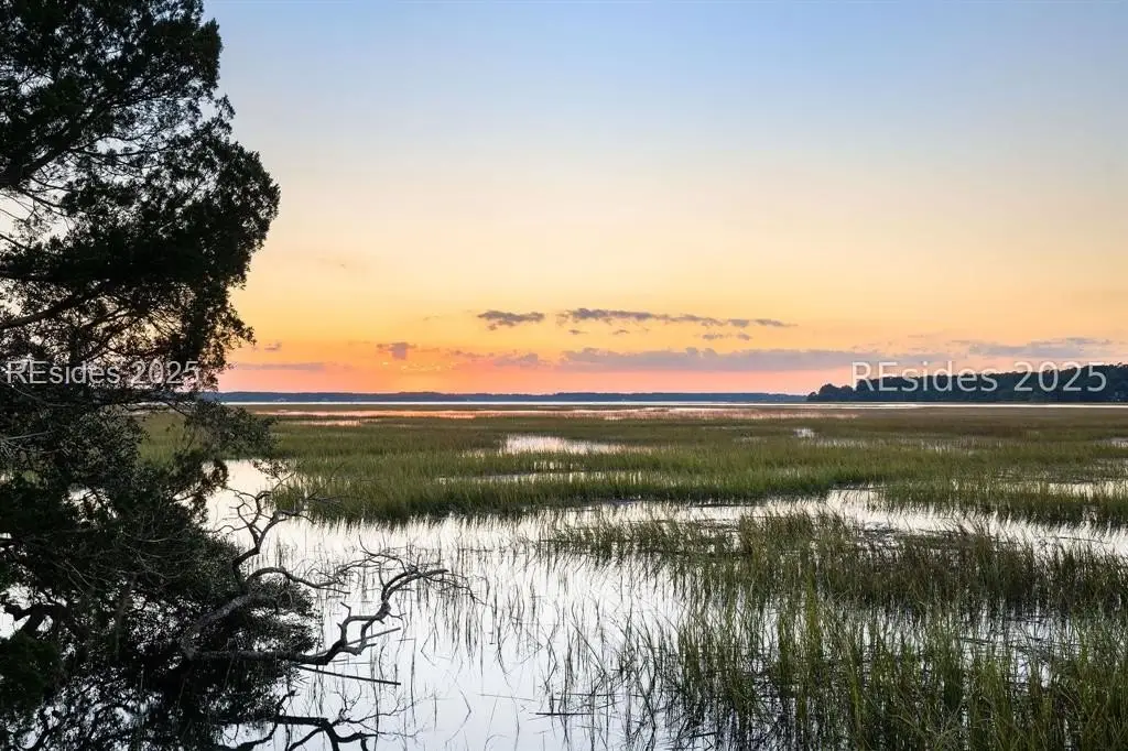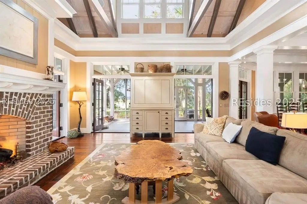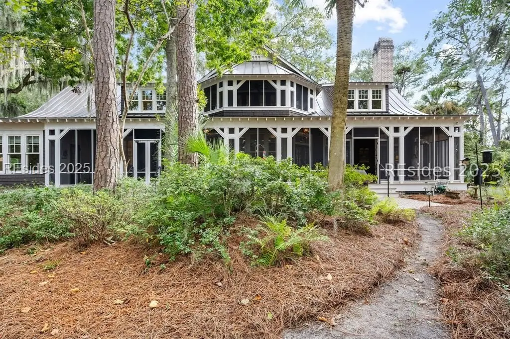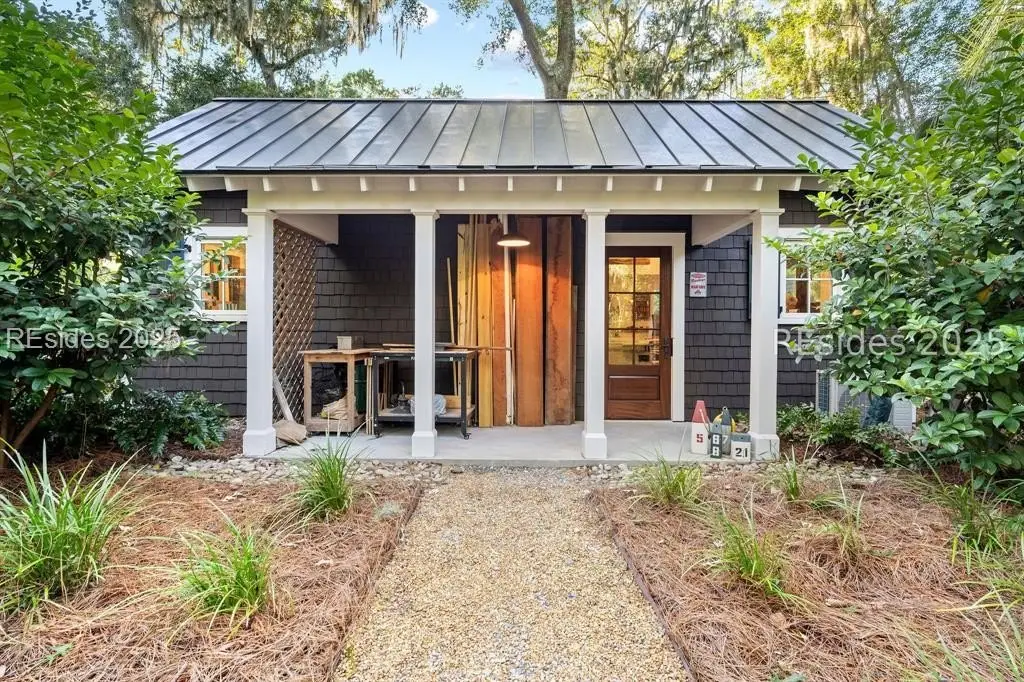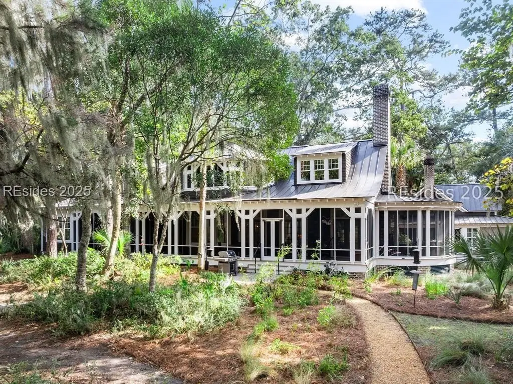 Exquisite sunsets over Callawassie Creek and the Colleton River provide a breathtaking backdrop for this rare Nantucket-style family compound on coveted Spring Island. Sited on 3.5+ acres, this 5,223 sq. ft., 5BR/5.5BA waterfront estate includes a private tidal dock with direct access to Callawassie Creek, the Colleton River, and the Atlantic Ocean. By boat, enjoy easy day trips to Hilton Head, Savannah, or Beaufort, or simply relax at home while fishing, crabbing, shrimping, or watching dolphins and Roseate Spoonbills from your backyard sanctuary. The 3,249 sq. ft. main residence (2BR/2.5BA) was designed for year-round living, showcasing an open floor plan, chef's kitchen, and porches that span the length of the home. The east wing features an apsidal screened porch with Savannah brick fireplace, ideal for Lowcountry outdoor living. The entire second floor is dedicated to a private owner's retreat, complete with sitting room and fireplace, screened porch, spa-like bath with freestanding tub and oversized shower, a large custom walk-in closet, and abundant finished storage. A 995 sq. ft. guest house (2BR/2BA) offers its own living room with fireplace, kitchenette with full-size appliances, washer/dryer, children's loft with built-in bunks, and screened porch overlooking the river. The detached two-car garage with golf cart bay includes a 482 sq. ft. carriage house, perfect for additional guest quarters, studio, or office along with a professional-grade darkroom. A freestanding 764 sq. ft. workshop provides a creative haven, currently outfitted as a professional woodworking studio with exceptional equipment (available separately), but equally suited as an artist's studio. Life on Spring Island is unlike anywhere else, with 3,000 acres of preserved natural beauty and premier amenities: an Arnold Palmer-designed golf course, equestrian center, tennis and pickleball, state-of-the-art fitness complex with heated and chilled saltwater pools, miles of scenic trails, a 7.5-acre farm, and an inspiring art barn. Blending timeless design, craftsmanship, and an extraordinary setting, this rare compound offers the ultimate in Lowcountry luxury, an unparalleled opportunity for multi-generational living on Spring Island.