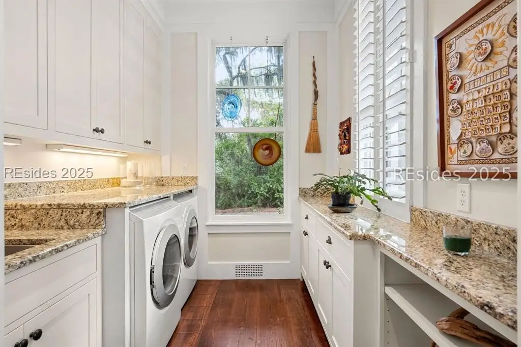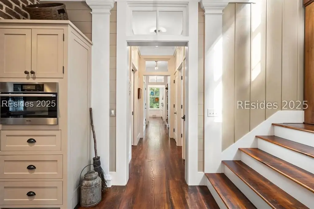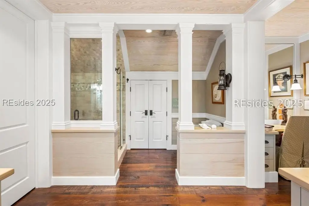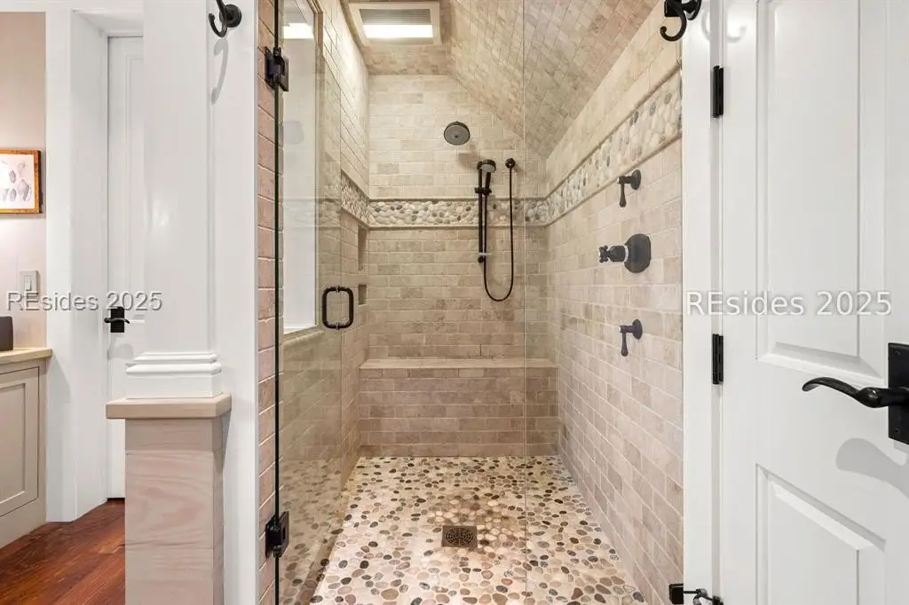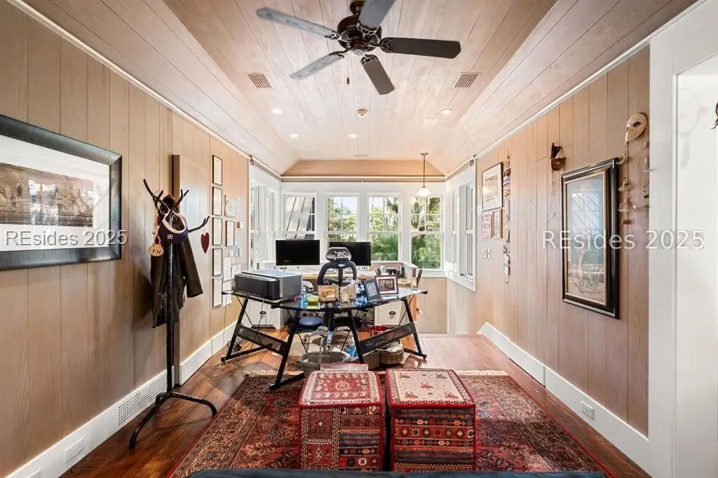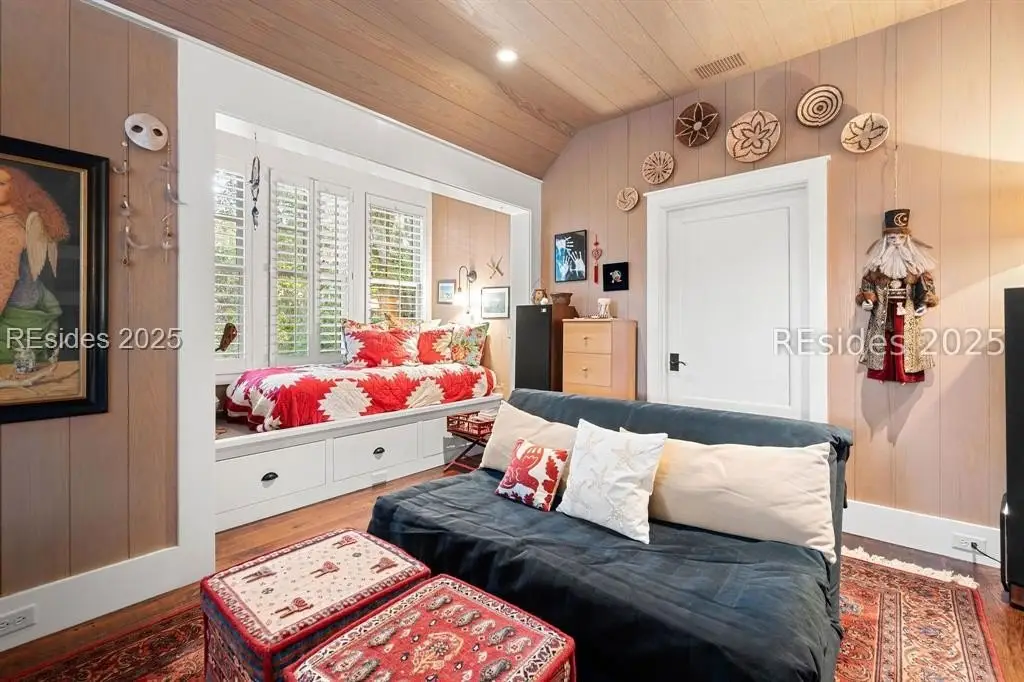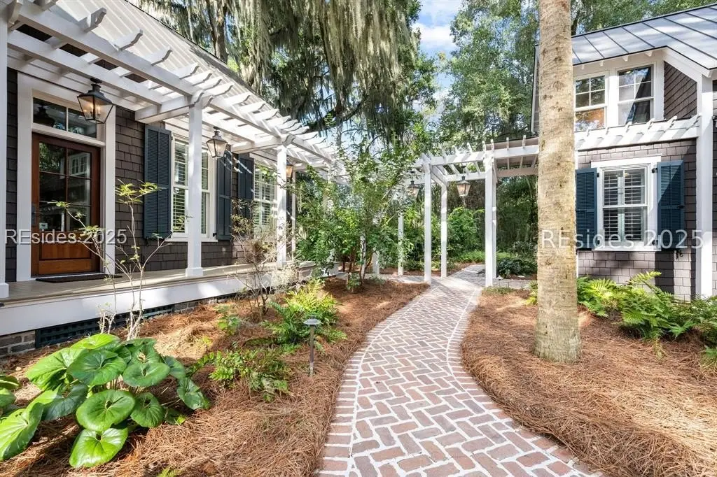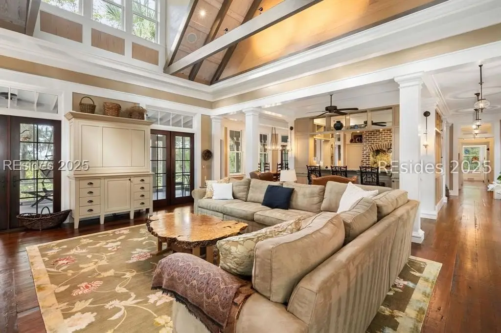 Exquisite sunsets over Callawassie Creek and the Colleton River provide a breathtaking backdrop for this rare Nantucket-style family compound on coveted Spring Island. Sited on 3.5+ acres, this 5,223 sq. ft., 5BR/5.5BA waterfront estate includes a private tidal dock with direct access to Callawassie Creek, the Colleton River, and the Atlantic Ocean. By boat, enjoy easy day trips to Hilton Head, Savannah, or Beaufort, or simply relax at home while fishing, crabbing, shrimping, or watching dolphins and Roseate Spoonbills from your backyard sanctuary. The 3,249 sq. ft. main residence (2BR/2.5BA) was designed for year-round living, showcasing an open floor plan, chef's kitchen, and porches that span the length of the home. The east wing features an apsidal screened porch with Savannah brick fireplace, ideal for Lowcountry outdoor living. The entire second floor is dedicated to a private owner's retreat, complete with sitting room and fireplace, screened porch, spa-like bath with freestanding tub and oversized shower, a large custom walk-in closet, and abundant finished storage. A 995 sq. ft. guest house (2BR/2BA) offers its own living room with fireplace, kitchenette with full-size appliances, washer/dryer, children's loft with built-in bunks, and screened porch overlooking the river. The detached two-car garage with golf cart bay includes a 482 sq. ft. carriage house, perfect for additional guest quarters, studio, or office along with a professional-grade darkroom. A freestanding 764 sq. ft. workshop provides a creative haven, currently outfitted as a professional woodworking studio with exceptional equipment (available separately), but equally suited as an artist's studio. Life on Spring Island is unlike anywhere else, with 3,000 acres of preserved natural beauty and premier amenities: an Arnold Palmer-designed golf course, equestrian center, tennis and pickleball, state-of-the-art fitness complex with heated and chilled saltwater pools, miles of scenic trails, a 7.5-acre farm, and an inspiring art barn. Blending timeless design, craftsmanship, and an extraordinary setting, this rare compound offers the ultimate in Lowcountry luxury, an unparalleled opportunity for multi-generational living on Spring Island.