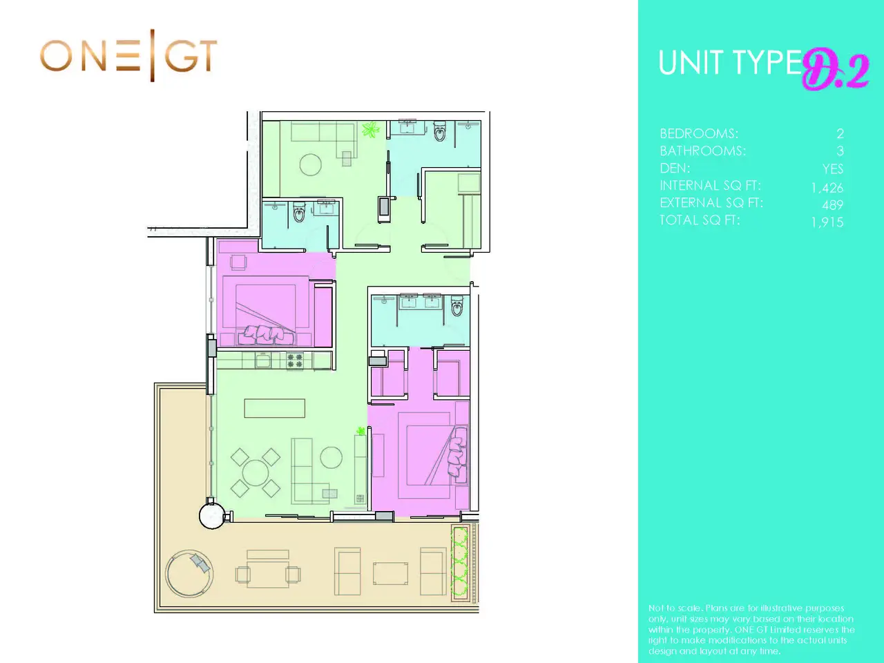 Cayman's next landmark development project, known as ONE\GT, fuses the very best of contemporary urban living from around the world - from the vibrant rooftop beach clubs of Miami and LA, to the local piazzas and street cafés of Europe, and of course exquisite Caribbean artistic flair. Comprising a 178-suite boutique hotel and luxury residences, with amazing on-site amenities, ONE\GT is located at the edge of central George Town, on Goring Avenue, directly behind Bayshore Mall.With amazing on-site amenities, ONE\GT will be the capital's first ten-storey structure, rising to 144' above ground level and offering spectacular multi-aspect views. Its eleventh floor "Sky Club" with its unique infinity edge pool, private cabanas, bar & grille, yoga, treatment, and event areas, will bring a new level of sophisticated enjoyment to our islands, whilst its "signature" restaurant, grand café, and many other amenities will ensure owners, tenants and guests can enjoy ONE\GT to the fullest. There will also be a private residents' pool, full gym, and separate residents' entrance, along with onsite covered and valet parking and owner storage units available.Owners will also enjoy very solid returns on investment from ONE\GT's rental programs or can choose to rent their units on the open market. Estimated completion date is early 2025. Enjoy truly "elevated modern island living" at ONE\GT and invest now before prices elevate too!Unit Type D.2This two bedroom plus oversized den suite is one of our most versatile residences. Three ensuite bathrooms, a large utility room and a spacious wrap-around terrace make it perfect for family living, or hosting guests. The unit has a full kitchen, with center aisle and a large living/dining area, creating great indoor/outside living opportunities. Enjoy truly "elevated modern island living" at ONE\GT and invest now before prices elevate too!