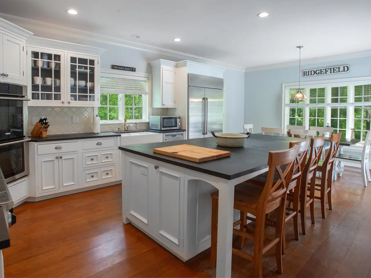 Welcome Home to your own waterfront retreat on Ridgefield's Lake Mamanasco! Perfectly sited on 1.57 acres, this charming Cape-style residence combines comfort, character, and year-round lake living. With soaring 9-foot ceilings, hardwood floors, and an abundance of natural light, the home feels open and inviting from the moment you walk in. The beautifully updated kitchen features soapstone counters, crisp white cabinetry, and professional stainless steel appliances, with a butler's pantry and wine fridge connecting to the dining room. The adjoining spacious family room, featuring a fireplace and French doors that open to the deck, is perfect for everyday living and entertaining. An office, mudroom with built-in desk and laundry, and a welcoming front porch add to the appeal. The upper-level primary suite is a true retreat with a walk-in closet, deck access, and serene water views. Four additional bedrooms and two full bathrooms complete this level. The walkout lower level offers a family room with French doors to the yard, a den, and a full bath. Outside, enjoy expansive decks, patios, and seating areas overlooking the tranquil lakefront--swimming, fishing, or kayaking right from your backyard. Mature trees and plantings provide privacy, while the location offers quick access to Ridgefield's vibrant village and easy commutes to Fairfield, Westchester, and NYC. Note, a new code-compliant, 5-bedroom septic is being installed! Welcome Home!!
