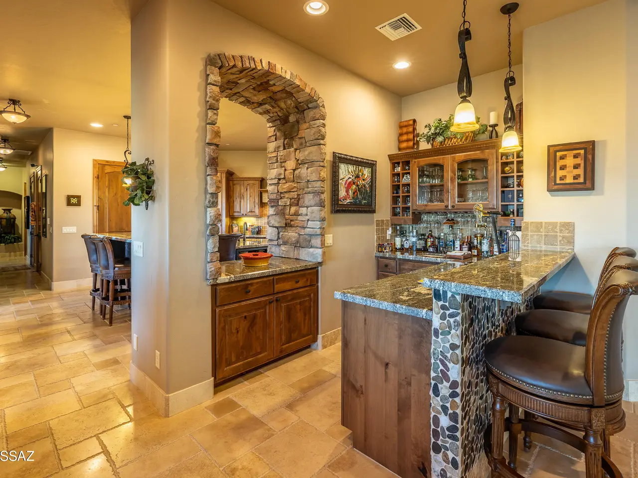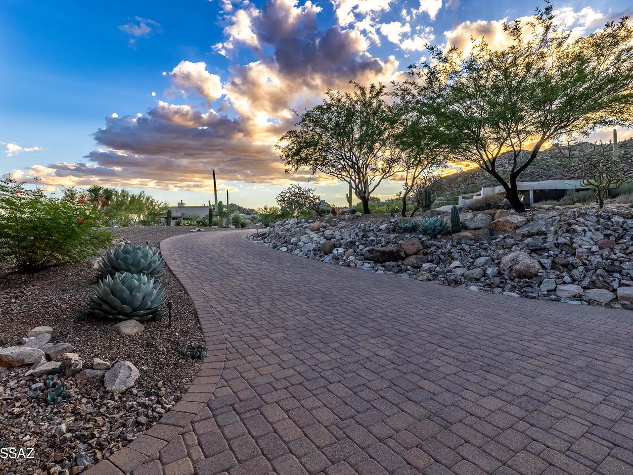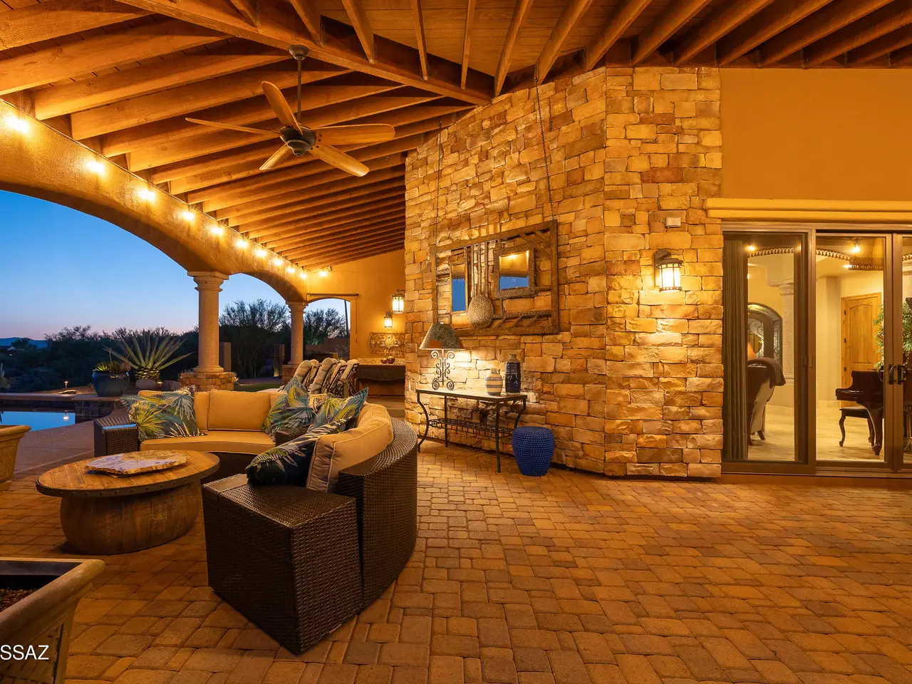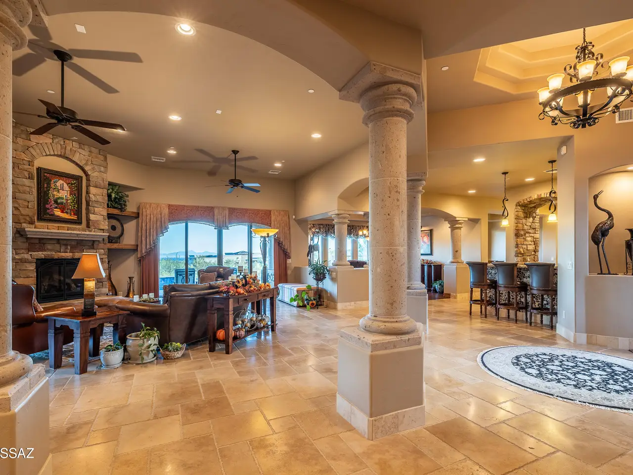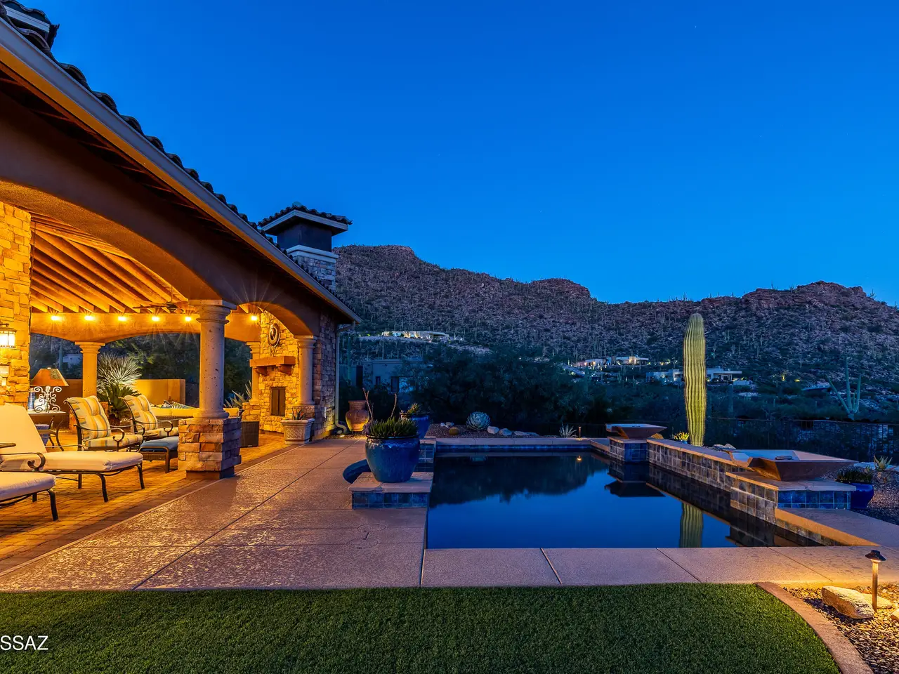 Extraordinary custom Canyon Pass home- exquisite craftsmanship that offers comfortable luxury living. Grand great room concept living - each window highlights a beautiful view. This residence is surrounded by the beauty of the Tortolita & Catalina Mountains, mesmerizing city lights, sunset glows and beautiful morning sunrises. Sprawling porch/patio sitting areas - relax in the glow of the majestic under porch fireplace, enjoy the relaxing pool, host a BBQ, hypnotize yourself in the city lights. Single story - no steps. Fabulous garage - great for car collectors. 3 beautiful fireplaces - great room, primary bedroom, under porch. If you love cooking you'll love this gourmet kitchen - and the adjoining entertainers bar has old world charm. All bedrooms are oversized w/private baths.
