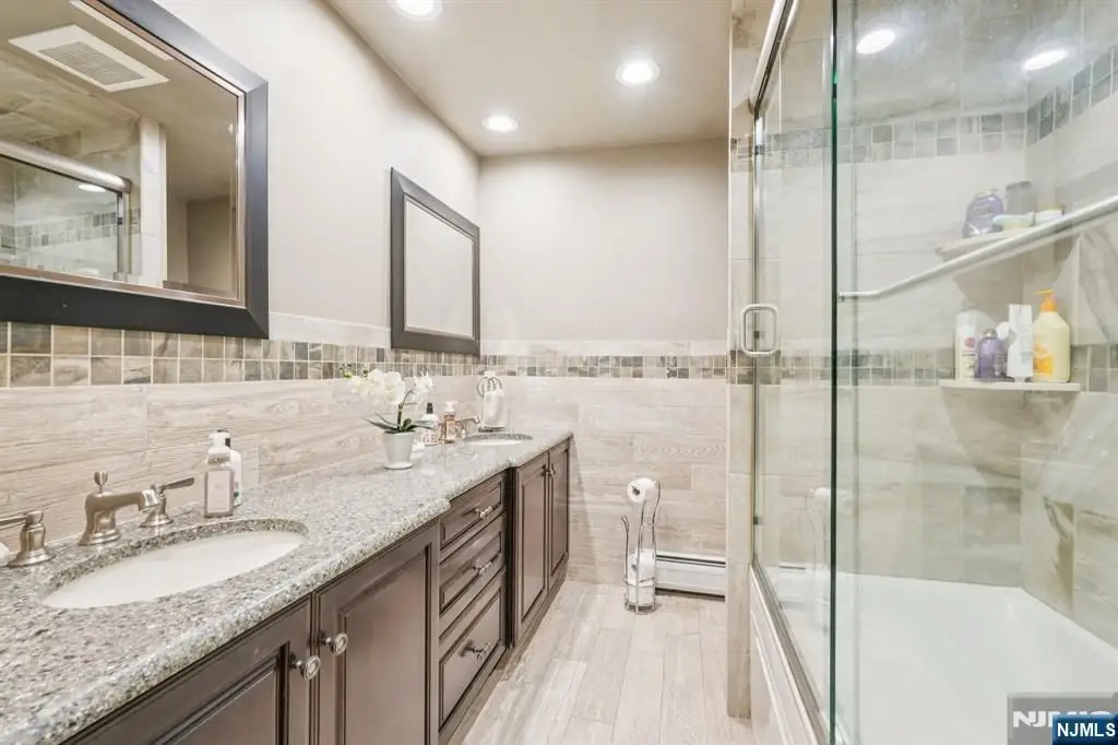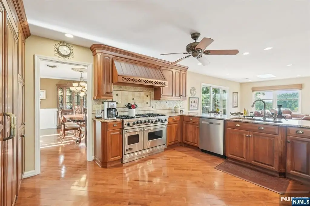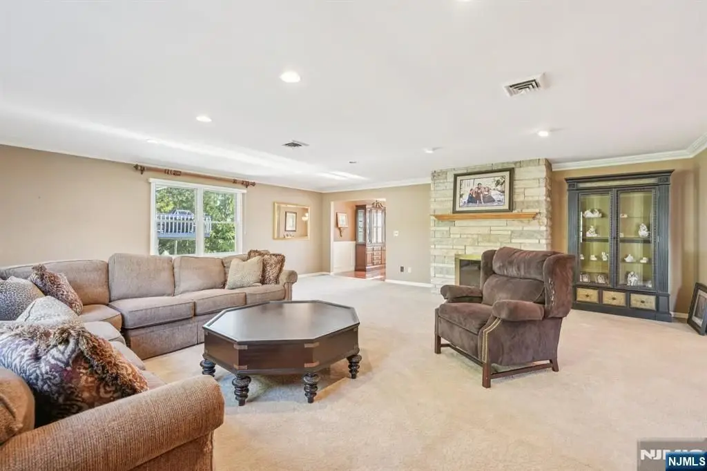 Welcome home to this beautifully maintained 4,900 sq ft Ranch nestled on a thoughtfully landscaped lot. Designed for effortless one-floor living, this spacious residence combines comfort, elegance, and functionality. Step into the welcoming entry foyer that opens to the bright, open-concept main living area. The spacious living room invites relaxation with its large windows and cozy gas fireplace, seamlessly flowing into the elegant dining room adorned with custom moulding an ideal setting for intimate meals and lively gatherings. The home chef's dream kitchen features custom cabinetry, marble countertops, stainless steel appliances, built-in desk, and separate dining area, opening to the inviting family room with large windows, fireplace, and access to the deck perfect for indoor-outdoor living. The main level offers two primary suites, each with a private en suite bath, along with two additional bedrooms and a full bathroom. The expansive finished lower level provides versatility with a second family room, gas fireplace, den overlooking the backyard, sliding doors to the patio, a third primary suite, additional bedroom, full bath, laundry, and ample storage. Outdoor living is equally impressive with a deck for al fresco dining, a patio ideal for entertaining, and a fully fenced yard offering privacy and space for recreation. Conveniently located near NYC transportation, shopping, and dining, this exceptional home offers the perfect blend of space, style, and convenience.
