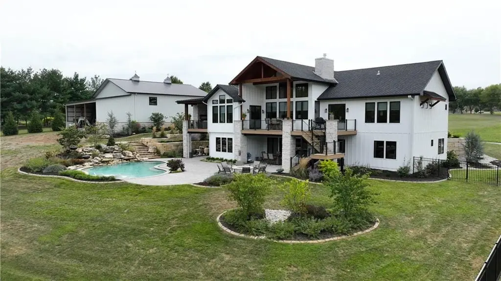 Custom-built retreat with soaring ceilings, wood beams, & tons of windows offering natural light throughout. Backyard oasis w/heated inground pool, waterfalls, fire bowls, firepit, covered deck & patio, & iron fence. Open main floor living w/floor to ceiling fireplace, custom cabinetry, oversize center island, walk-in pantry, high end finishes & built-ins throughout, designated office, spacious laundry/mud room, stunning primary suite, & 2nd bedroom. Walk-out lower level with excavated garage, storage room w/exterior door, wet bar, 3 bedrooms, Rec Room, & 2nd laundry. 50x50 metal outbuilding with 3 doors (1 oversized for semi), 1/2 bath, geothermal heat/cool & spray foam insulation. 2 geothermal systems, whole house generator, sprinkler system, underground propane tank, and extensive landscaping w/concrete curb complete this one-of-a-kind home. All bedrooms with walk-in closets and private bath access. Paved drive/parking for business, semi, RV, trailers, etc.