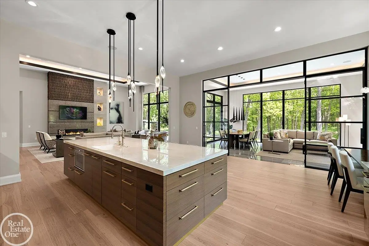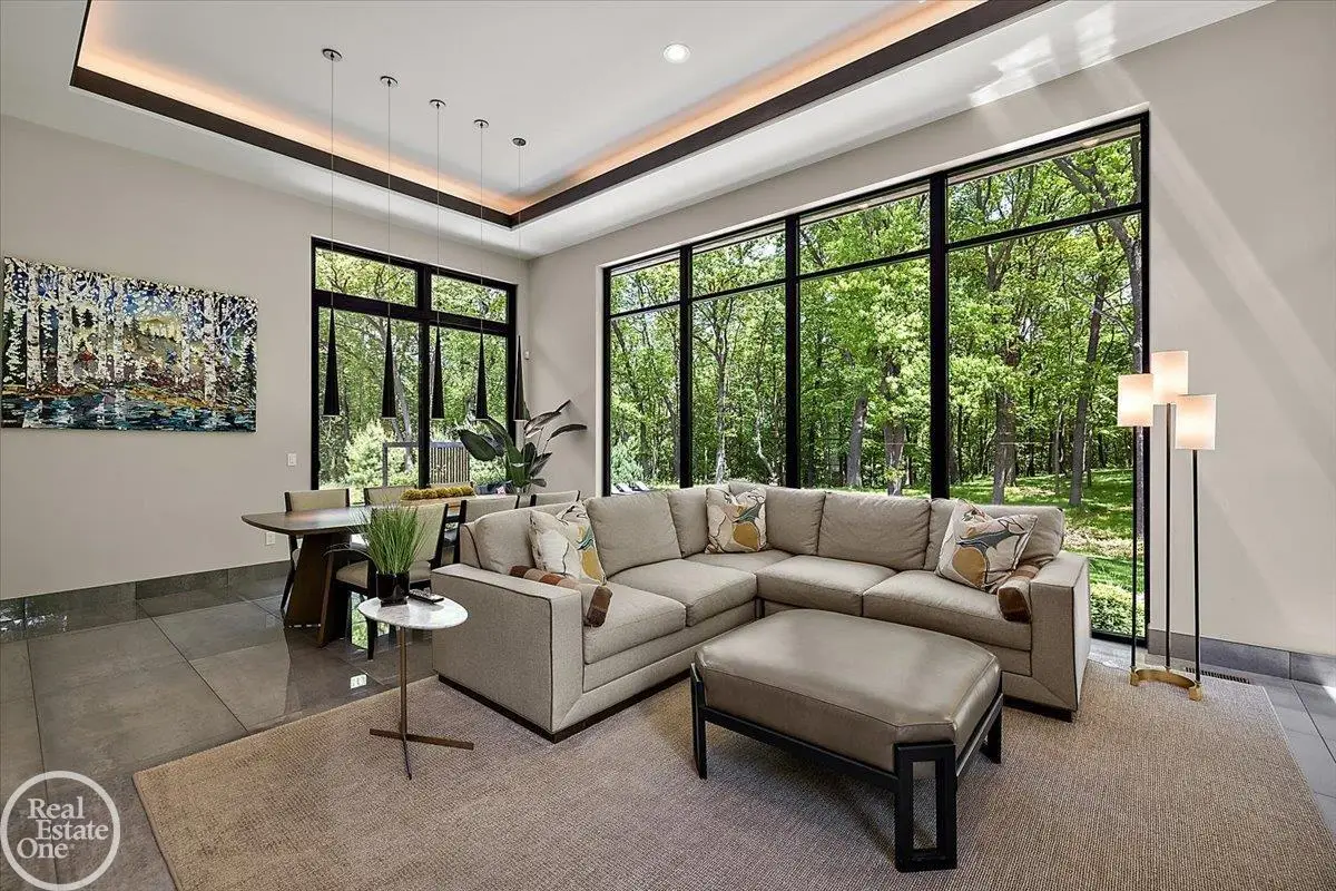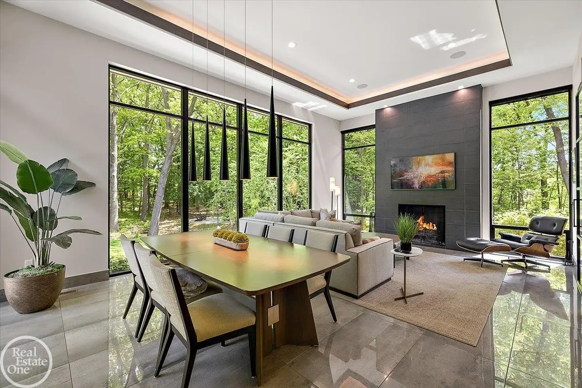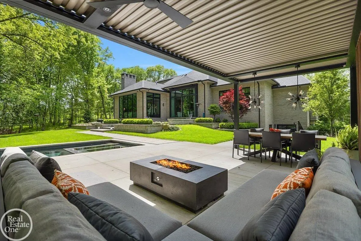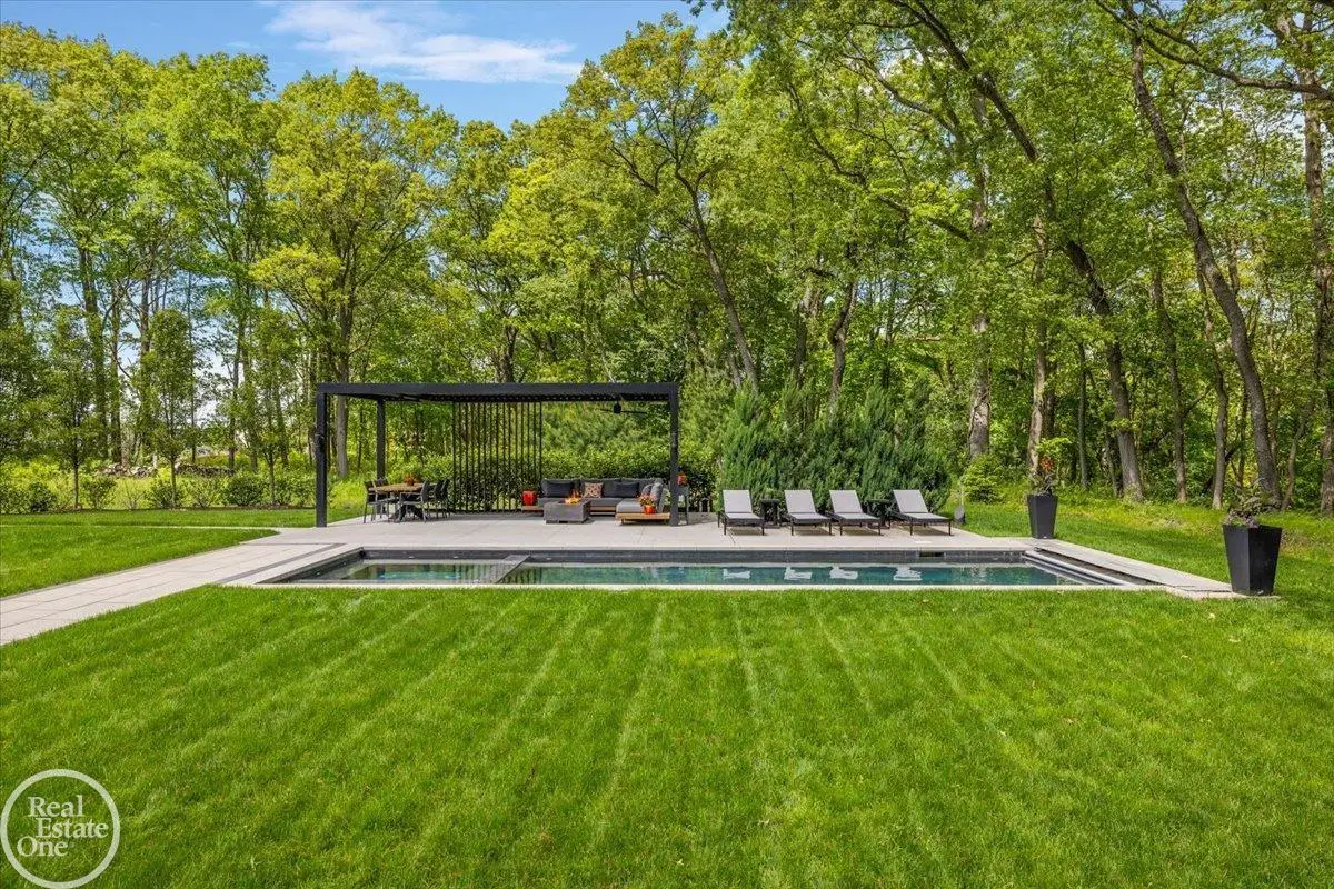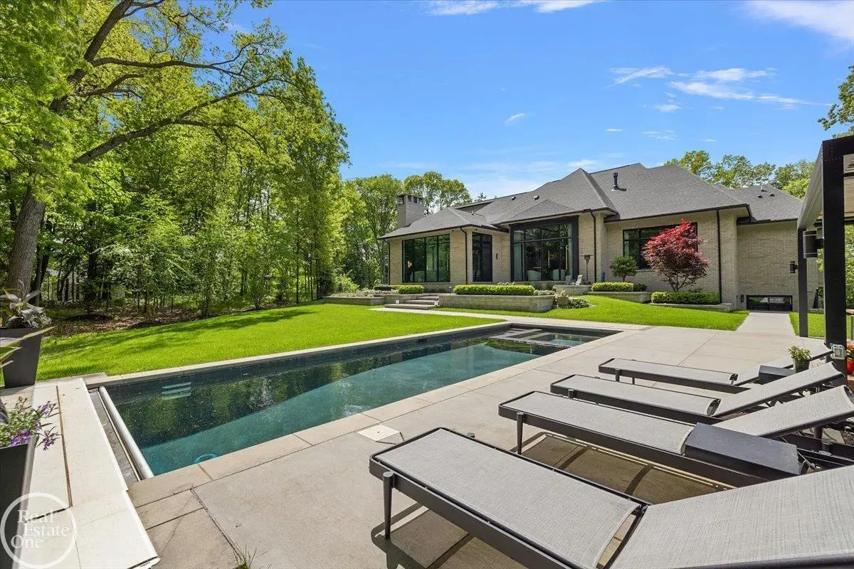 Experience unparalleled modern luxury in this custom-built 2021 Cranbrook masterpiece. Featured in Detroit Design Magazine, this home showcases exquisite interior design by Tutto Interiors, boasting the finest materials and craftsmanship throughout. Situated on 3 private wooded acres, this residence offers a serene escape with an urban edge. The open floor plan, highlighted by soaring 14-foot ceilings and expansive walls of windows, floods the home with natural light and breathtaking views. The gourmet kitchen, equipped with Thermador appliances, is an entertainer's dream. Relax in the stunning great room with its floating fireplace or unwind in the four-seasons glass room, featuring an industrial loft aesthetic and a natural fireplace. The primary suite offers a spa-like experience with a luxurious bath, steam shower, and dual walk-in closets, all overlooking the tranquil wooded landscape. The finished walk-out lower level leads to a 35x12 inground pool, complete with a custom pergola and firepit, perfect for outdoor gatherings.