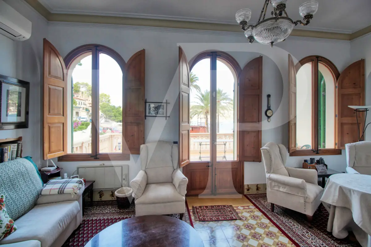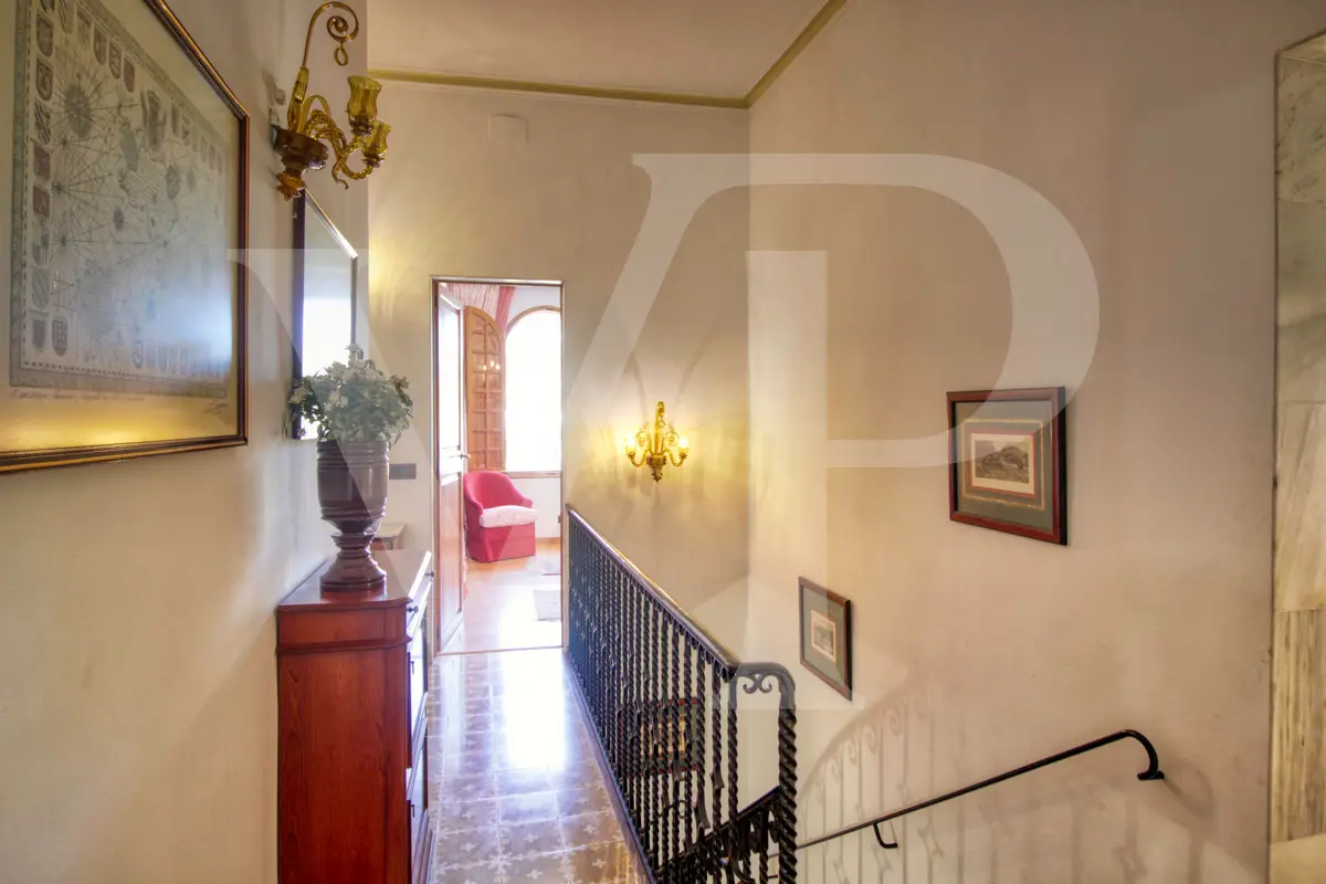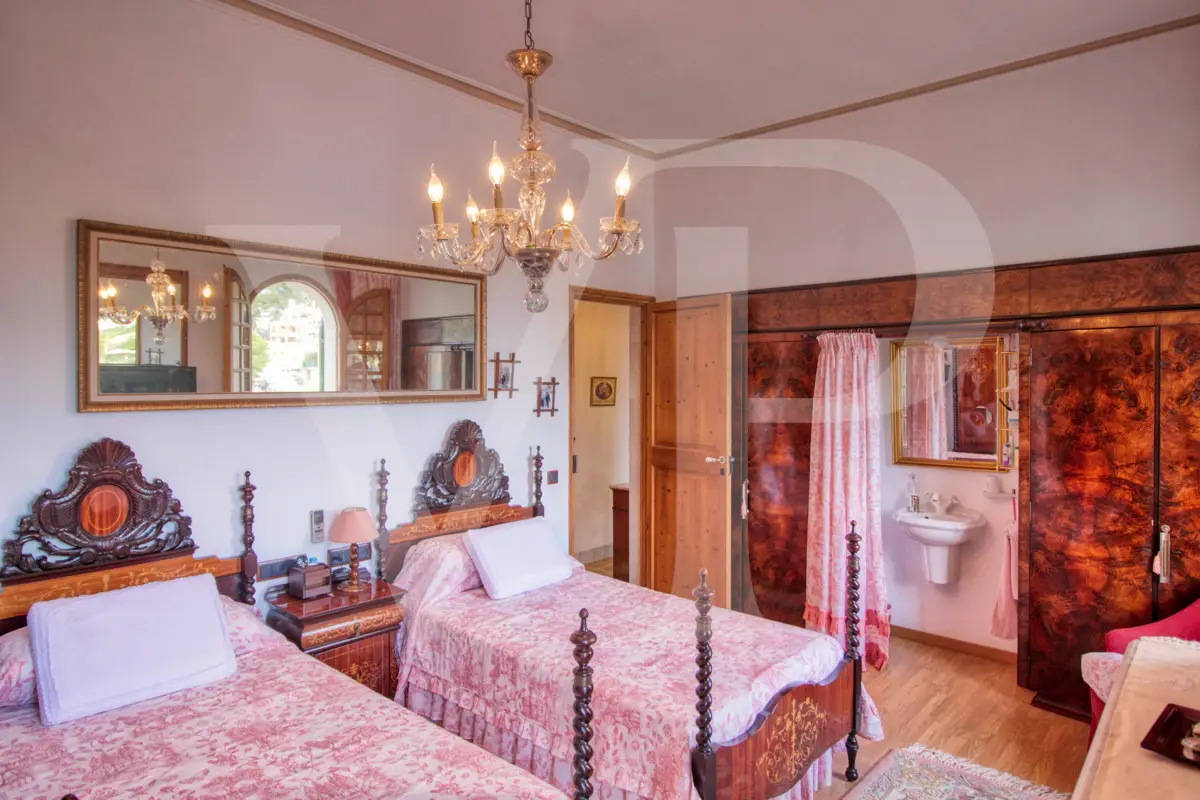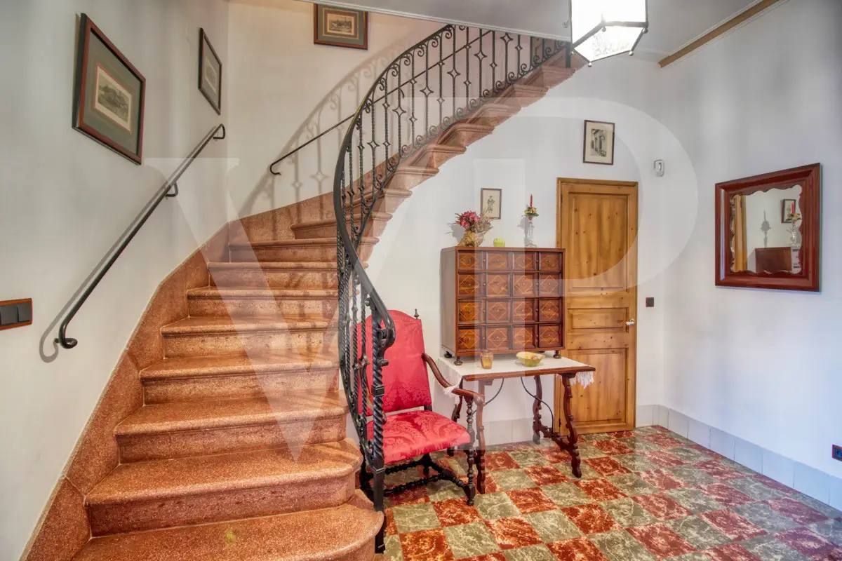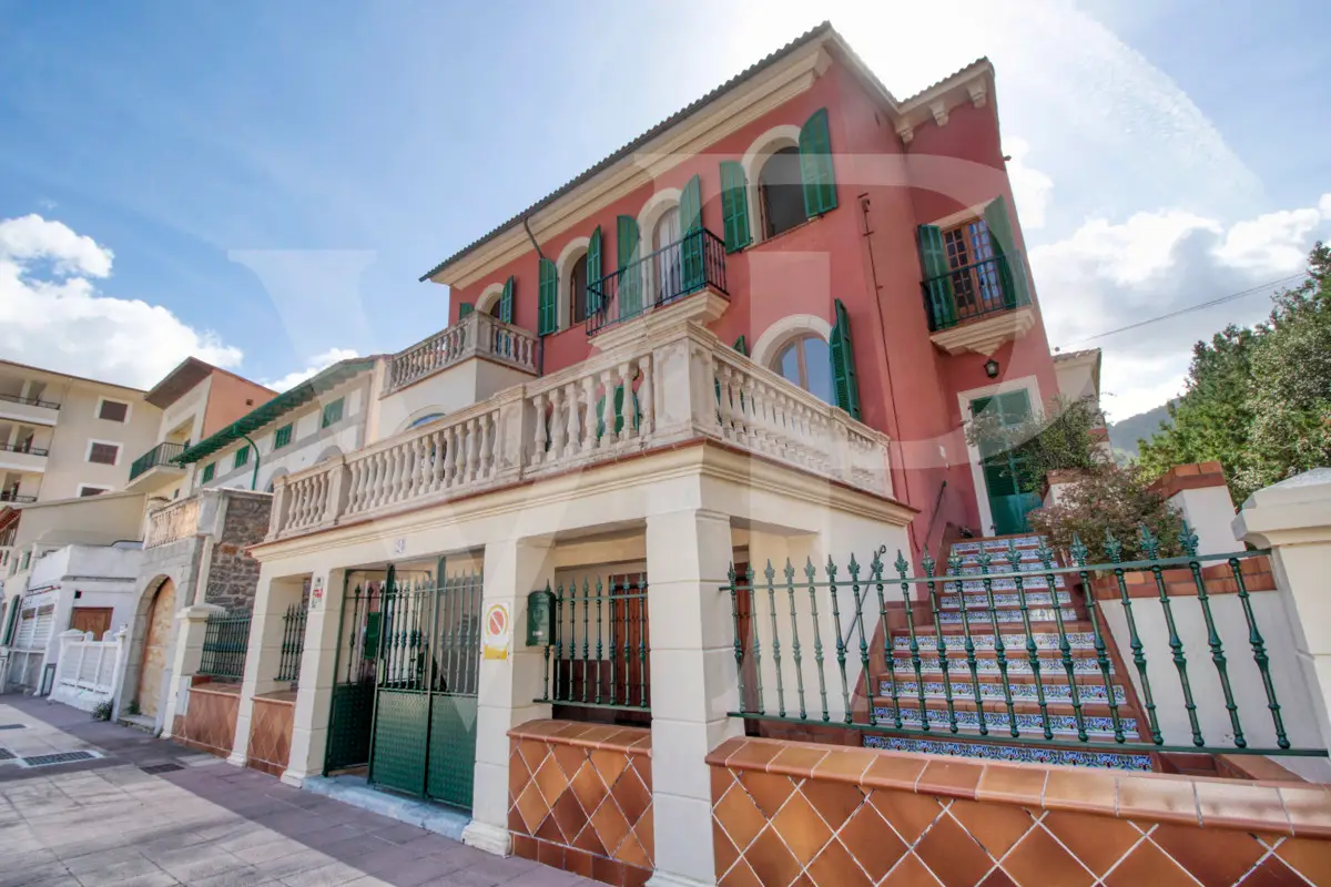 Fantastic corner house in a quiet location with easy parking, located in the first row in front of Platja d'en Repíc in Puerto de Sóller. The property has a plot of 400 square meters with a historic manor house of almost 400 square meters with garden and private parking space. On the first floor with more than 129 square meters through the main direct access from the outside, we find a cozy entrance hall with arch that connects the distributor with the beautiful spiral staircase, a large living room with fireplace and large curved windows with direct exit to the large front terrace of 24 square meters with balustrade of seas from where you can enjoy the fantastic sea views and sunsets. A renovated area with a modern and bright dining room with balcony, hallway with elevator, modern equipped kitchen, laundry room with direct access to the large rear terrace and a modern bathroom. Another area with two single bedrooms with sink, one double bedroom, large bathroom very old but well preserved. From this floor there is access via stairs or a lift to the rear terrace with barbecue area, the garden and the ground floor. On the second floor, from which you can enjoy wonderful sea views, are the other three double bedrooms, all with balconies and two of them with sinks. The beautiful ground floor of 150 square meters preserves all its rustic style, rustic kitchen with wooden furniture, a living room or dining room, storage room, small cellar and pantry with the bottom of the stairs, room with original sink with bathroom and separate shower, an office or library , garage and with access to the large front terrace. Very high ceilings with beautiful stucco on the upper two floors, original tiles, large stained glass windows and curved Mallorcan shutters and antique doors made of old northern wood. The bedrooms are equipped with large closets, two of which have built-in wardrobes. Vaulted ceilings on the ground floor in a rustic style with 60cm wide stone walls and terracotta floors. It has many terraces and balconies, central air conditioning in the new area, elevator and staircase with access to the rear terrace. There is the possibility of remodeling only the interior spaces, the façade will be protected from any alteration in order to preserve the architectural heritage of the area.