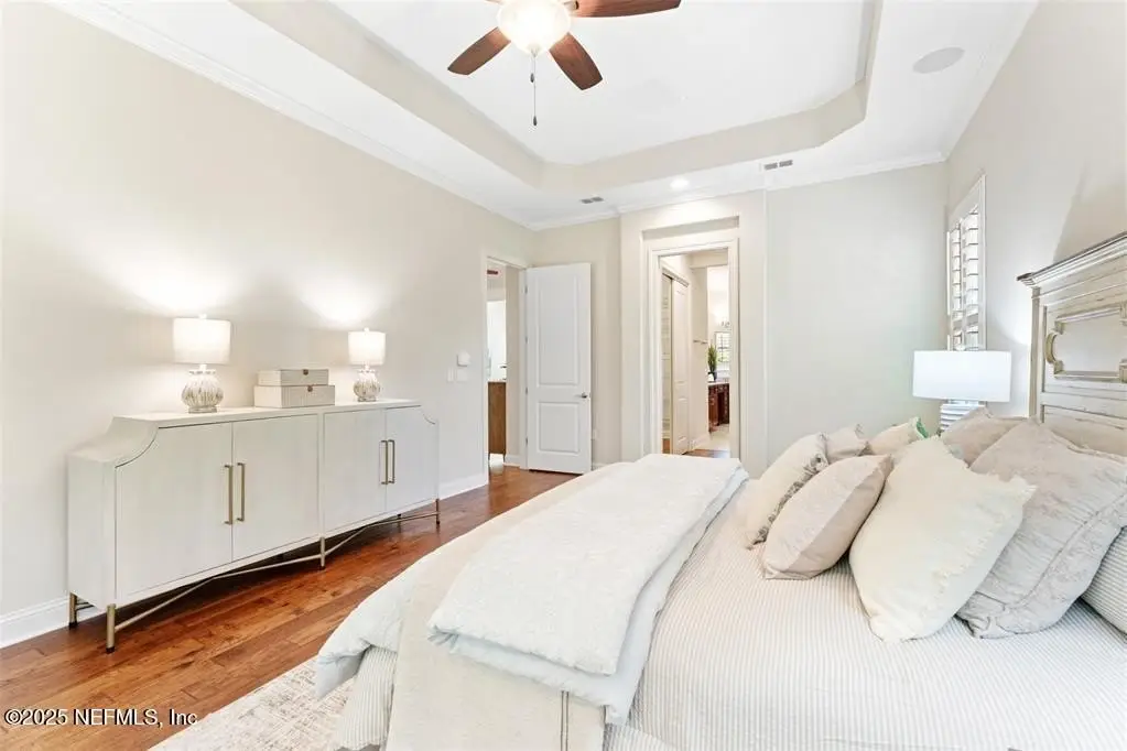 A short stroll from the beach! This beautifully maintained four bed, three bath home nestled within the gated community of The Preserve at Summer Beach. This one-level residence offers an easy, low-maintenance coastal lifestyle with inviting open-concept layout & split-bedroom floorplan. Enjoy rich wood flooring throughout main living areas, study, and bedrooms. The thoughtfully designed gourmet kitchen boasts stainless steel appliances, 42'' cabinets, & gas cooktop. Beaded corners, crown molding, ample storage, & high-quality finishes as well as plantation shutters elevate the interior. Other upgrades include a tankless water heater, water filtration system, & electric car charging outlet, all tailored for modern convenience. Additional 10'x20' garage perfect for golf cart or workshop. Step outside to private screened-in porch, perfect for morning coffee or relaxing evenings in tranquil, tree-lined setting. Designed for a true lock-and-leave lifestyle, home is ideal as full-time residence or seasonal retreat.