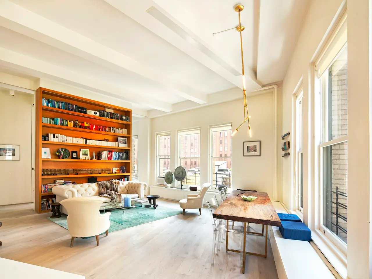 A rare opportunity to live in an EXCEPTIONAL TRIBECA LOFT!! Soaring 12 foot beamed ceilings throughout with dramatic floor-to-ceiling windows that flood every room with natural sunlight and showcase iconic open southern views of downtown Manhattan. From the moment you enter, a canvas unfolds, creating a harmonious tapestry of calm amid the energy and excitement of living perfectly positioned in the very heart of Tribeca, between Franklin and Leonard Streets. An artfully designed open-floor plan successfully integrates the living room, dining room and kitchen, all anchored by a 9.5 foot custom-designed, floor-to-ceiling oak bookcase. The ceiling in the living room cleverly conceals an electrically operated drop-down 93x39 Elite Screen for those stay-at-home immersive movie nights. The impeccably renovated open kitchen features a long center island with Corian countertops perfect for the master chef and for entertaining. Top-of-the-line appliances, include a Viking gas stove, Miele dishwasher and dryer, Gaggenau fridge and freezer, Wolf oven and range, U Line wine fridge, warming oven,pantry and an abundance of storage. An in-unit Miele washer-dryer of course! The adjacent dining area is as functional as it is beautiful, easily accommodating a 10-person table beneath striking designer lighting. It is ideal for intimate dinners or larger gatherings surrounded by picture postcard views of some of Tribeca's great architectural buildings. The primary bedroom is awash with its open southern exposure, accommodates a king-size bed and custom closets. The second bedroom enjoys the same radiant natural light and is perfect as a child's room, den, office or for your guest. The bathroom is nothing short of spa-worthy. Artfully designed to include double sinks and an oversized walk-in shower with dual large shower heads. This architect who created this beautiful apartment is Dieter Vander Velpen and was featured in the Belgian Financial Times as well as in the interior design book The Ultimate Guide to Apartments by Beta Plus. 100 Hudson Street is one of Tribeca's iconic boutique Loft buildings. With just a handful of residences, it offers quiet privacy, exceptional architectural character and a roof terrace with skyline views that stretch across the city. The very soul of TRIBECA is just outside your door cobblestone streets, Michelin-star dining, land-marked architecture, world-renown art galleries, and Hudson River park just a stone's throw away. Whether it's morning espresso at Bluestone Lane, brunch at Bubby's, dinner at Locanda Verde or a delightful stroll through Duane park, this is downtown living at its very best!! Offered furnished or unfurnished By Appointment. Welcome Home!!