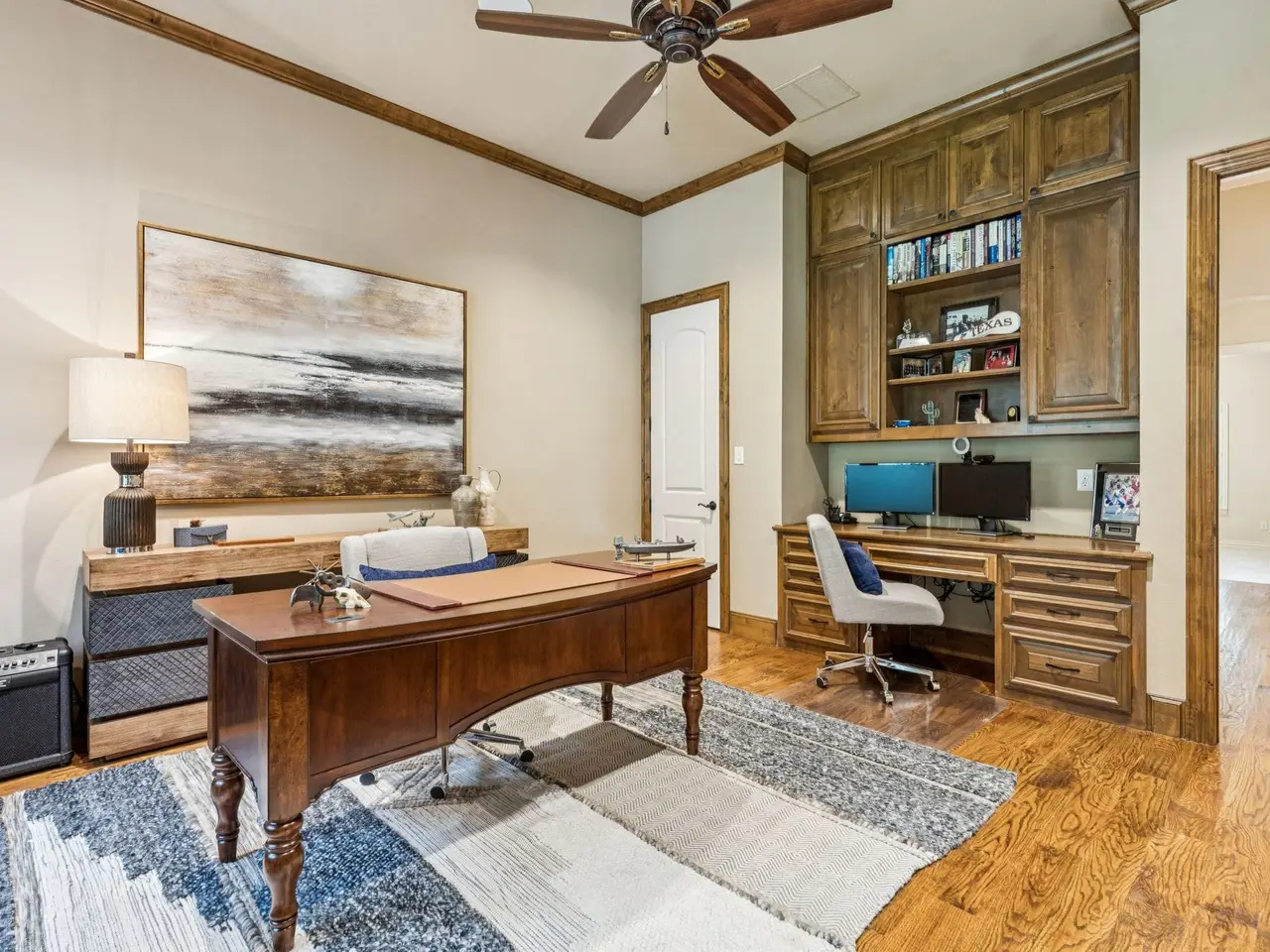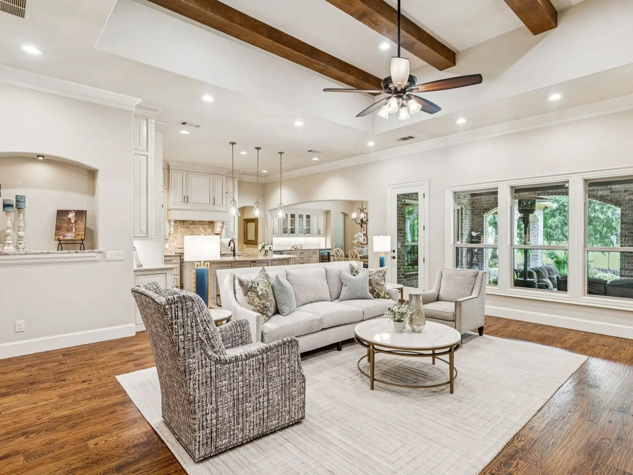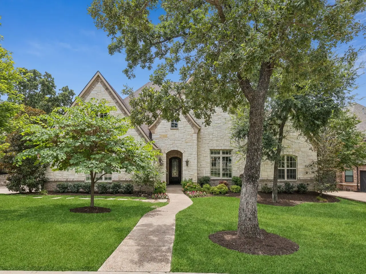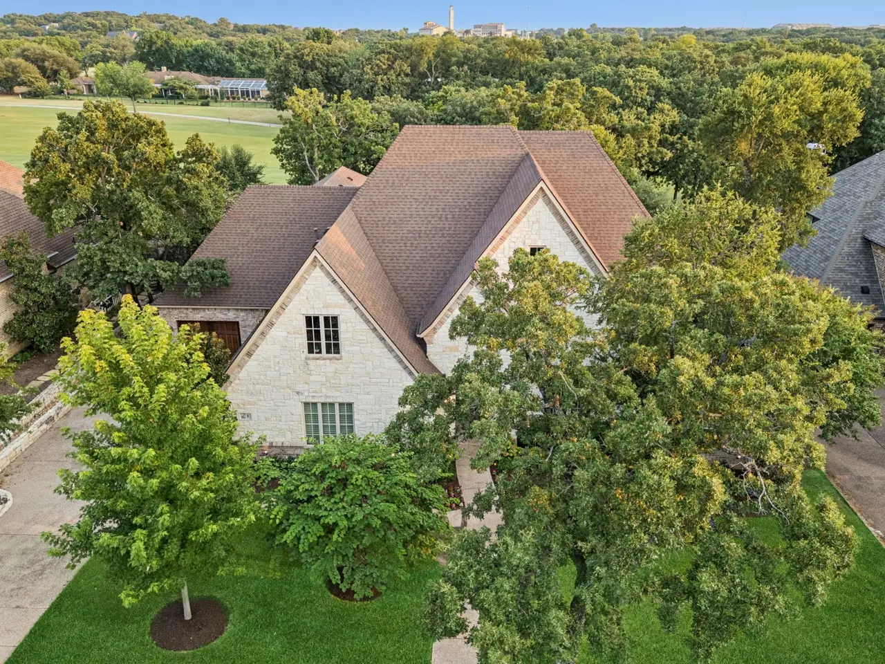 Of 201 homes in exclusive guard-gated Hogans Glen of Trophy Club, there are only 2 custom built, one-story homes located on the golf course in The Estates of Hogan's Glen. Beautiful 6 Stephens Court is one of those homes and is the ONLY HOME in Trophy Club built by renowned Southlake builder, Pat Gray of V. Patrick Gray Custom Homes. Sitting on an expansive golf course lot the Hogan #2, the unique John Bolton designed home, is also in a cul de sac on Stephens Court offering privacy and no through traffic. Two spacious patios are surrounded by towering oak trees and a beautifully landscaped backyard - the morning porch and evening porch. Both offer stunning golf course views, an outdoor cooking area with stainless grill, green egg, wood burning fireplace and remote-controlled privacy screens for bug free living and entertaining. This one-story home has it all - light and bright throughout offering an expansive open floor plan with split 3 bedrooms and ensuite baths. A private office may be a 4th bedroom, the powder bath is tucked into the spacious mud room while the great room, including the main living, kitchen and dining rooms, all overlook the backyard and golf course. Buyers will love the expansive 14 ft beamed ceilings in the main living room anchored by a stone fireplace and the fabulous gourmet kitchen. The expansive kitchen offers commercial grade appliances, a large center island, a hidden service pantry and custom walk-in pantry. Other details include wide plank hardwood floors, transitional wood trim details, custom storage options in the office, a spacious split 3-car garage with side court and a fully decked attic above garage with storage lift. The primary closet is a safe room capable of withstanding f3+ tornados with reinforced doors, deadbolts and a panic button. There are no lots left in Hogan's Glen, the last 2 lots sold over $400,000. An easy drive to DFW Airport, world-class dining and shopping in Southlake, Dallas and Fort Worth. Welcome Home!