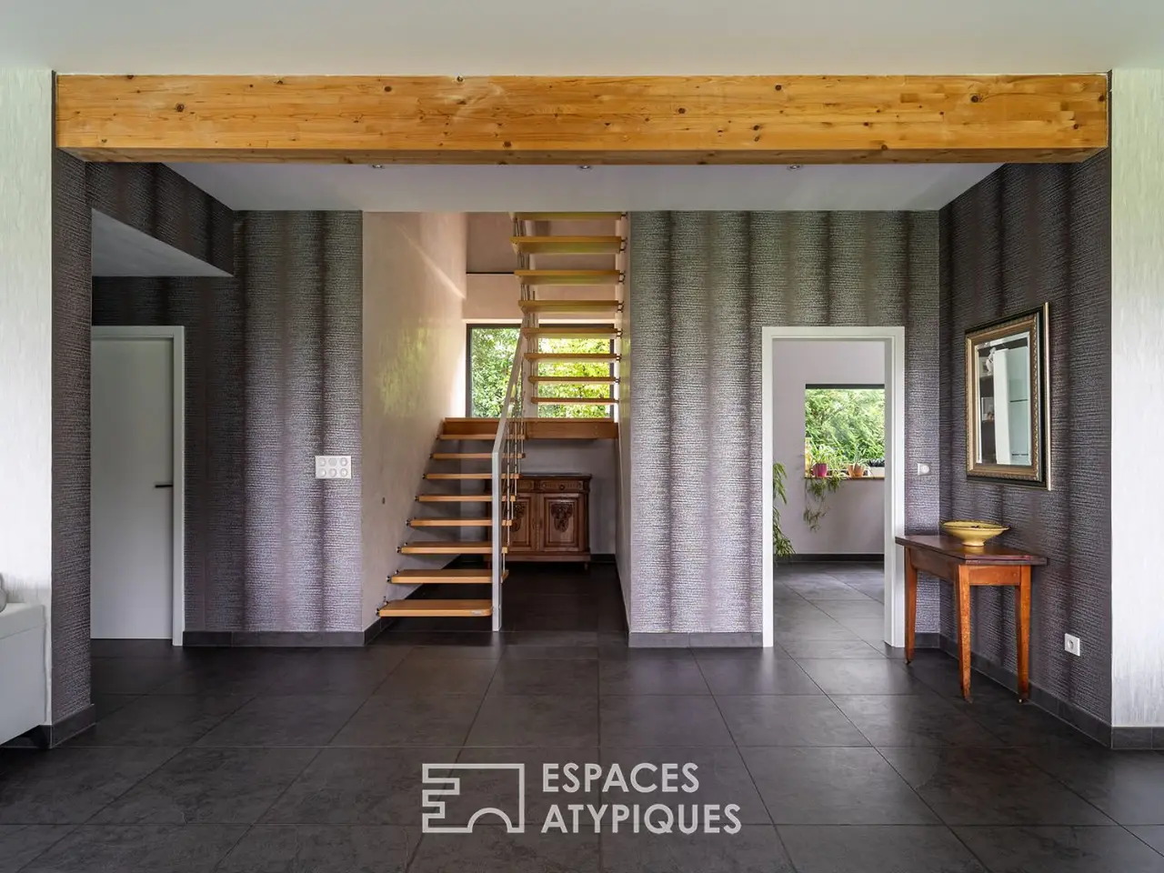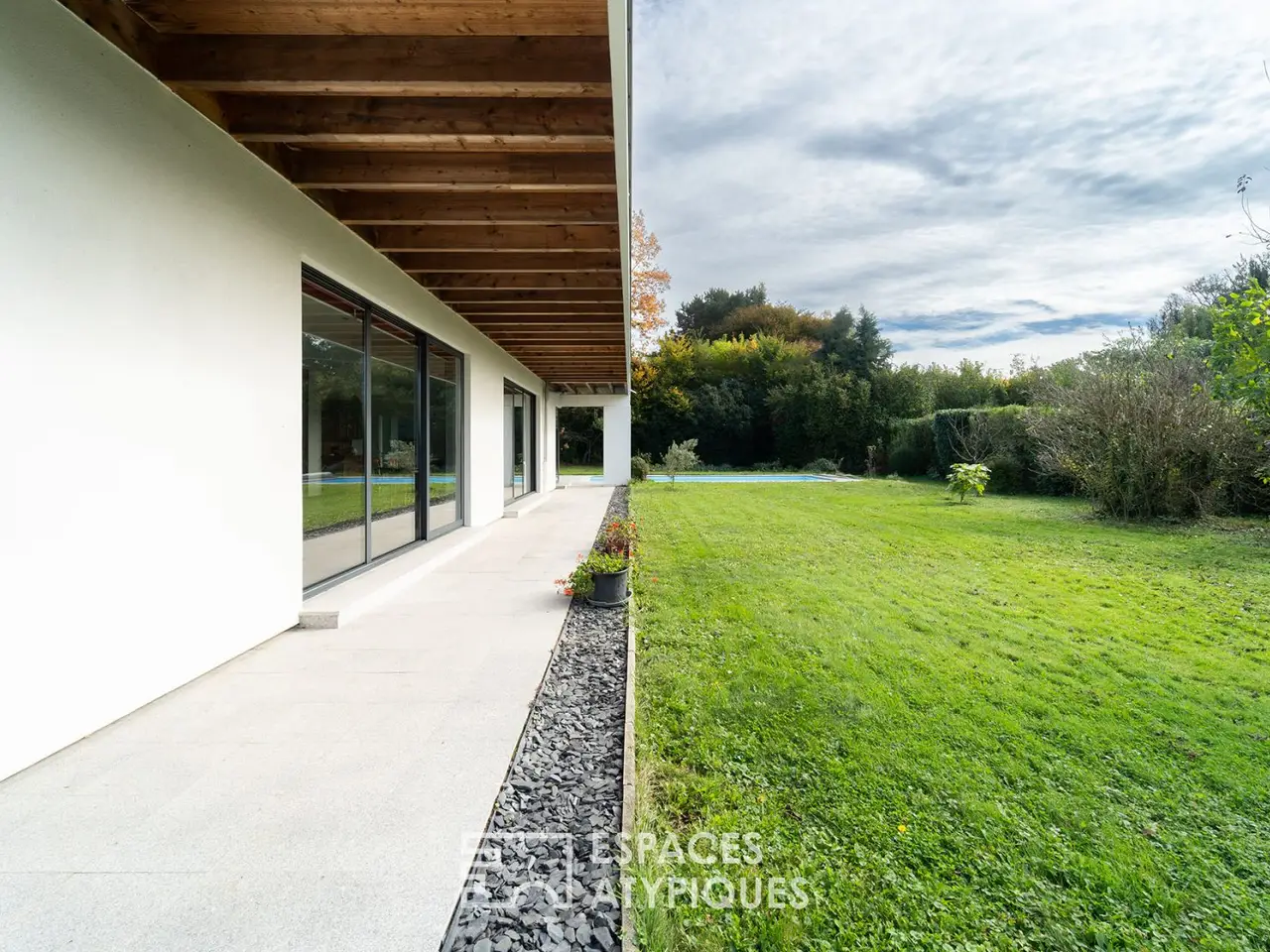 Situated in a peaceful setting just 25 minutes from Strasbourg, this sleek architect-designed villa spans 250 m2. Built in 2011, it sits in 15.7 acres of wooded grounds with a 10 x 4.5 m heated swimming pool. Designed to offer maximum light, it boasts generous, functional living space for a comfortable family lifestyle. The entrance hall sets the tone for the extraordinary volumes to follow. With 3 m high ceilings, the 60 m2 living room offers an exceptional sense of space and depth. It comprises a lounge and dining room warmed by a wood-burning stove and bathed in light thanks to more than 9 metres of picture windows overlooking the lush garden. Adjoining the dining room is a large, bright kitchen/diner with a central island and granite worktop, offering a pleasant view of the garden and swimming pool, as well as direct access to the terrace. A study opening onto the garden, a shower room and a utility room complete the ground floor. The upper floor is given over to sleeping quarters, with a shower room, a vast bathroom with sauna and four generous bedrooms, one with an adjoining made-to-measure dressing room. A double garage completes the features of this property, which also benefits from high-performance insulation, ensuring comfort and energy savings for its future owners. Its sophisticated lines, functional design and above all its vast green setting in a privileged area make this a particularly rare property that will delight lovers of contemporary purity. REF. 1404 Additional information * 7 rooms * 5 bedrooms * 3 bathrooms * Outdoor space : 1571 SQM * Property tax : 1 554 €