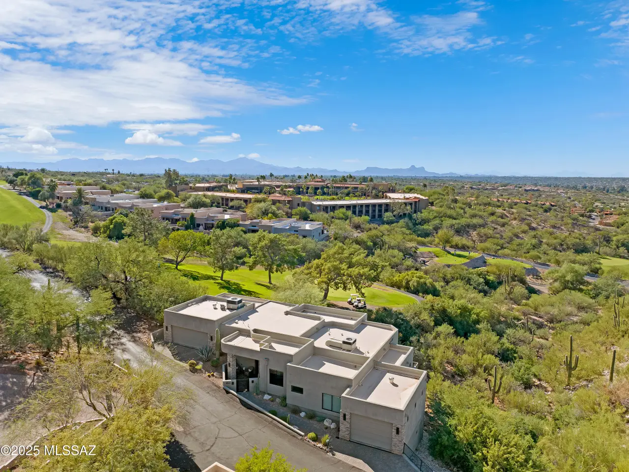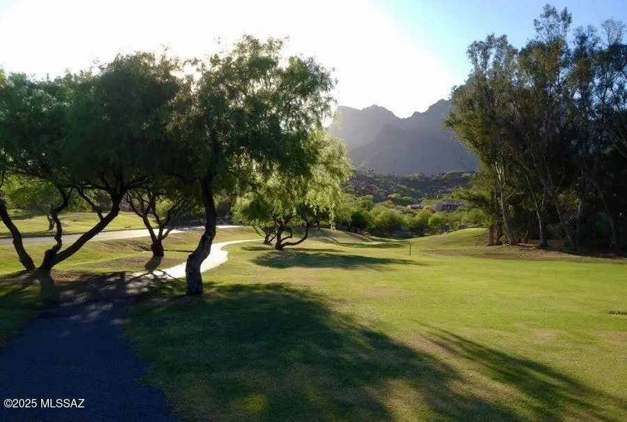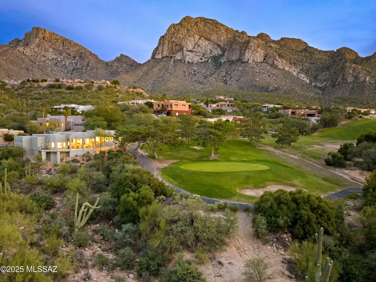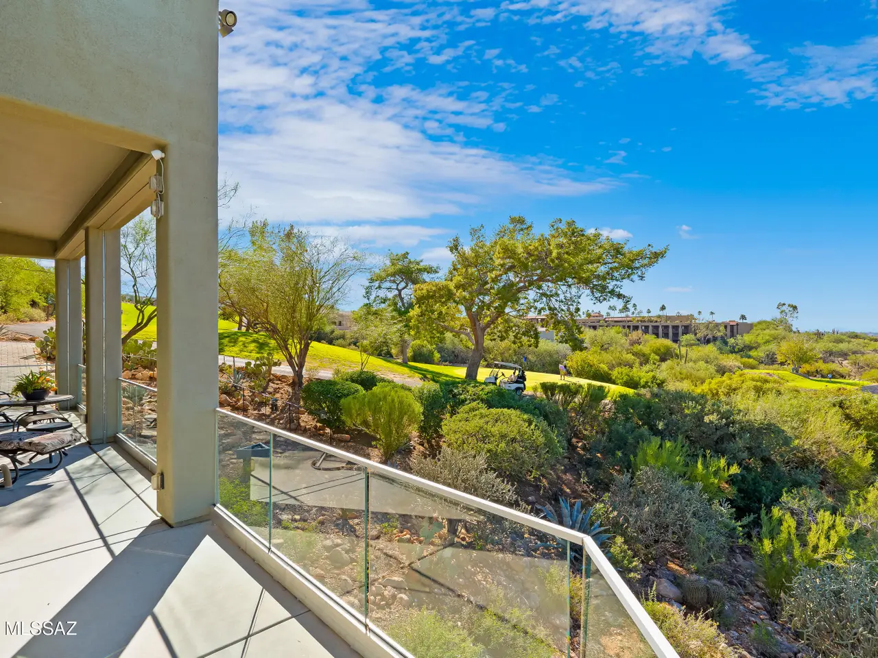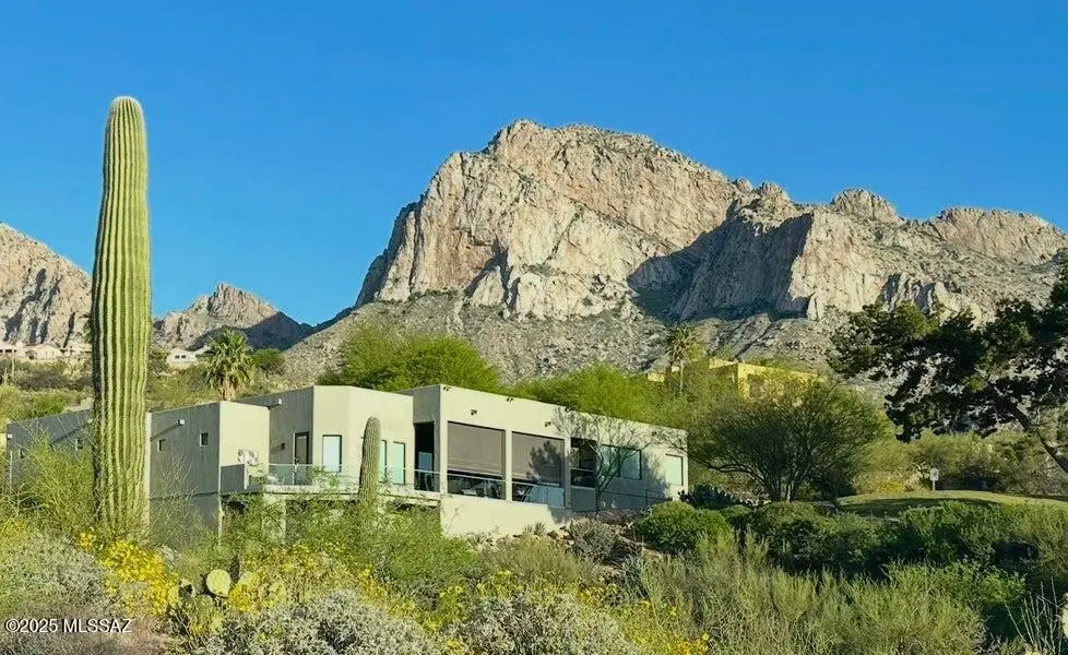 Gaze west from this 2018 rebuilt home perched along 7th & 8th fairways of Pusch Ridge Golf Course where sunsets unfold daily across a protected five-acre multi-saguaro wash. Enjoy a variety of birds & postcard view from private deck w/no extra yard to maintain. With no HOA & no homes pressed up on either side, this home has an uncommon sense of breathing room. Sleek, modern, thoughtful upgrades & broad patio spaces that feel like estate living w/o the upkeep. Relax in effortless resort-style living w/direct 5 minute golf-cart path access to the El Conquistador Resort pool, cafe, restaurants & bar. Grab morning coffee or wander back for dinner or cocktail in the evening. Step inside to light-filled open spaces w/soaring ceilings, sophisticated finishes & versatile plan that shifts easily..