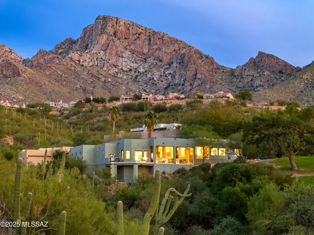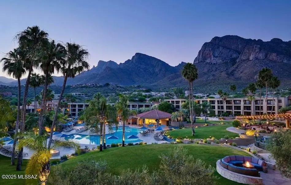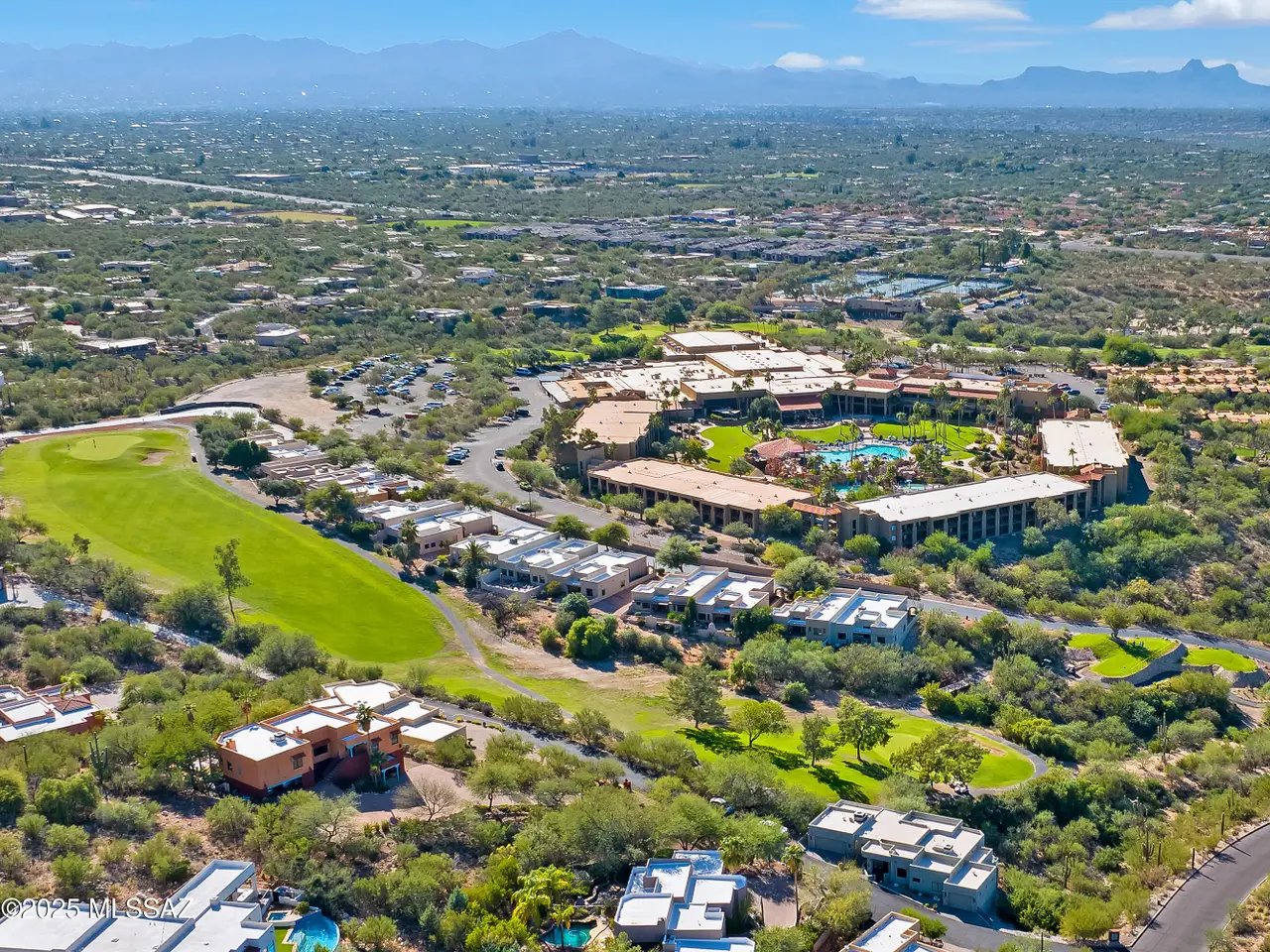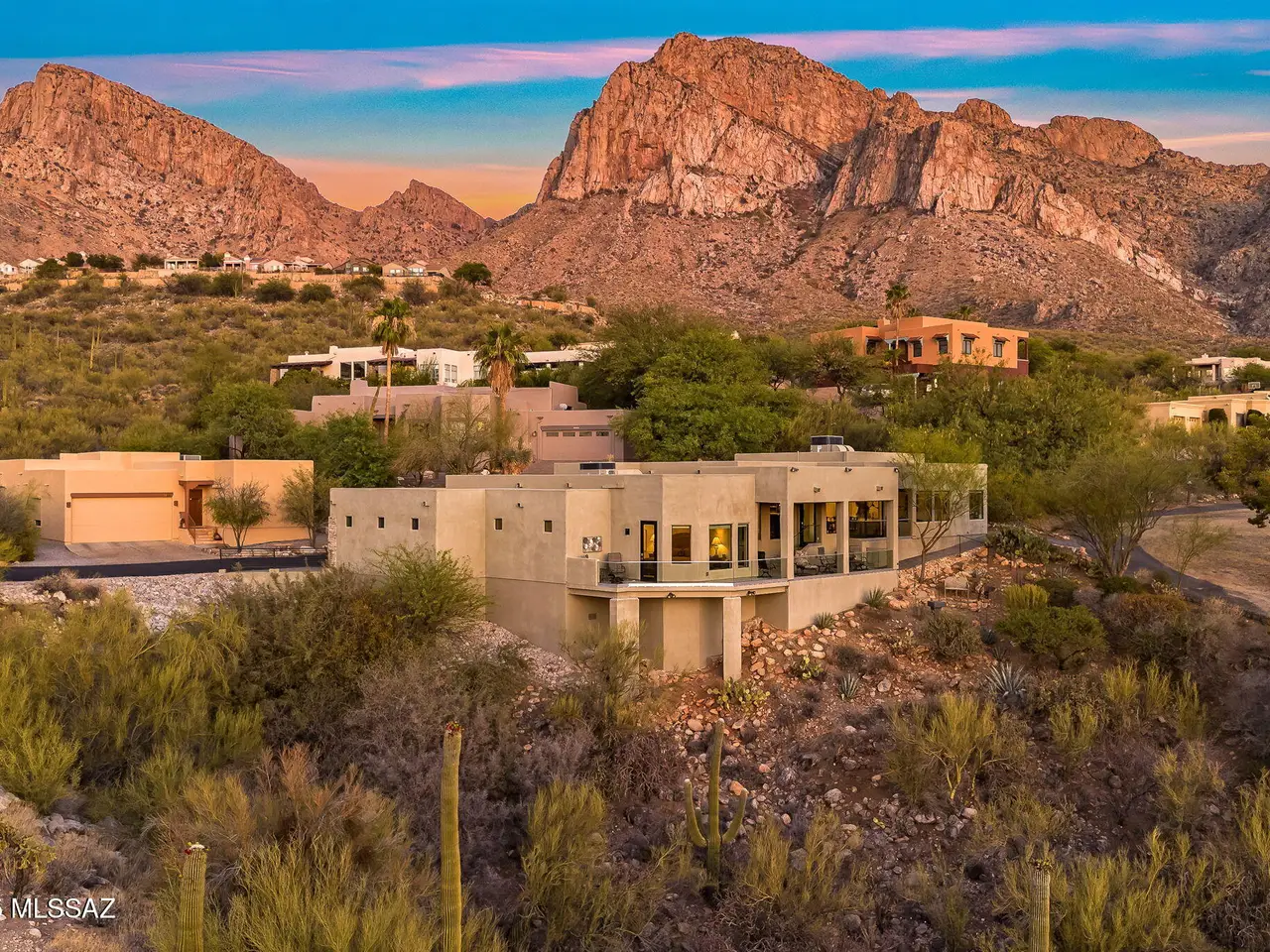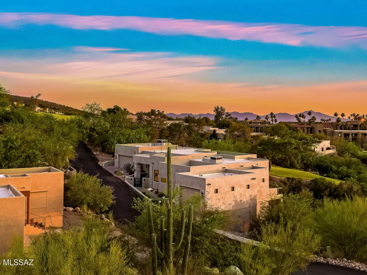 Gaze west from this 2018 rebuilt home perched along 7th & 8th fairways of Pusch Ridge Golf Course where sunsets unfold daily across a protected five-acre multi-saguaro wash. Enjoy a variety of birds & postcard view from private deck w/no extra yard to maintain. With no HOA & no homes pressed up on either side, this home has an uncommon sense of breathing room. Sleek, modern, thoughtful upgrades & broad patio spaces that feel like estate living w/o the upkeep. Relax in effortless resort-style living w/direct 5 minute golf-cart path access to the El Conquistador Resort pool, cafe, restaurants & bar. Grab morning coffee or wander back for dinner or cocktail in the evening. Step inside to light-filled open spaces w/soaring ceilings, sophisticated finishes & versatile plan that shifts easily..