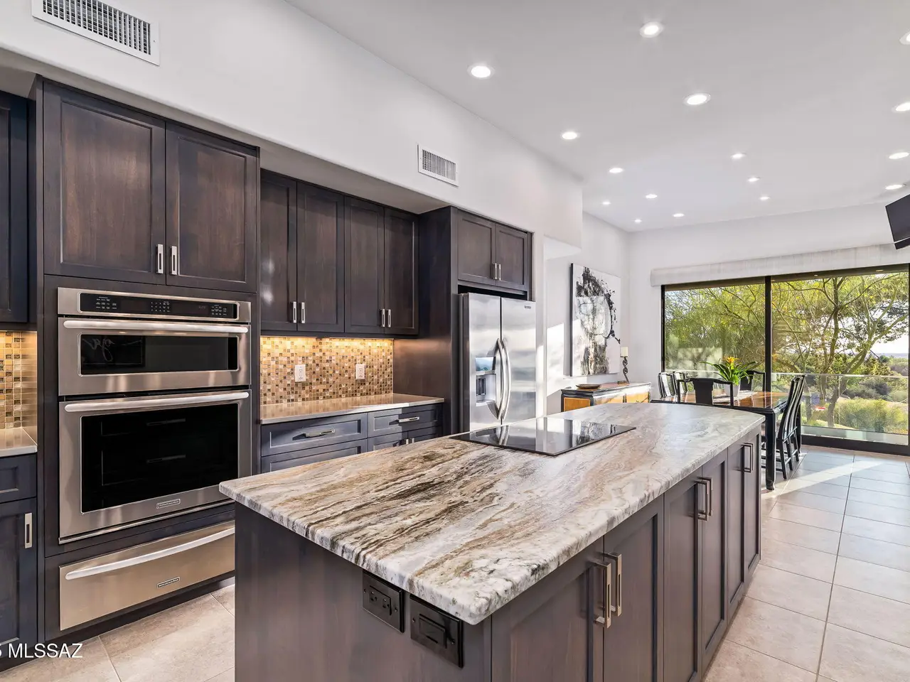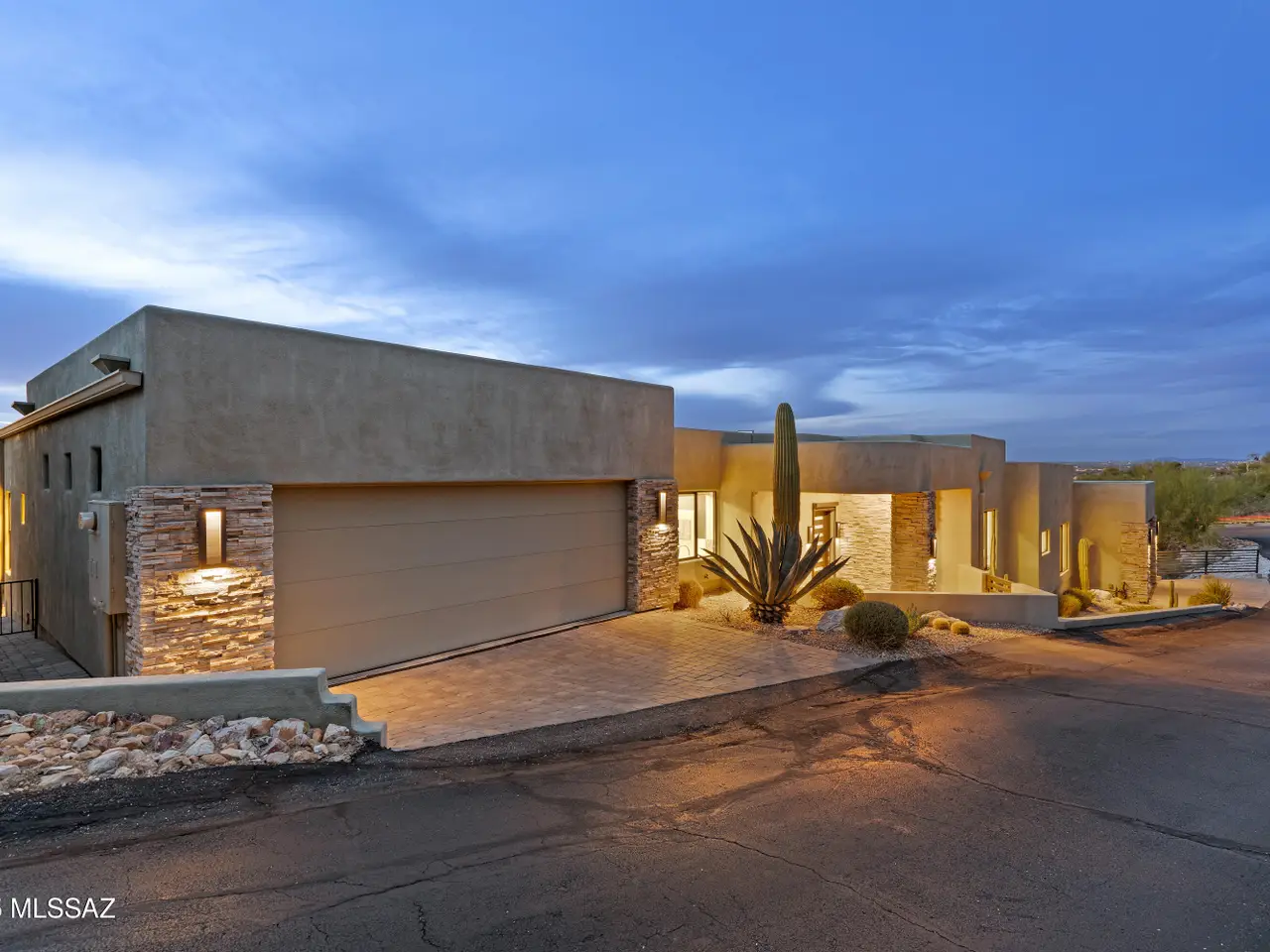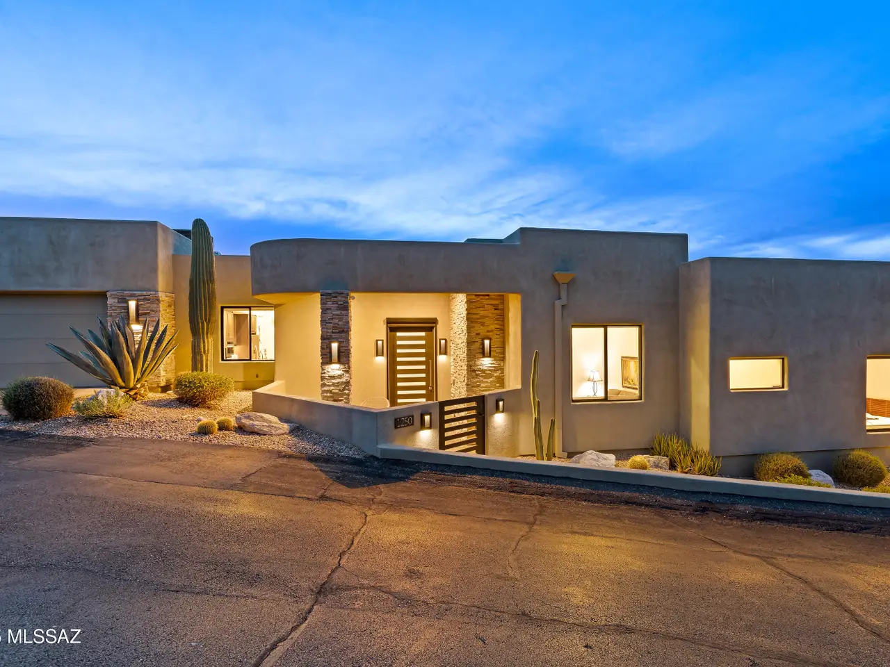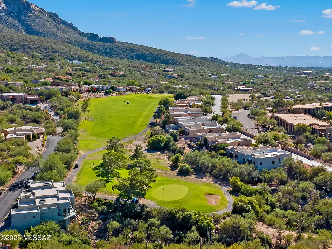Gaze west from this 2018 rebuilt home perched along 7th & 8th fairways of Pusch Ridge Golf Course where sunsets unfold daily across a protected five-acre multi-saguaro wash. Enjoy a variety of birds & postcard view from private deck w/no extra yard to maintain. With no HOA & no homes pressed up on either side, this home has an uncommon sense of breathing room. Sleek, modern, thoughtful upgrades & broad patio spaces that feel like estate living w/o the upkeep. Relax in effortless resort-style living w/direct 5 minute golf-cart path access to the El Conquistador Resort pool, cafe, restaurants & bar. Grab morning coffee or wander back for dinner or cocktail in the evening. Step inside to light-filled open spaces w/soaring ceilings, sophisticated finishes & versatile plan that shifts easily..