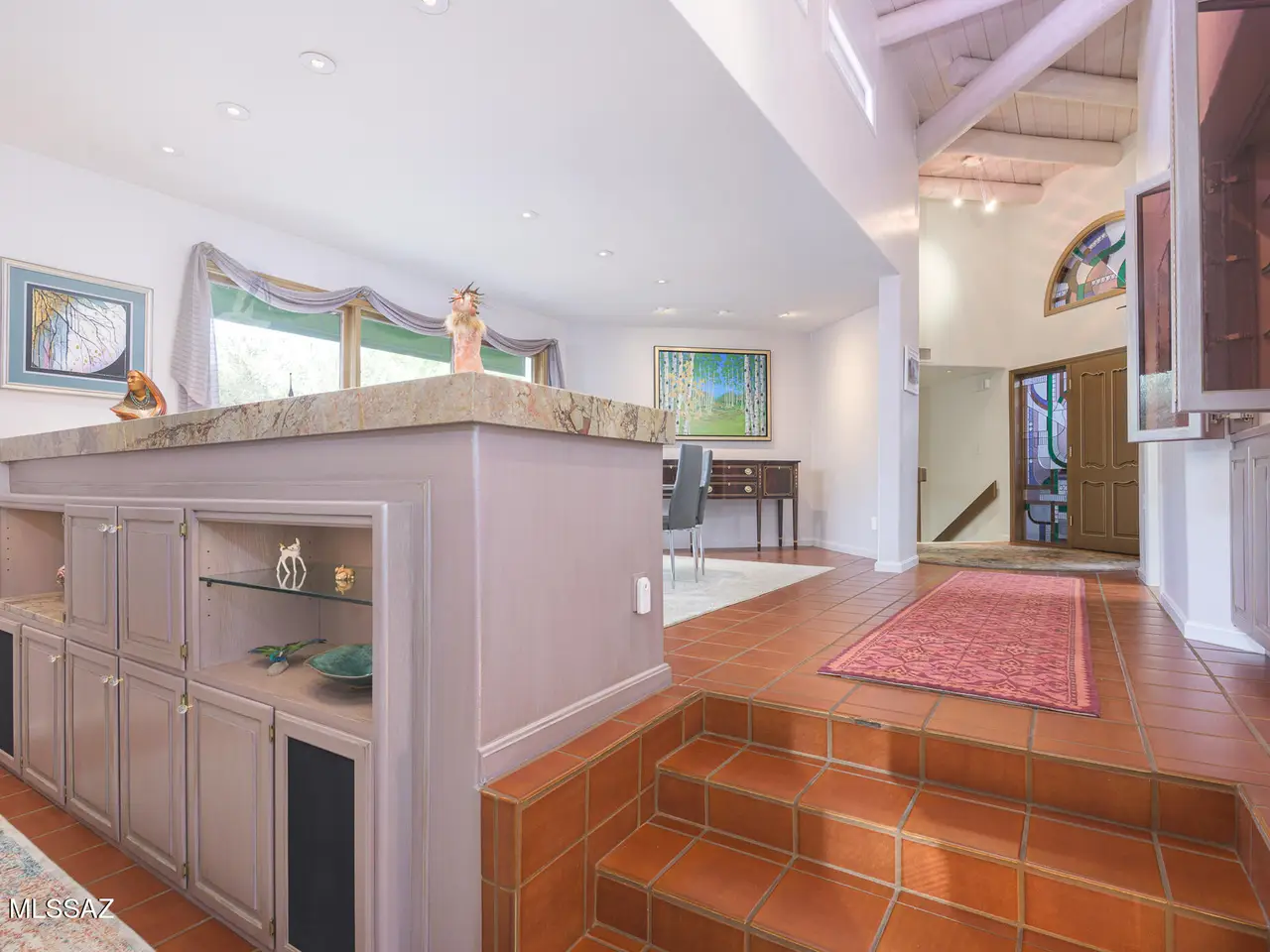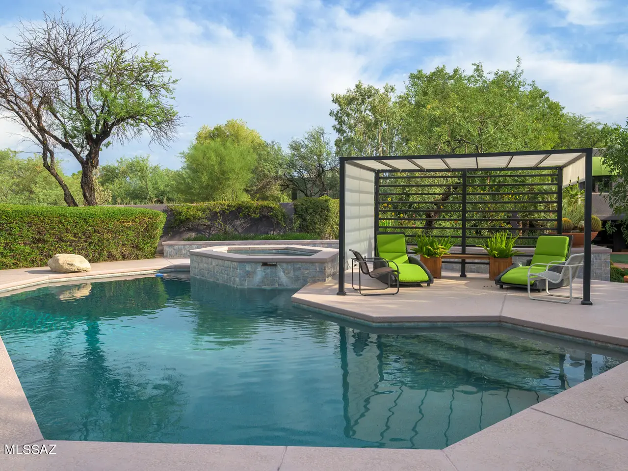 Experience a private sanctuary of serenity in this Campisano contemporary, just a short walk from Canyon Ranch. Enjoy beautiful Catalina Mountain views from the resort-style backyard with pool, spa, fireplace, water feature and magnificent landscaping. Home features 3602 sq ft with 4 Bedrooms, 4 Bathrooms, Den, Formal Dining Area w/ buffet and wet bar. Lower level Family Room anchored by built in bar, tv area and full bath with shower. Split floorplan allows Primary Suite privacy with Den, plus expansive bathroom with separate vanities, soaking tub, large closet as well as indoor and outdoor shower. Kitchen includes breakfast nook, walk in pantry, double ovens, electric cooktop, granite counter and access to separate patio. 14kW solar system. This rare contemporary retreat must be seen!