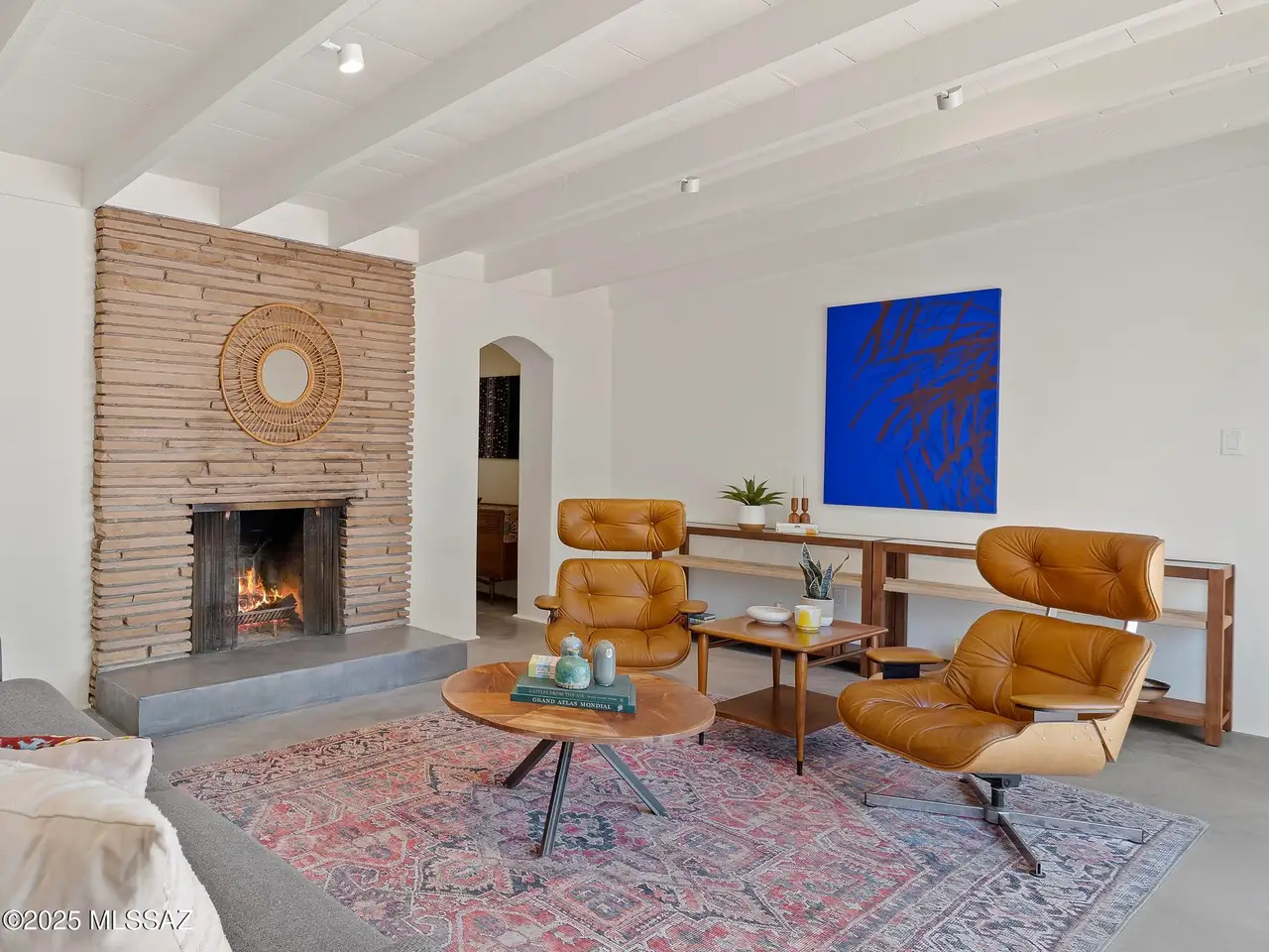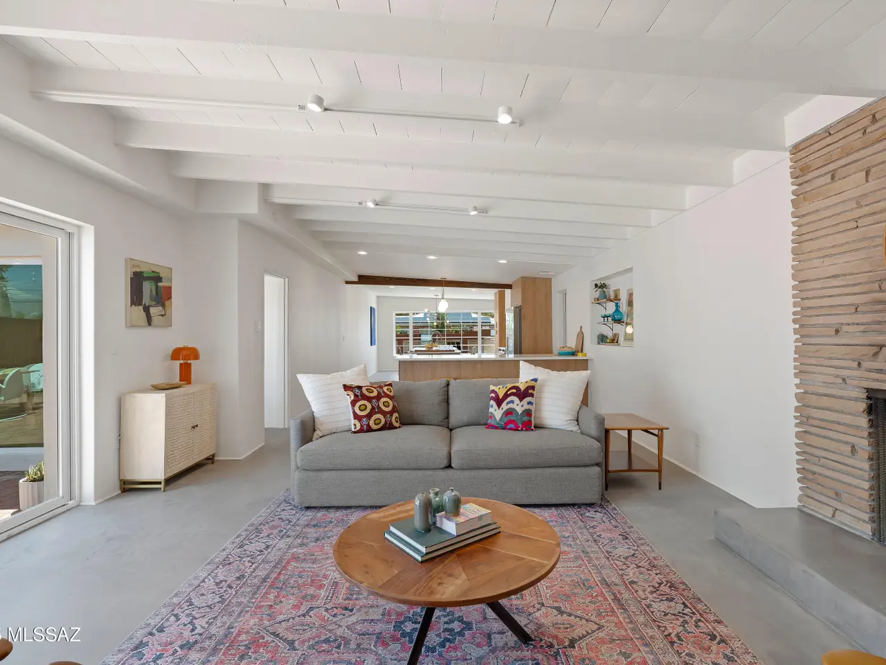 This stunningly reimagined home in coveted Catalina Vista exhibits a beautiful balance of its historic architectural roots and the modern amenities. Each space is infused with era-sensitive materials and functional upgrades. With great care the current owners have replaced systems and refurbished character-rich details. New roof, HVAC units, water heaters, lighting, landscaping, windows, insulation, concrete floors, premium smooth stucco, and both interior and exterior paint to name just a few. The main home centers around a new kitchen with high-end appliances, honed quartz counters, seating for eight, and a spacious pantry/laundry room adjacent. Wood beamed ceilings, expansive natural light through the many sliding glass doors, and period lighting exude the Mid-Century modern aesthetic classic to the 1950's era of this home. The primary suite has two walk-in closets, a private patio and spa retreat style bathroom with a dual sinks and a private commode. Three additional bedrooms and a den/office complete the main home. Across the brick patio or conveniently through the foyer the uncommonly spacious guest quarters feature one bedroom, a walk-in closet and kitchenette in the living room. All this just a short distance to the University of Arizona, Banner Hospital, Tahoe Park, and the Arizona Inn.