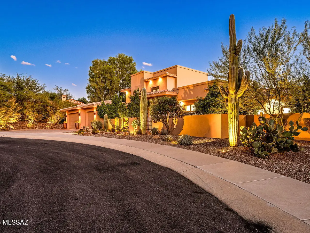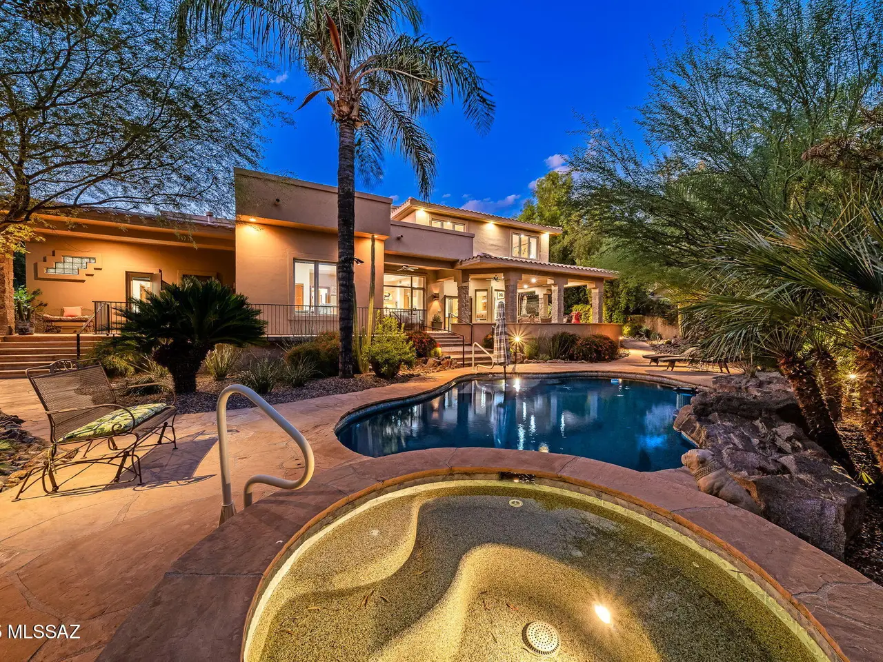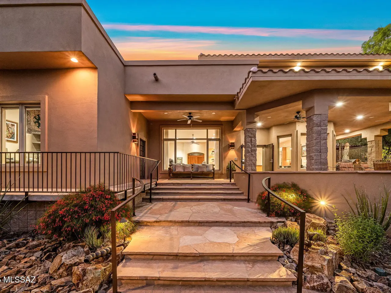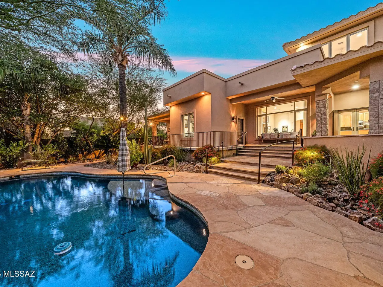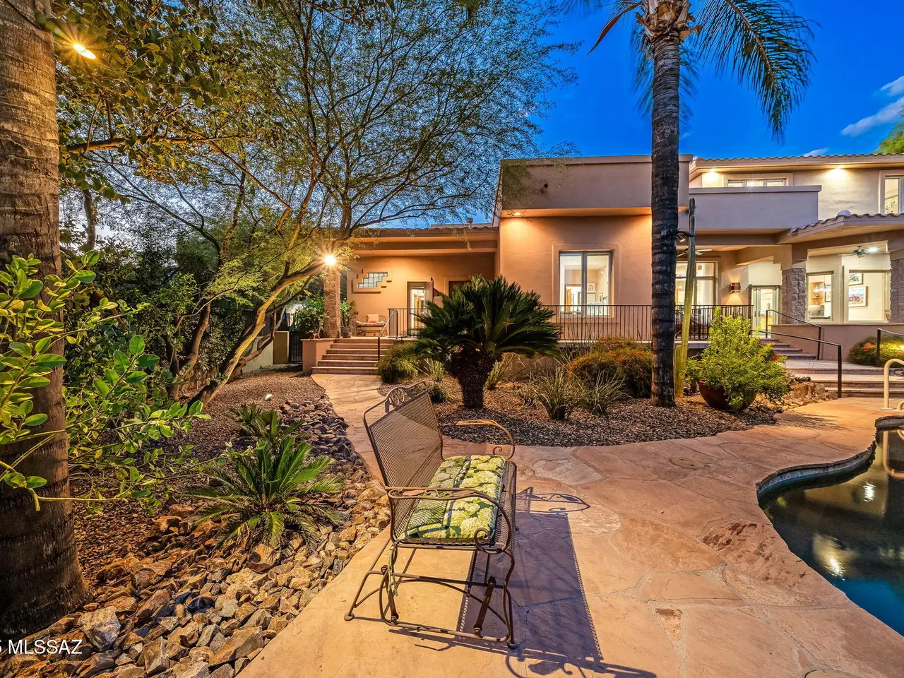 Spectacular remodeled Ventana Country Club Estates home boasts 5 bed, 4 bath + office/den with highest quality upgrades & incredible grounds designed by renowned landscape architect John Stropko (New Desert Gallery). Luxurious 4,947 sq.ft. home is a masterpiece of design & craftsmanship. Enter through the custom flagstone courtyard you'll be greeted by lush vegetation & exquisite custom metal fencing, creating a serene ambiance with multiple seating areas & bespoke stonework. Step through oversized entry into foyer that introduces soaring ceilings, a spacious living room & an elegant dining room all adorned with custom lighting. Chef's kitchen is perfection, featuring expansive granite counter space, rich wood cabinetry, double ovens, gas range, & sleek stainless steel appliances.See MORE