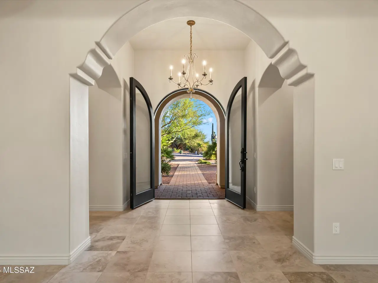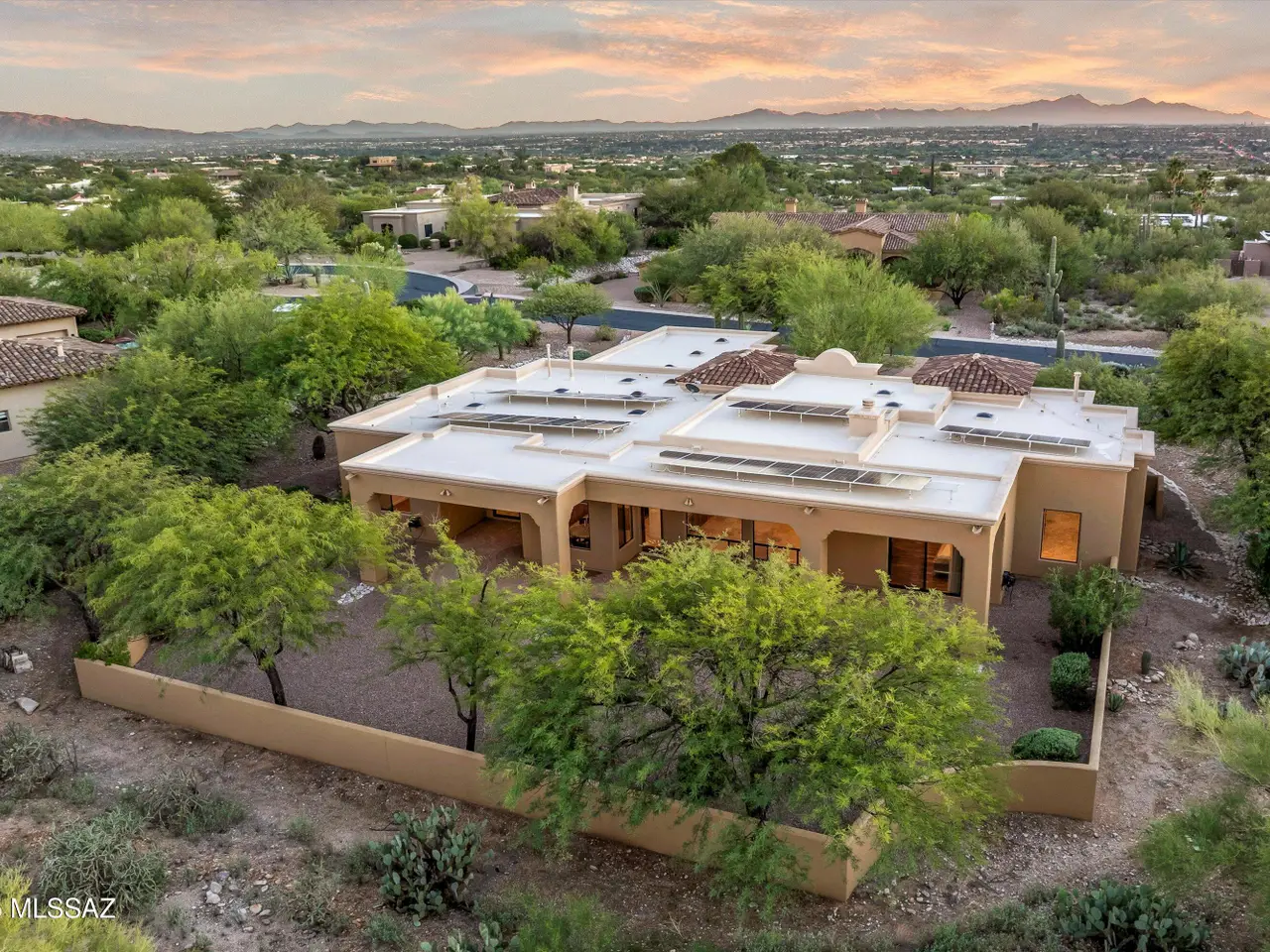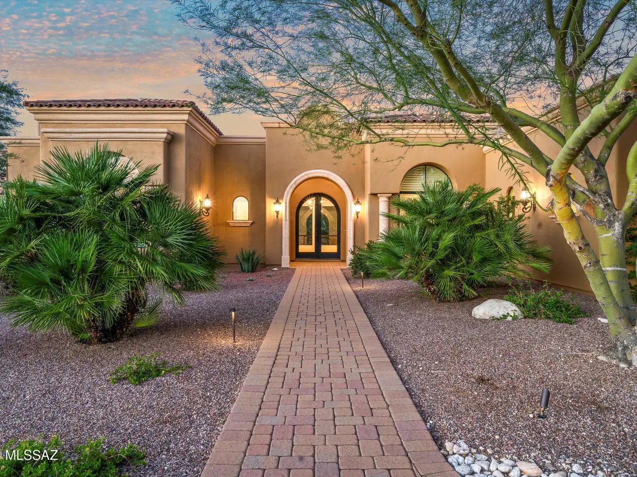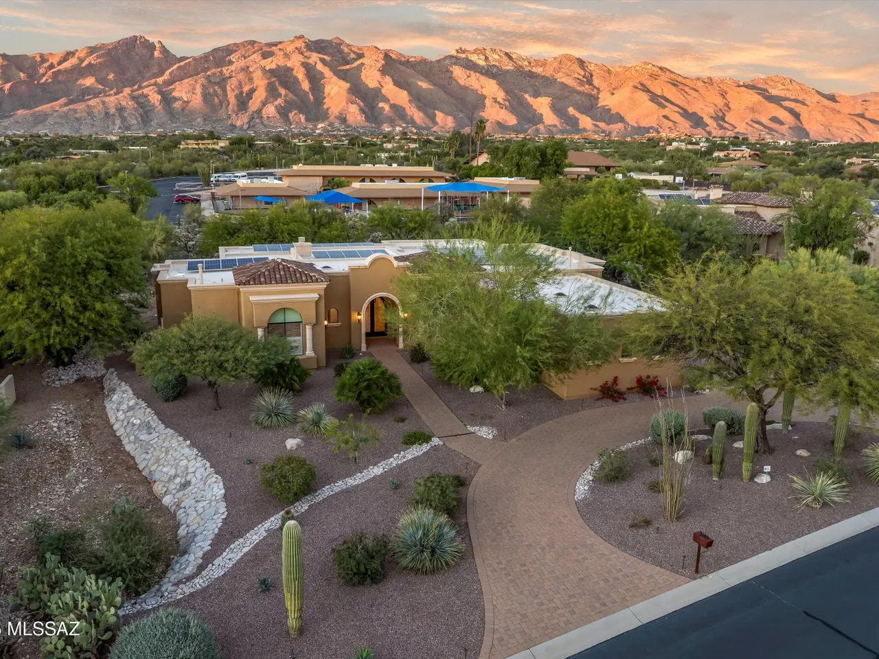 Nestled in the exclusive gated enclave of Villa Toscana, this one-story residence features a gourmet kitchen equipped with top-of-the-line Wolf and Sub Zero appliances, perfect for culinary enthusiasts. The sensational Master Suite boasts luxurious marble finishes and a spacious walk-in closet. Enjoy energy efficiency with owned solar panels, enhancing your lifestyle while reducing utility costs. The home is adorned with travertine floors, 8'' doors, granite surfaces, and a stunning circular drive for arriving guests. Experience quiet luxury in this desirable location close to all of the Tucson Foothills amenities.