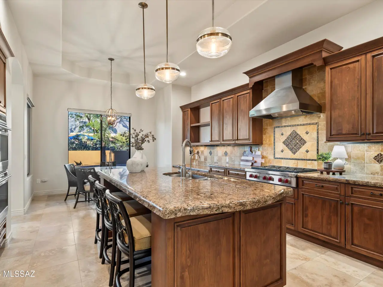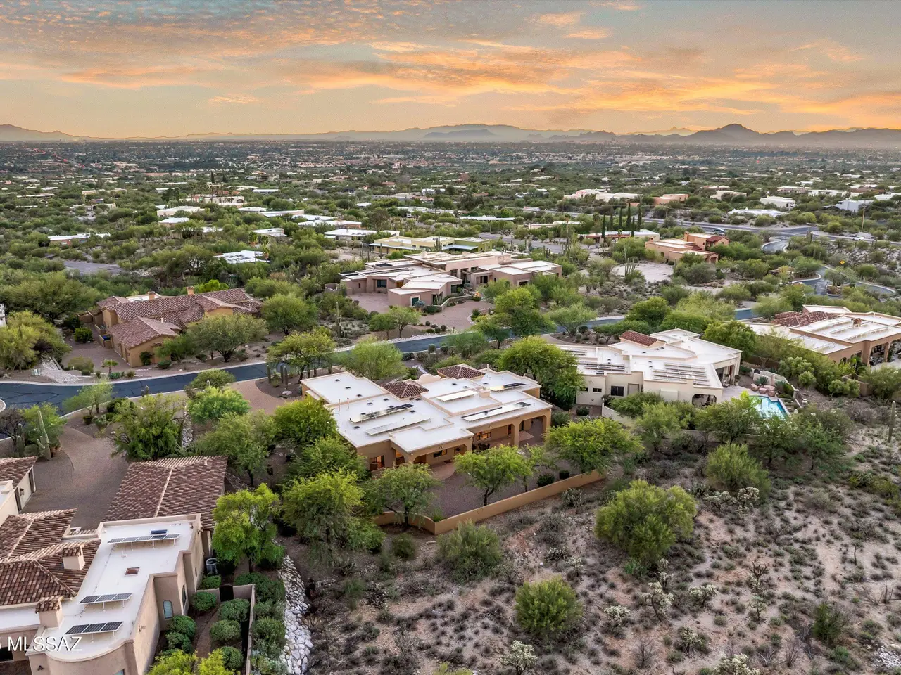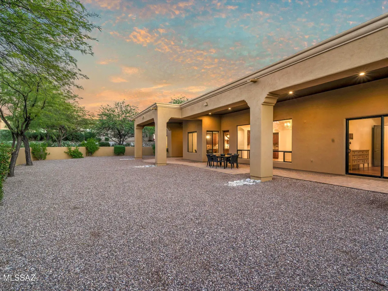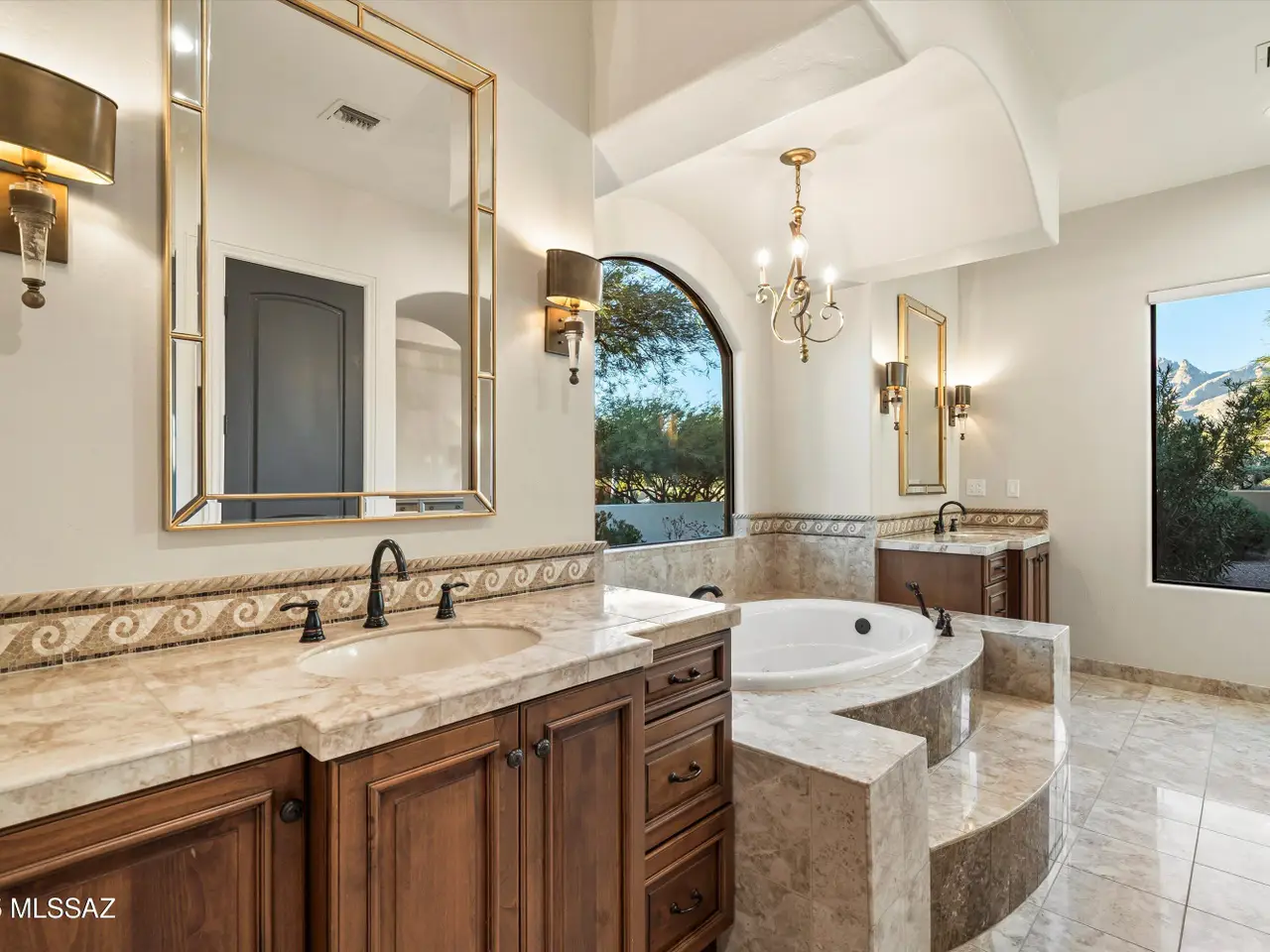Nestled in the exclusive gated enclave of Villa Toscana, this one-story residence features a gourmet kitchen equipped with top-of-the-line Wolf and Sub Zero appliances, perfect for culinary enthusiasts. The sensational Master Suite boasts luxurious marble finishes and a spacious walk-in closet. Enjoy energy efficiency with owned solar panels, enhancing your lifestyle while reducing utility costs. The home is adorned with travertine floors, 8'' doors, granite surfaces, and a stunning circular drive for arriving guests. Experience quiet luxury in this desirable location close to all of the Tucson Foothills amenities.