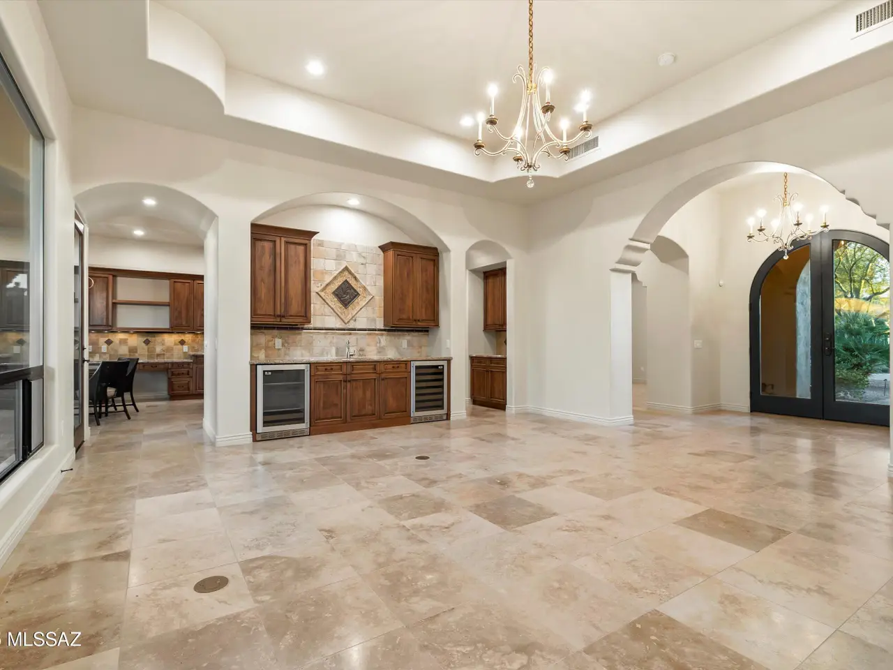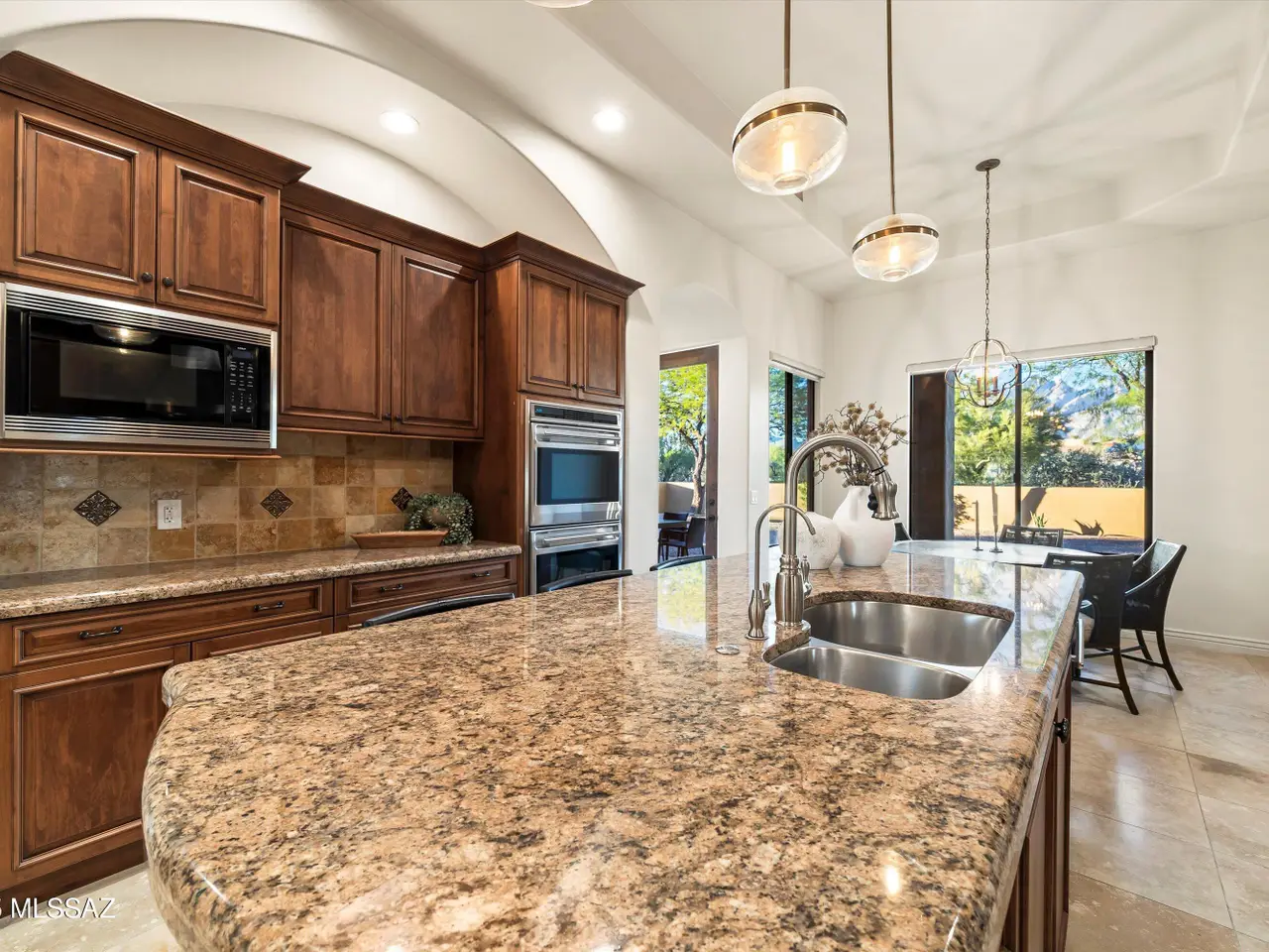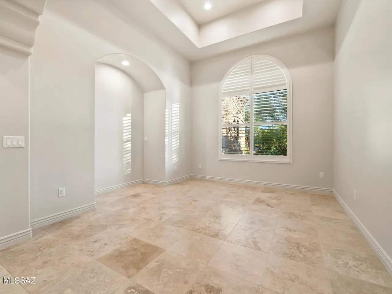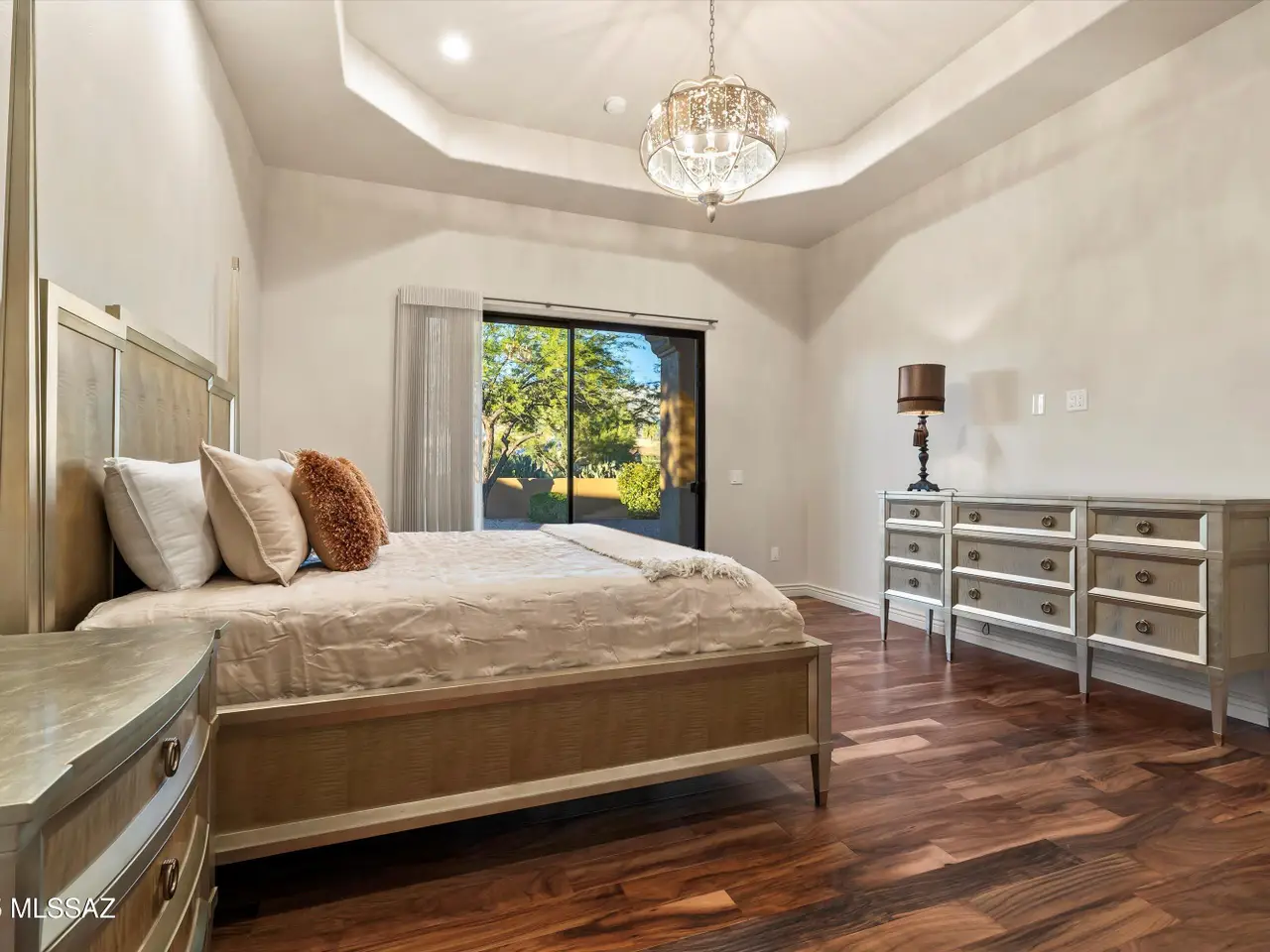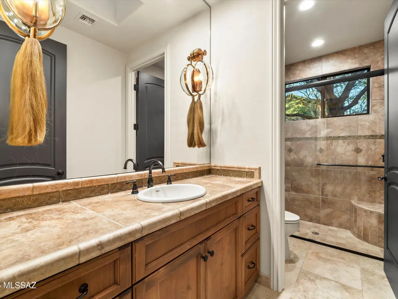 Nestled in the exclusive gated enclave of Villa Toscana, this one-story residence features a gourmet kitchen equipped with top-of-the-line Wolf and Sub Zero appliances, perfect for culinary enthusiasts. The sensational Master Suite boasts luxurious marble finishes and a spacious walk-in closet. Enjoy energy efficiency with owned solar panels, enhancing your lifestyle while reducing utility costs. The home is adorned with travertine floors, 8'' doors, granite surfaces, and a stunning circular drive for arriving guests. Experience quiet luxury in this desirable location close to all of the Tucson Foothills amenities.