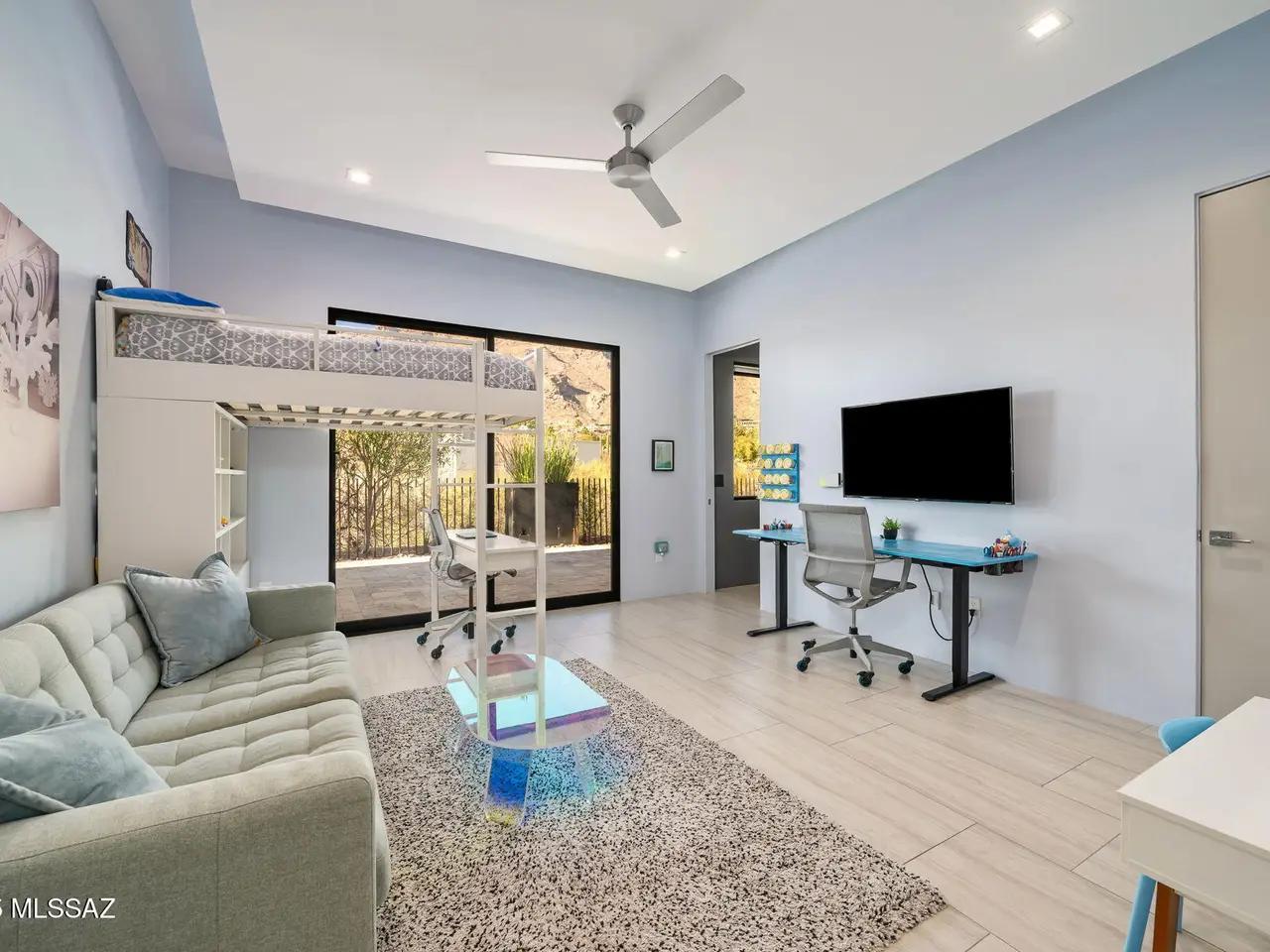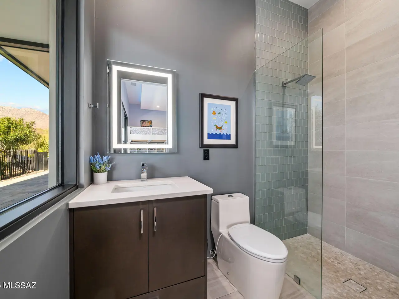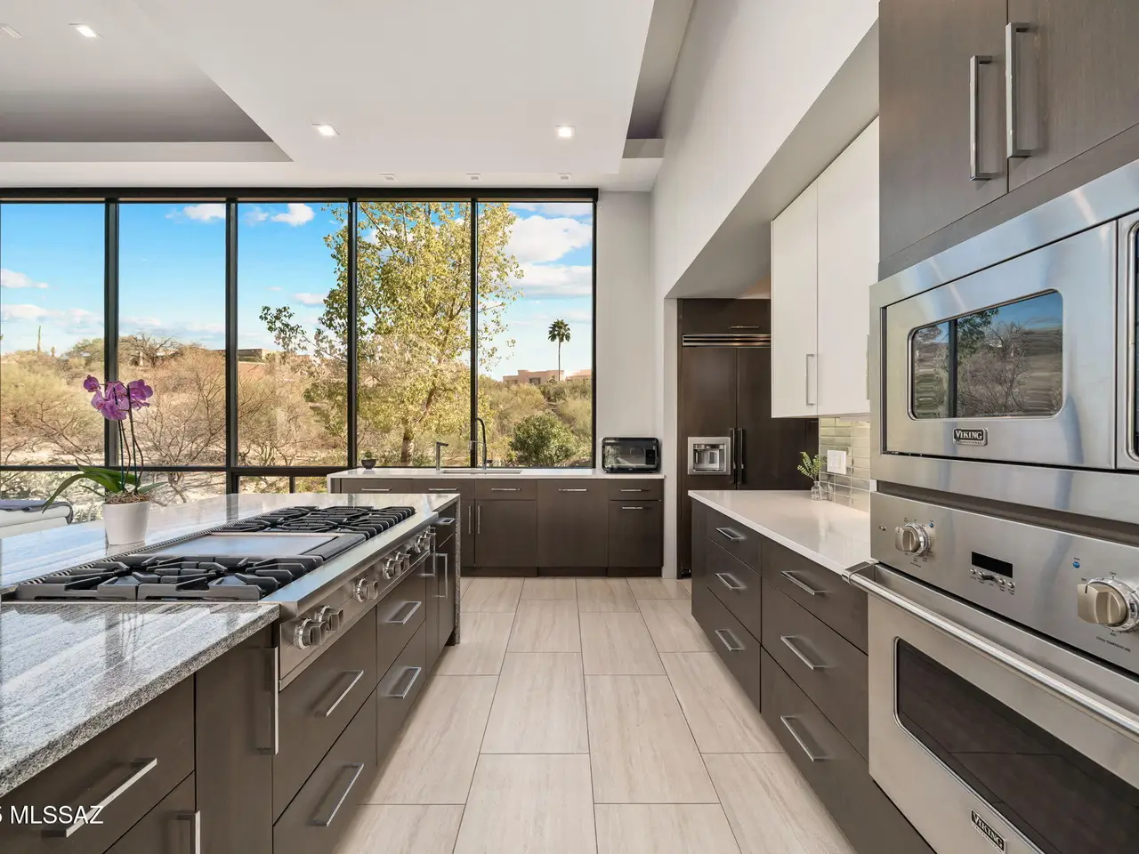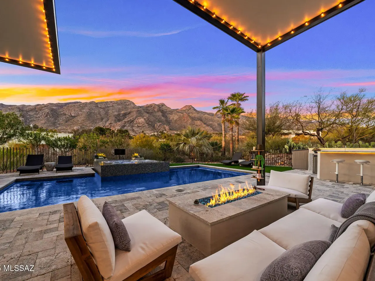 Experience the perfect blend of modern luxury and seamless indoor-outdoor living in this stunning TF Robertson-designed home, situated on 1.17 acres within the prestigious, 24-hour guard-gated Skyline Country Club Estates. Designed to impress, this 3,228 sq. ft. contemporary masterpiece offers four en-suite bedrooms, each featuring tray ceilings and custom lighting. From the moment guests arrive, they'll be captivated by the grand 12 ft-high, 9 ft-wide front door, offering a breathtaking view that extends through to the majestic Catalina Mountains beyond. Exceptional Design for Entertaining - the great room is an entertainer's dream, boasting soaring ceilings and a 12-ft multi-slide glass door that opens to an expansive patio. Here, you'll find a fire table, outdoor kitchen, and a heated pool and spa (built in 2023) with a self-cleaning system, all set against a panoramic Catalina mountain backdrop. A minimalist fence encloses the patio, ensuring unobstructed views while maintaining privacy. Serene Owner's Retreat - wake up to stunning mountain views from the spacious primary suite, which features a walk-in closet with built-ins and direct access to the patio for effortless indoor-outdoor relaxation. Sustainable Luxury & Smart Features - equipped with a 12.75 kW Tesla Solar System and three Powerwall battery backups (40 kW total), this home embraces energy efficiency. The oversized three-car garage includes a Tesla charger, while a whole-house water filtration system ensures optimal water quality. The smart home system connects indoor/outdoor accent lighting, motorized shades, and pool/spa features. Resort-Style Community Amenities - Skyline Country Club Estates offers exclusive access to golf, lighted tennis and pickleball courts, a swimming pool, spa, and a state-of-the-art fitness center (membership required for certain amenities, inquire for more details). Don't miss the opportunity to own this exceptional modern home with unparalleled views and luxury living.