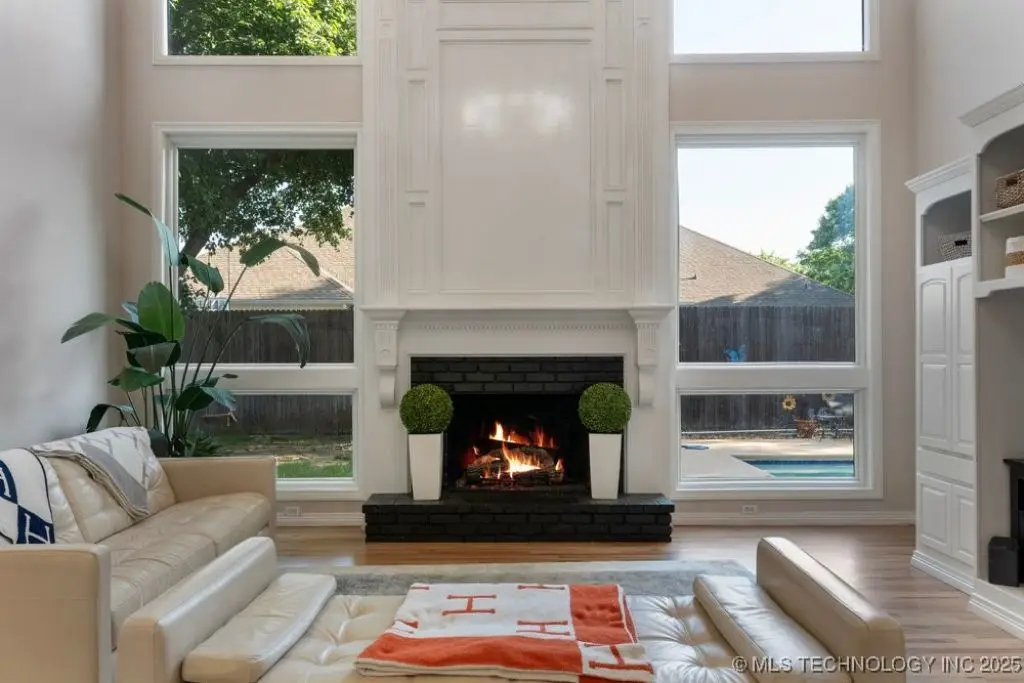 Fireplace with wall of windows