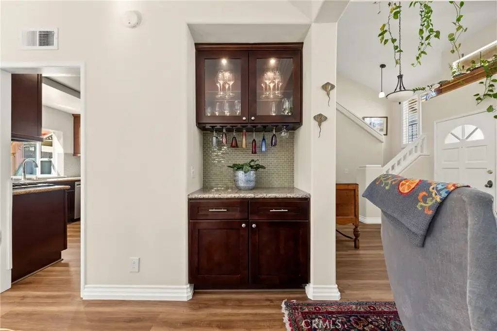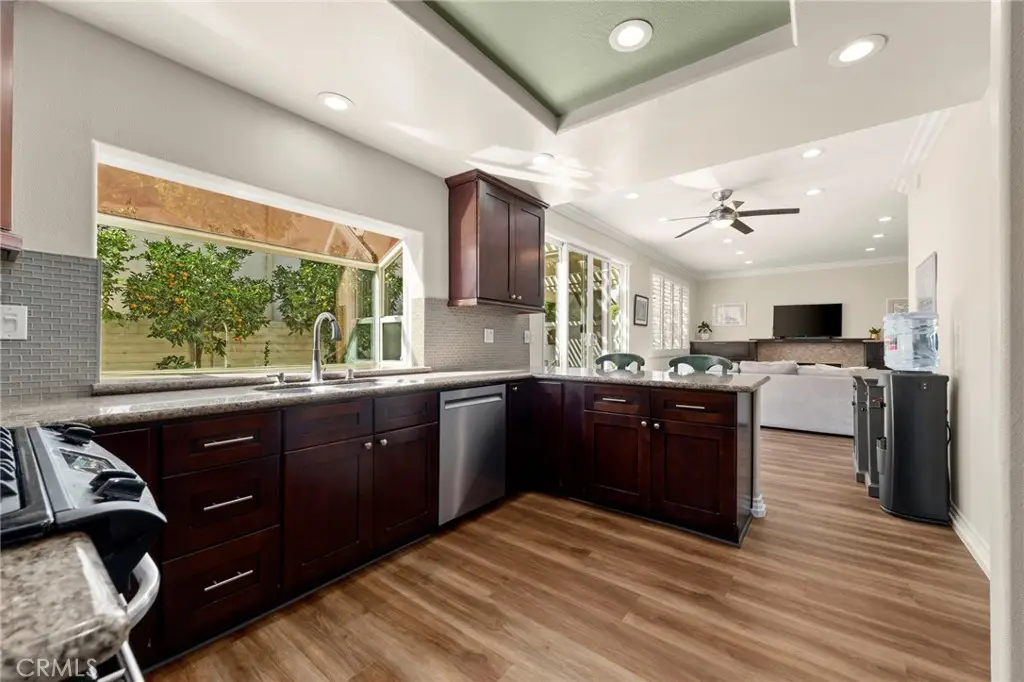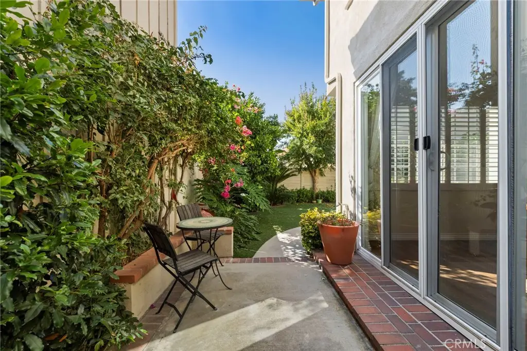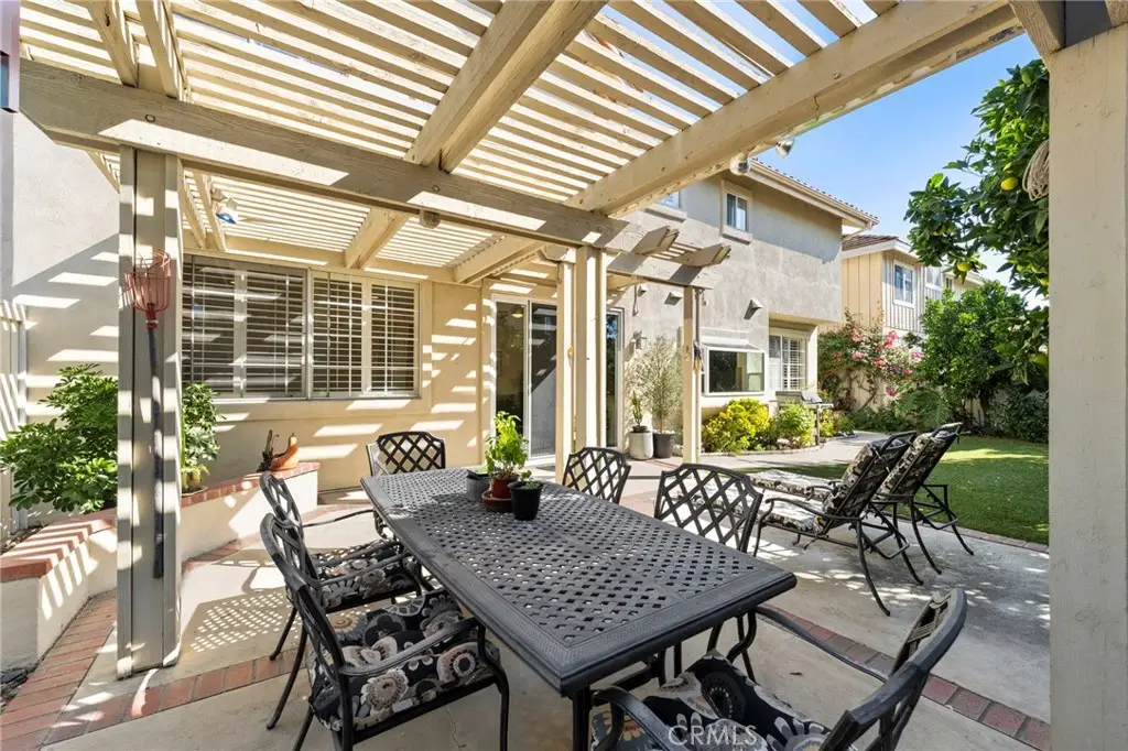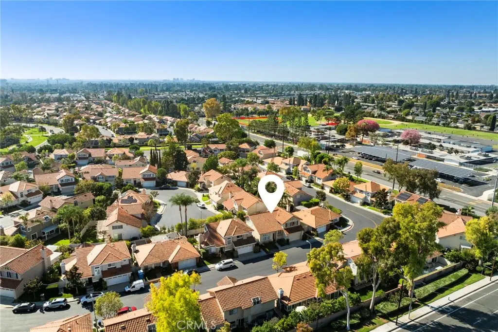 Set in Shadow Brook in the Beckman High School area, this home offers 2,177 sq ft, 4 bedrooms, and 2.5 baths, with freshly painted walls throughout. A dramatic two-story living room flows to a formal dining room. The kitchen features granite countertops, custom wood cabinetry, stainless appliances, a glass-tile backsplash, breakfast bar seating, and a wide picture window to the citrus trees. Sliding glass doors open to a backyard with multiple fruit trees, a concrete patio beneath a pergola, and an artificial-grass lawn. The attached two-car garage includes a dedicated 220V line for EV charging and side/overhead storage. The family room offers a stacked-stone gas fireplace with custom built-ins. Upstairs are four well-sized bedrooms and two full baths, including a vaulted primary suite with a large walk-in closet, dual-sink granite vanity, glass-enclosed walk-in shower, and soaking tub. Additional highlights include plantation shutters, crown molding, recessed lighting, ceiling fans, and an indoor laundry closet with upper cabinets. Shadow Brook provides a low monthly HOA with a pool, spa, and front-lawn maintenance.
